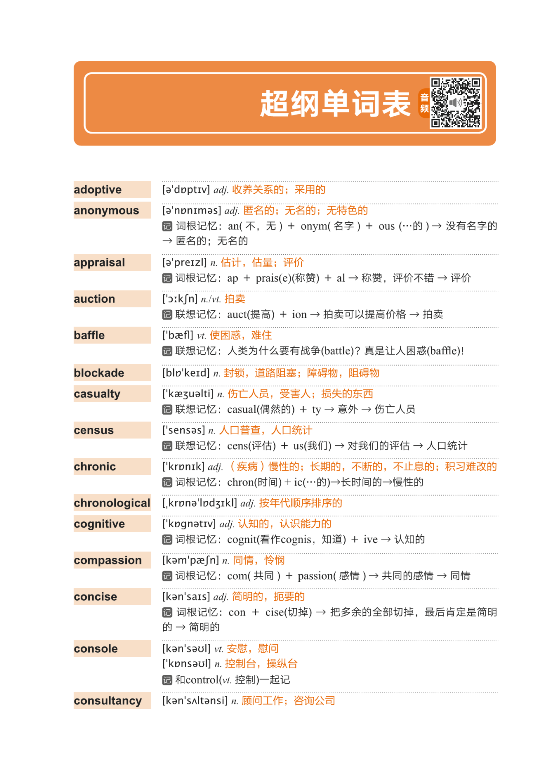 超纲词汇:每年四级考试都会出现一定比例的超纲单词,这些词会影响考生答题的正确率。本书从历年真题中总结了常考的超纲单词,并配以记忆方法辅助记忆,帮考生增加取得高分的胜算。