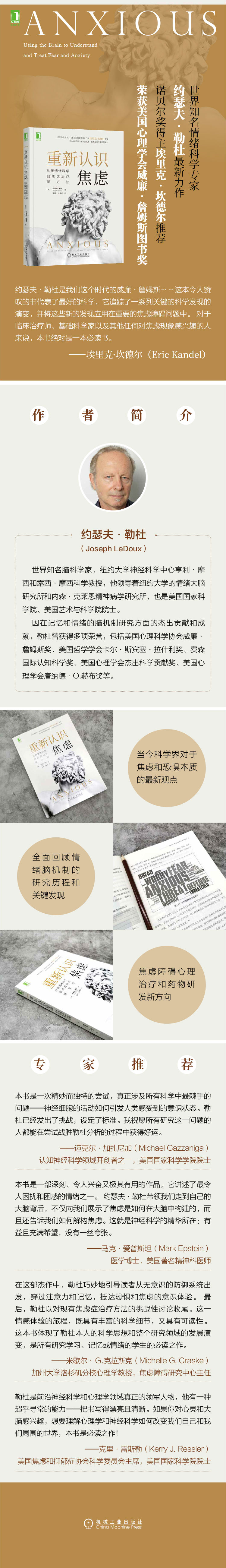 约瑟夫·勒杜是我们这个时代的威廉·詹姆斯……这本令人赞叹的书代表了最好的科学,它追踪了一系列关键的科学发现的演变,并将这些新的发现应用在重要的焦虑障碍问题中。 对于临床治疗师、基础科学家以及其他任何对焦虑现象感兴趣的人来说,本书绝对是一本必读书。