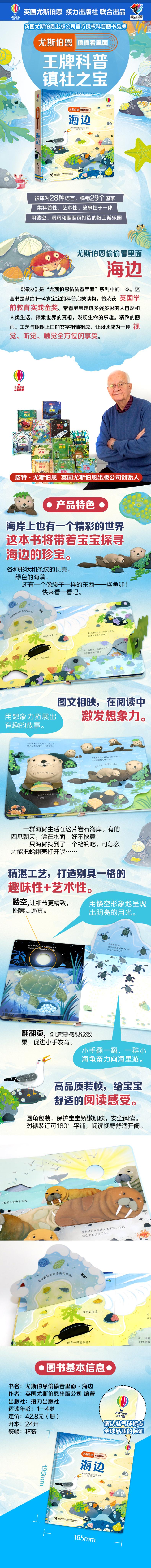 英国尤斯伯恩出版公司为1-4岁宝宝打造的认知绘本。集科普性、艺术性、故事性、文学性于一体。用精致的镂空、翻翻和洞洞工艺打造出的纸上游乐园。生动有趣的图文,带孩子探秘海滨小世界。