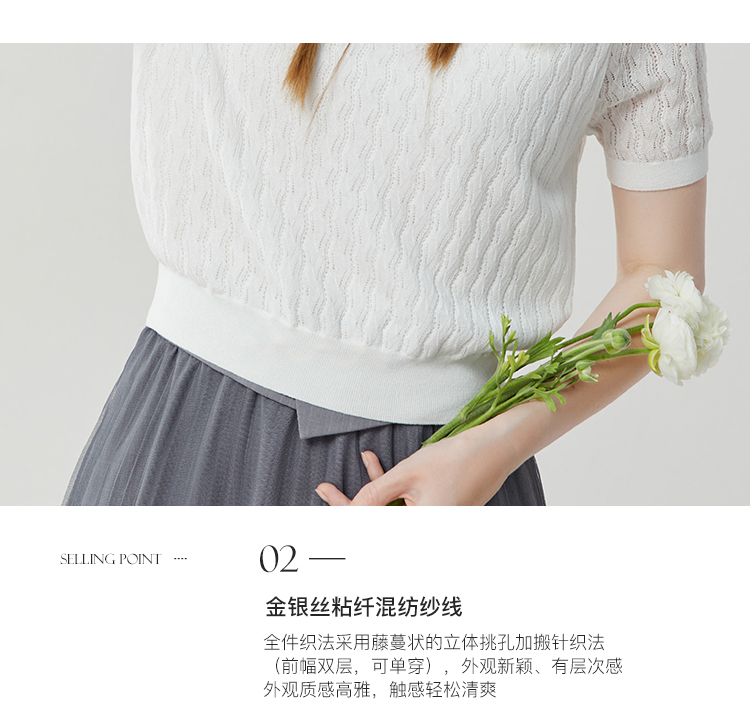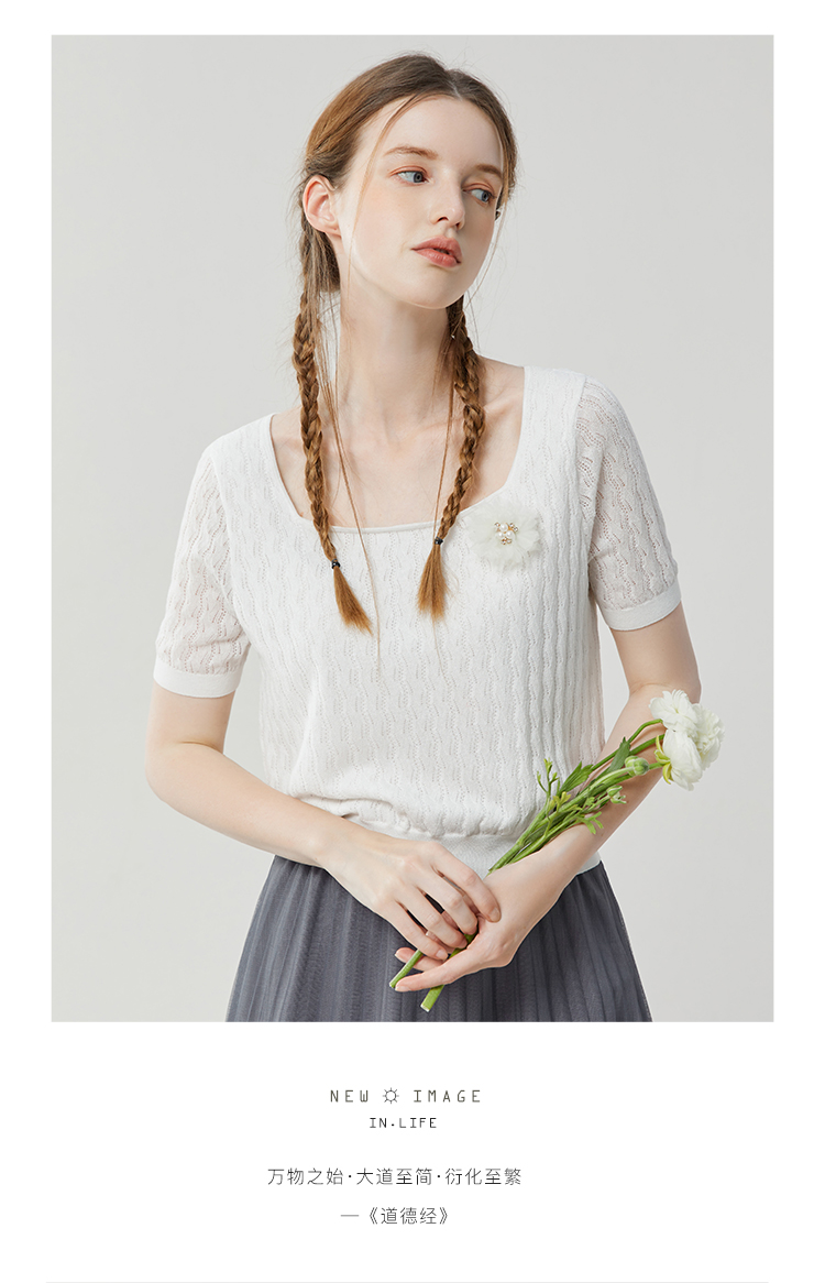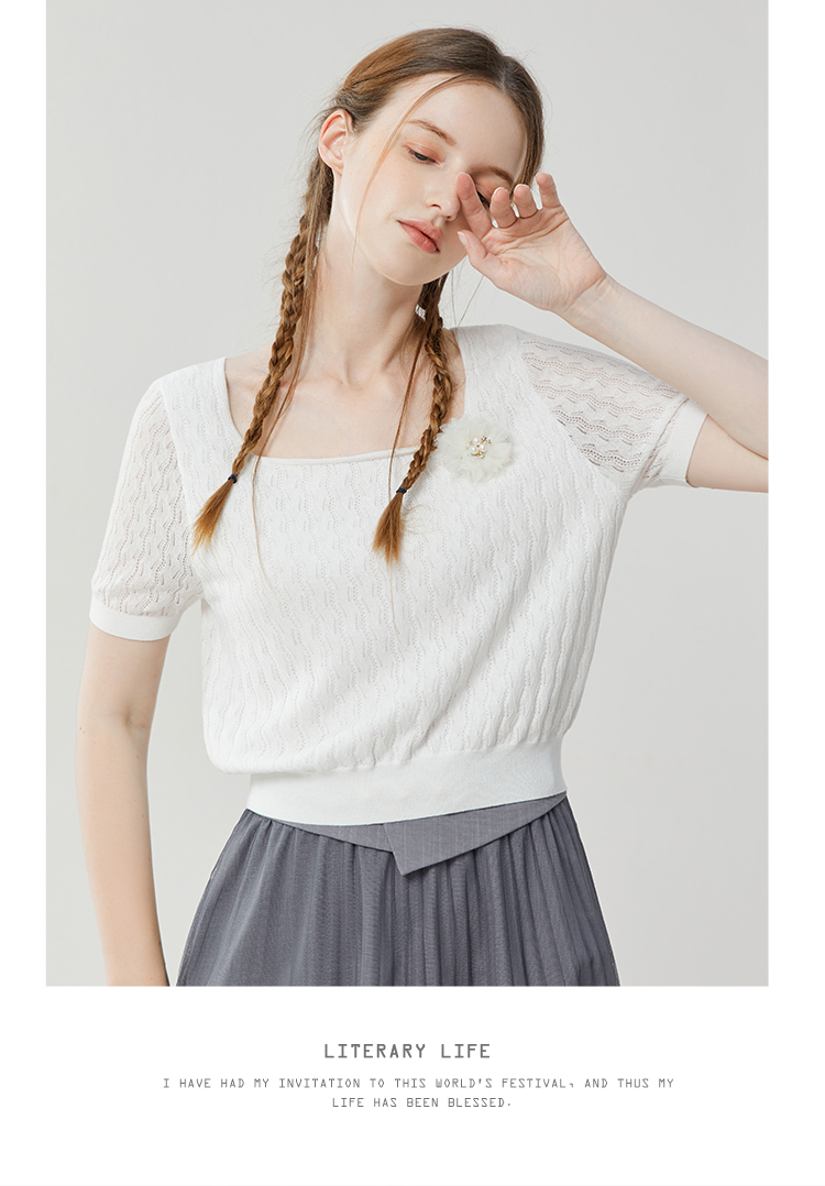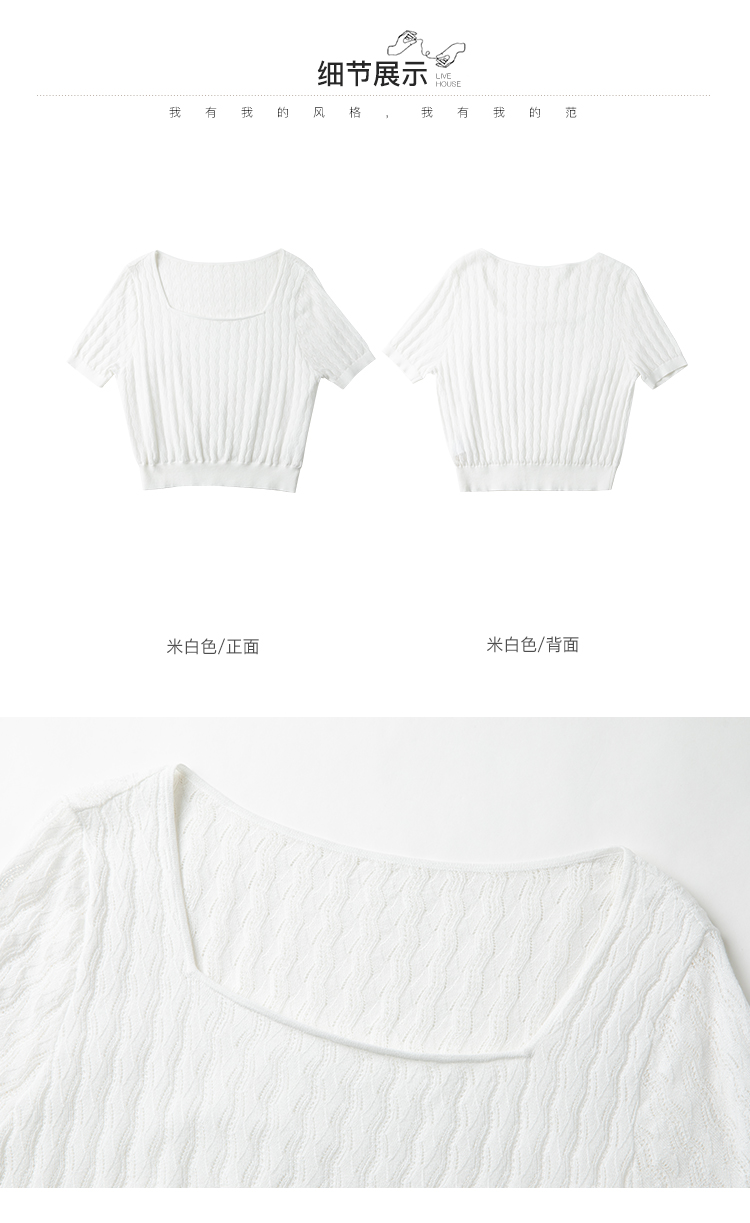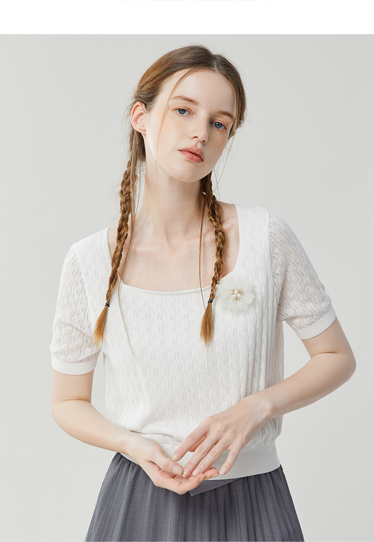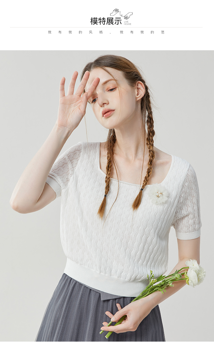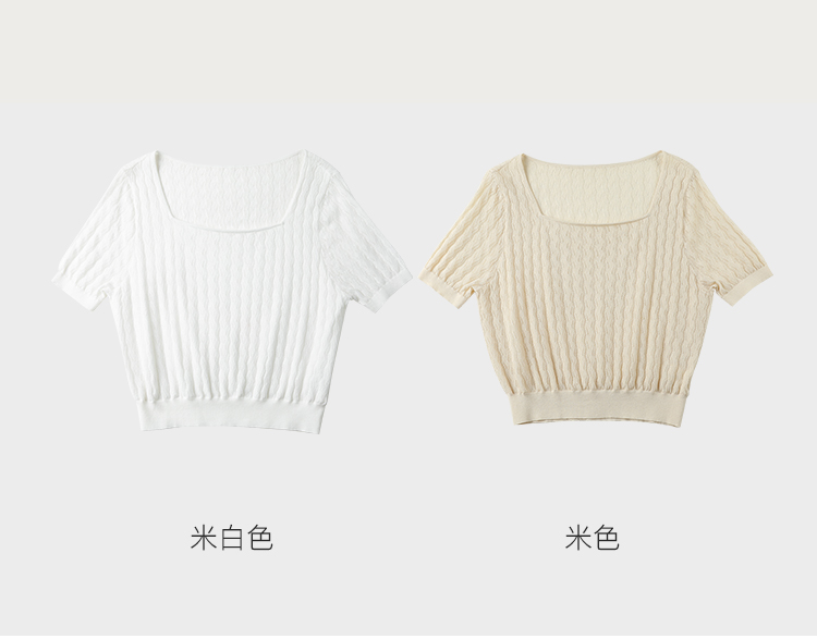 Famecoco范可儿短款低领针织衫女夏季新款短袖方领镂空上衣FAB3DB004