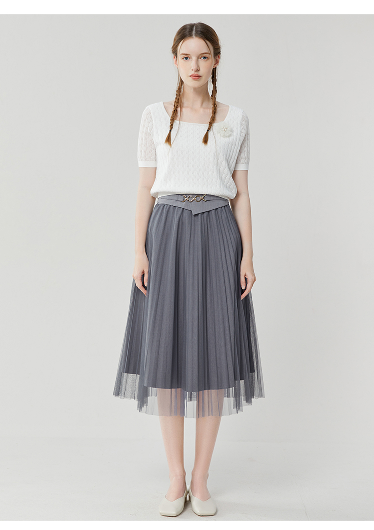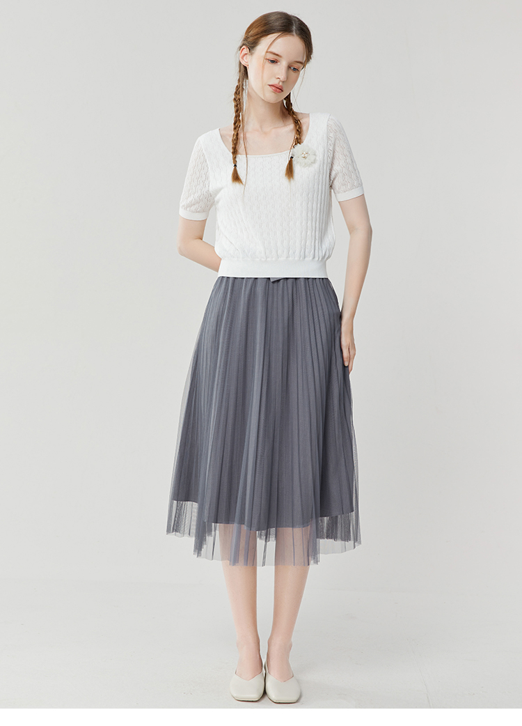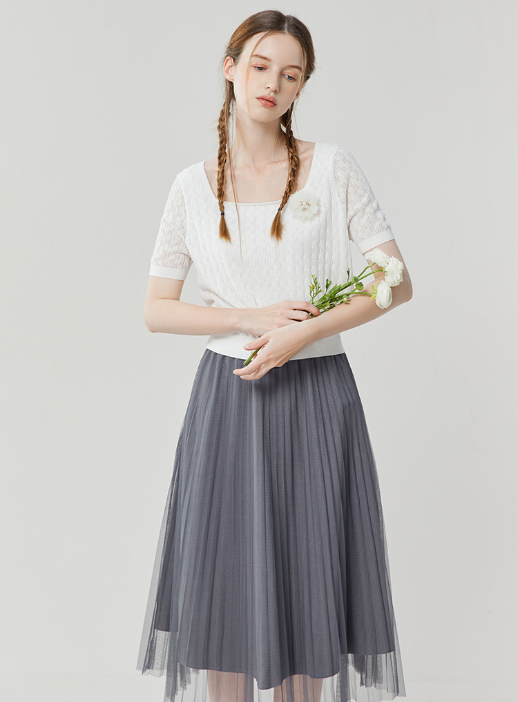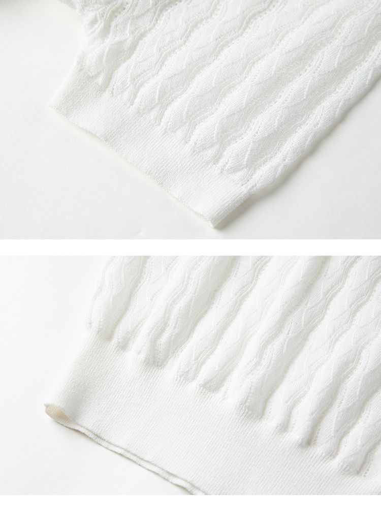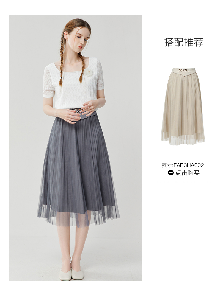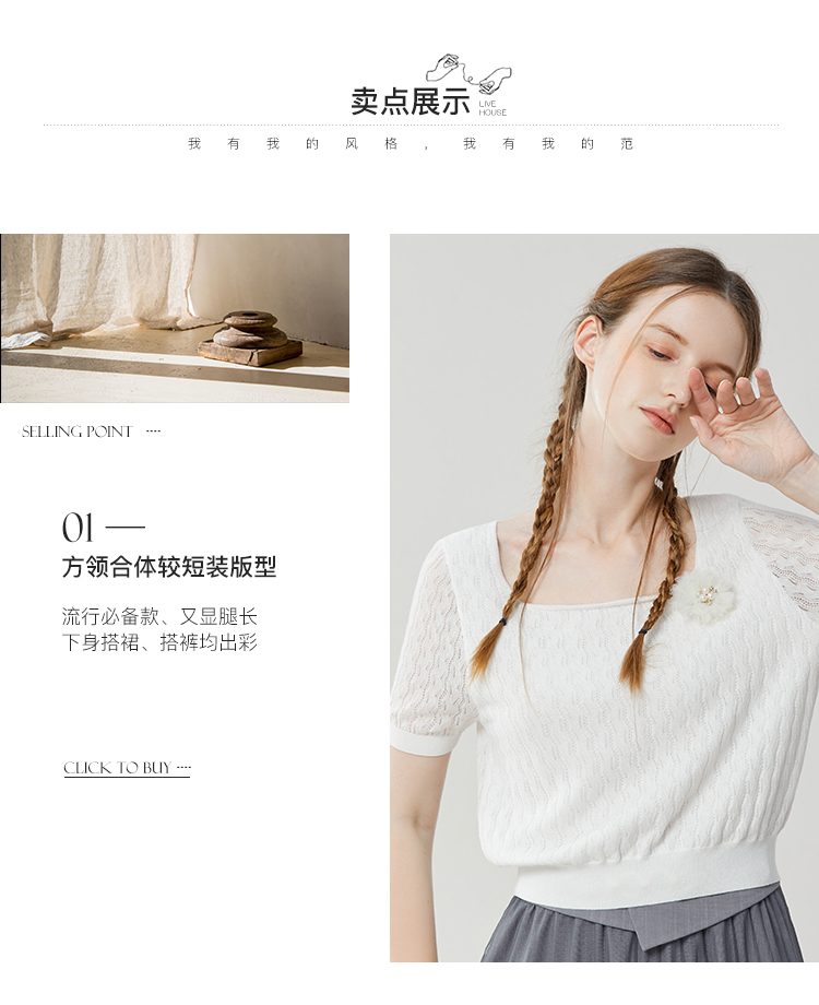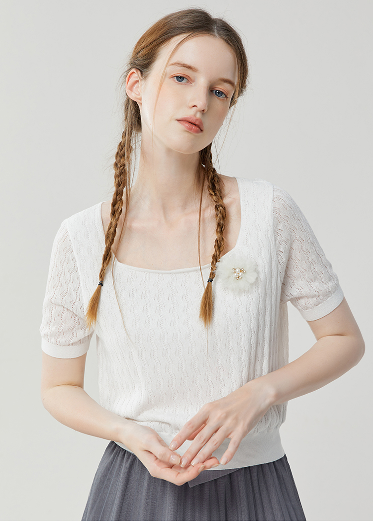 Famecoco范可儿短款低领针织衫女夏季新款短袖方领镂空上衣FAB3DB004