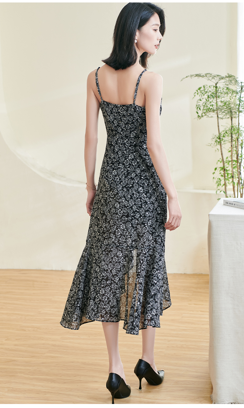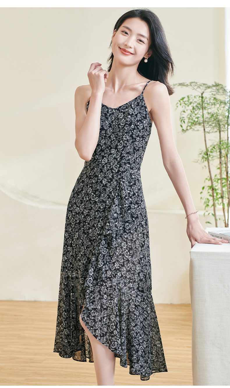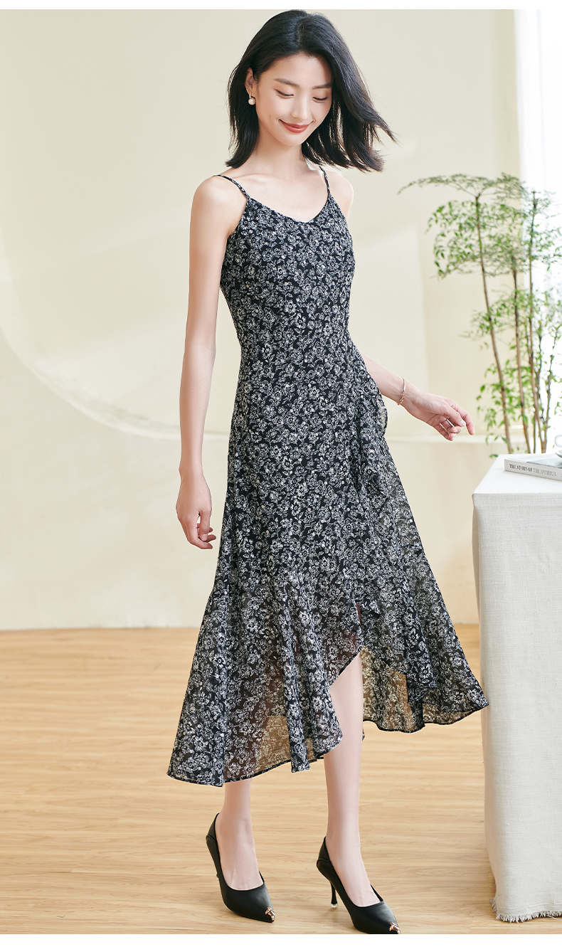 剩S/M/L/XL 米思阳2025夏季新款优雅气质吊带连衣裙碎花设计黑色A字裙女1105