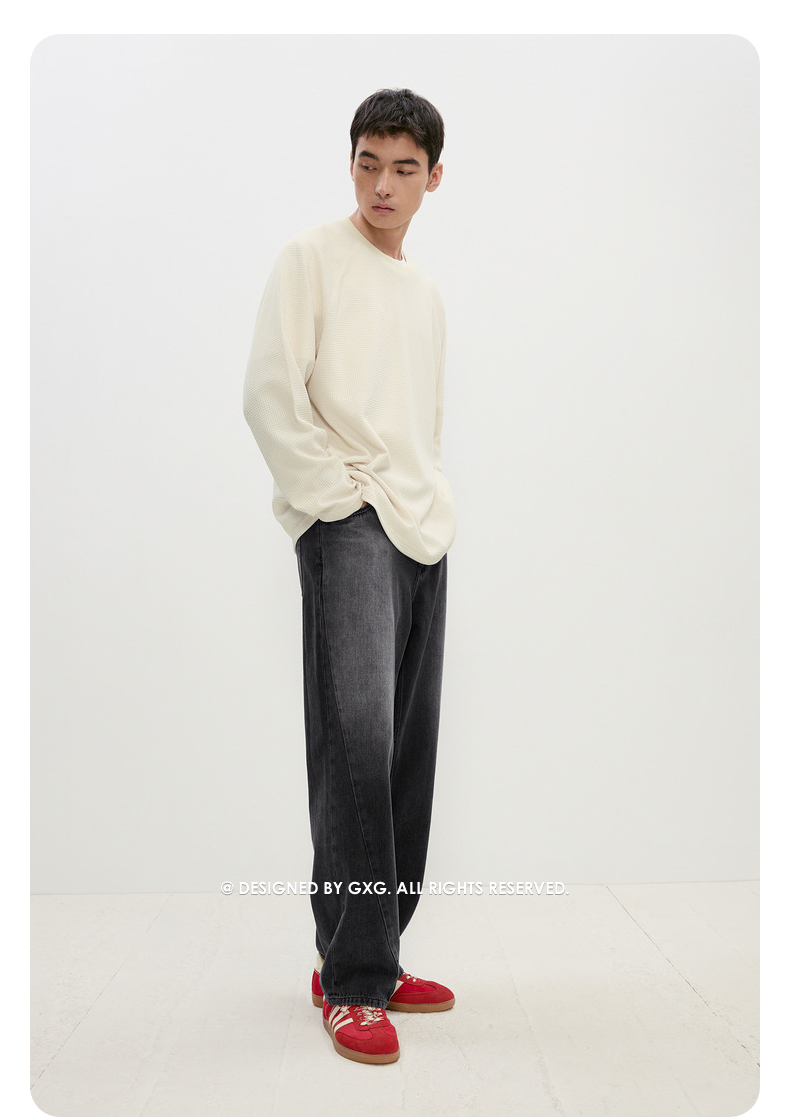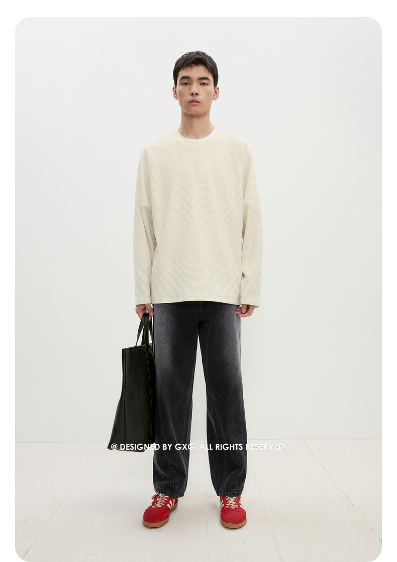 GXG男装 圆领卫衣华夫格肌理上衣双色分割线内搭 2025秋季新品