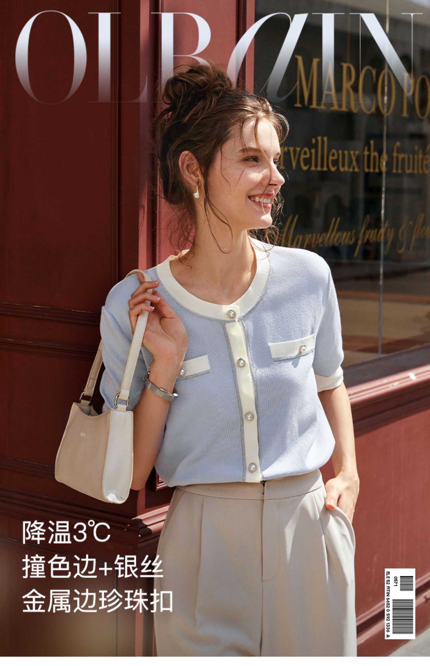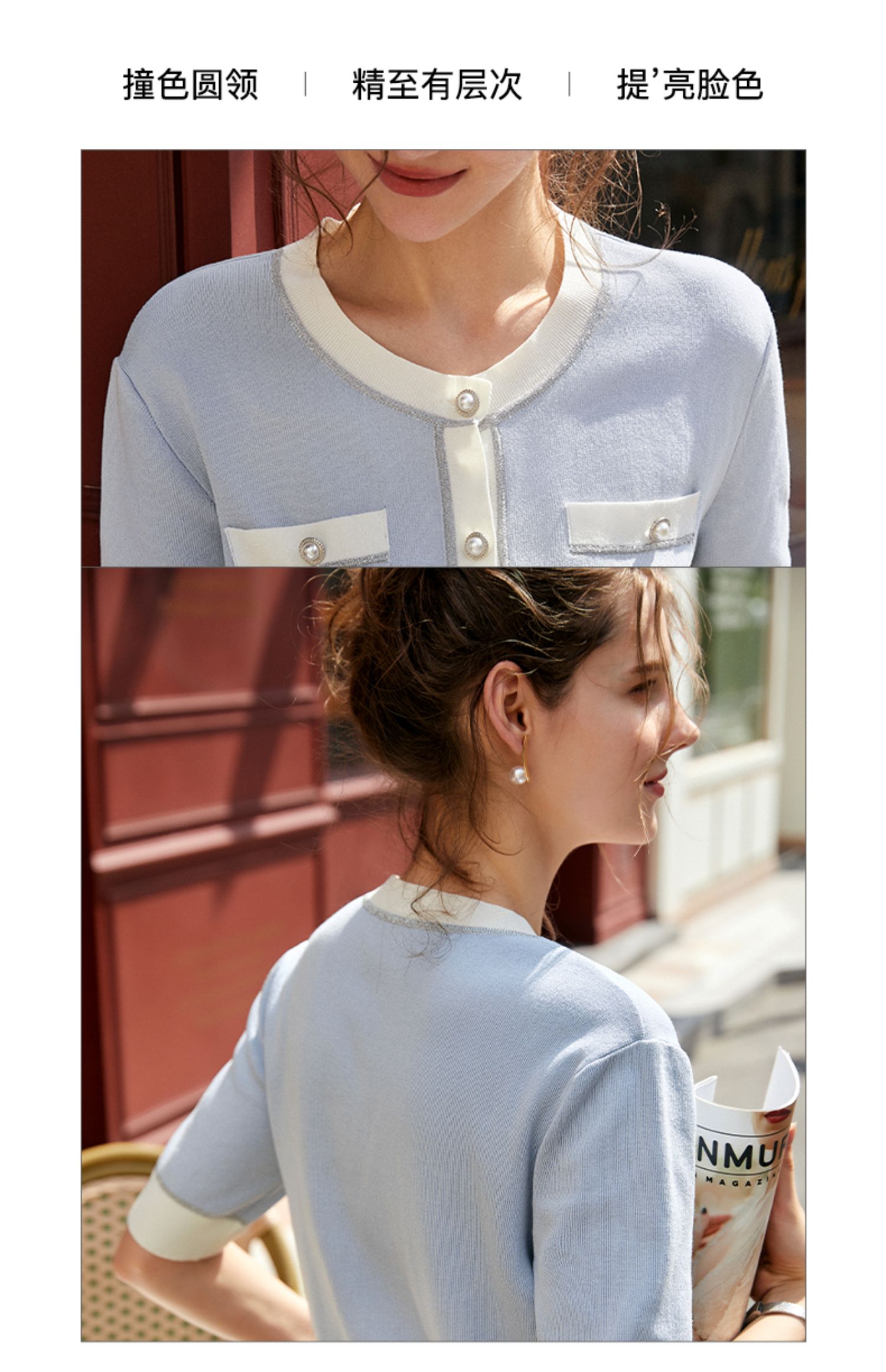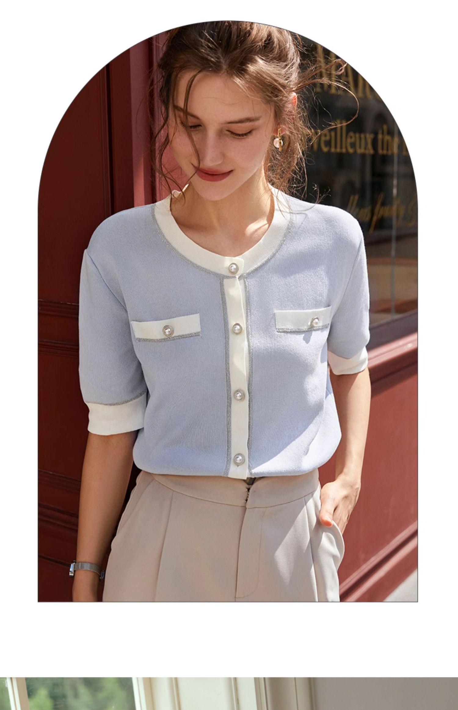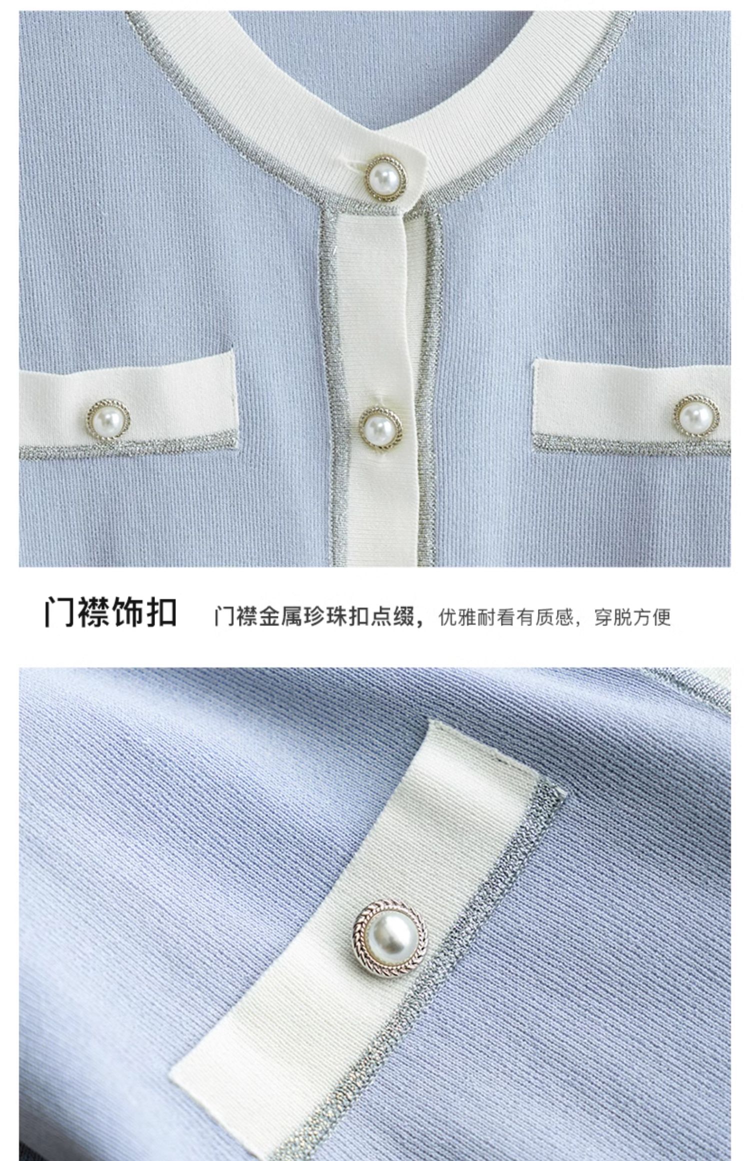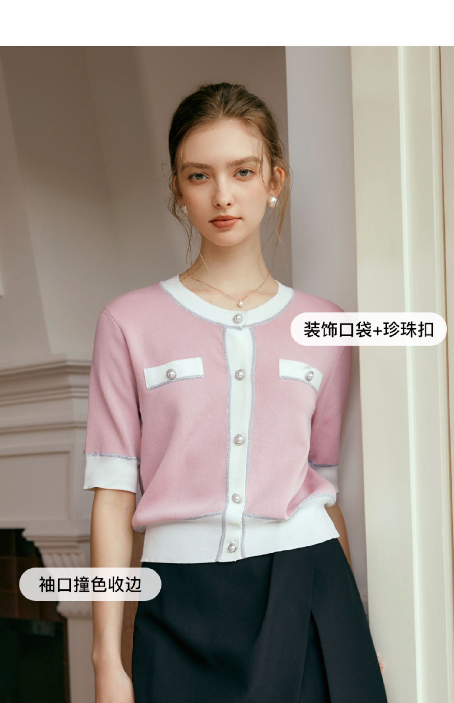 欧芮儿法式小香风针织开衫女夏季2024年新款短袖冰丝撞色毛衣外套