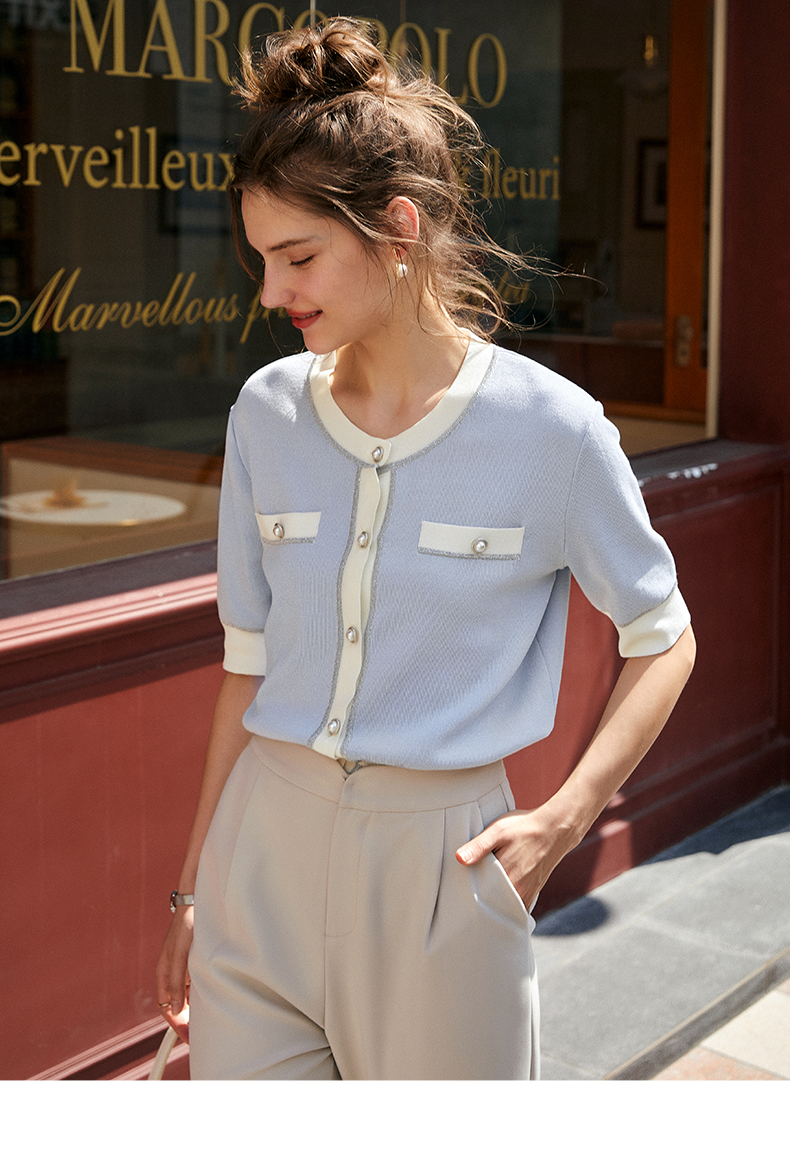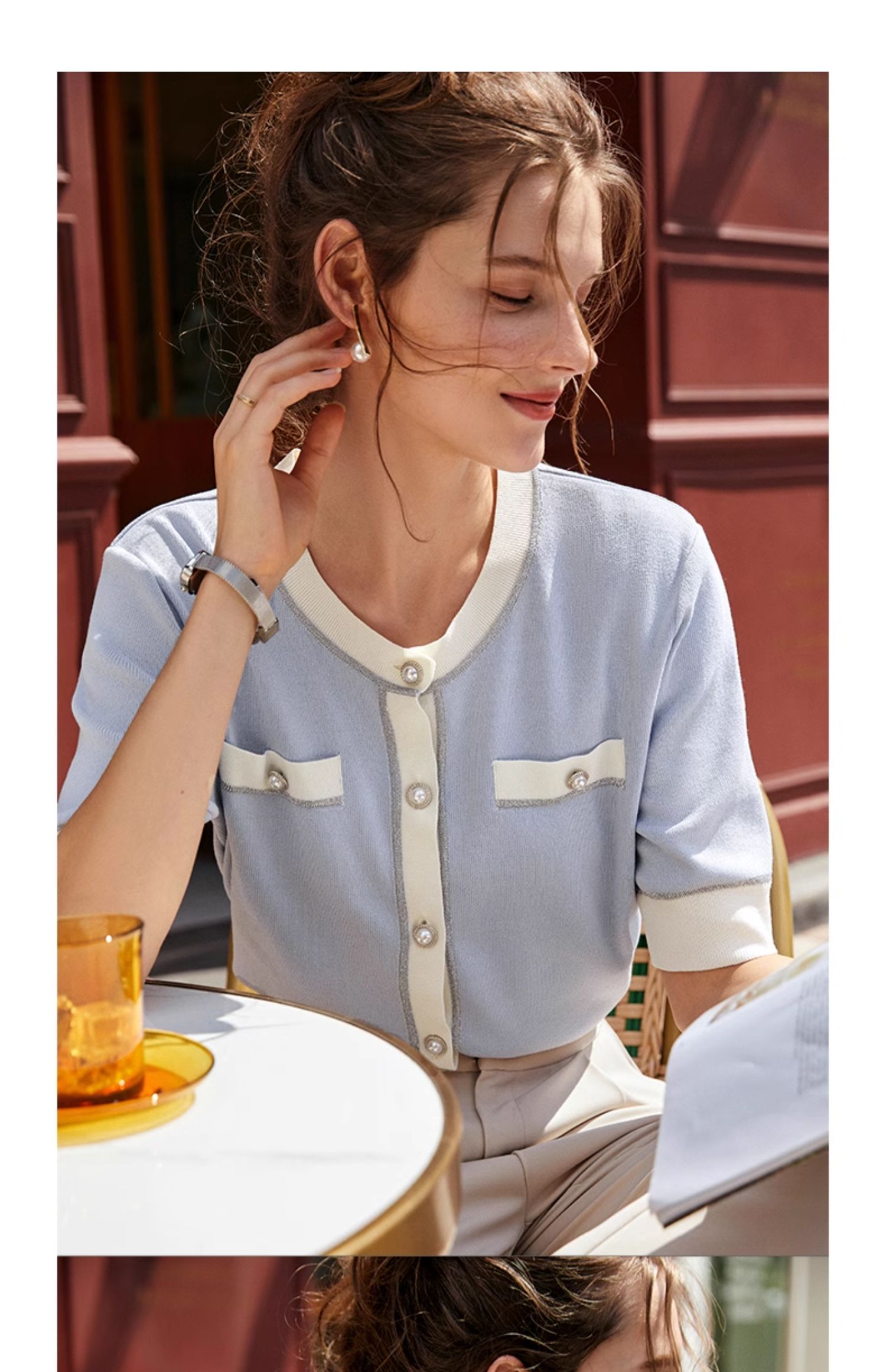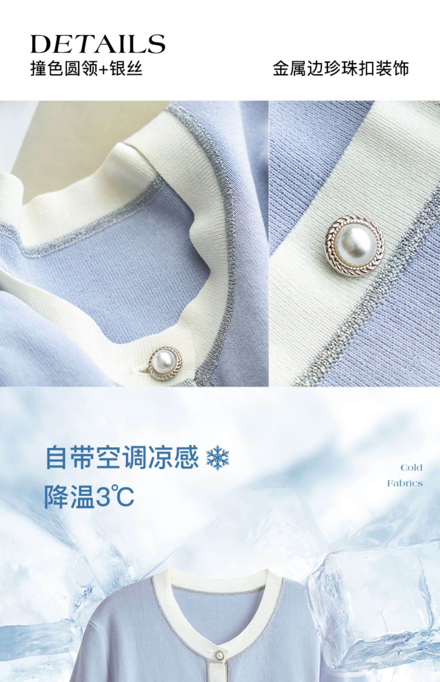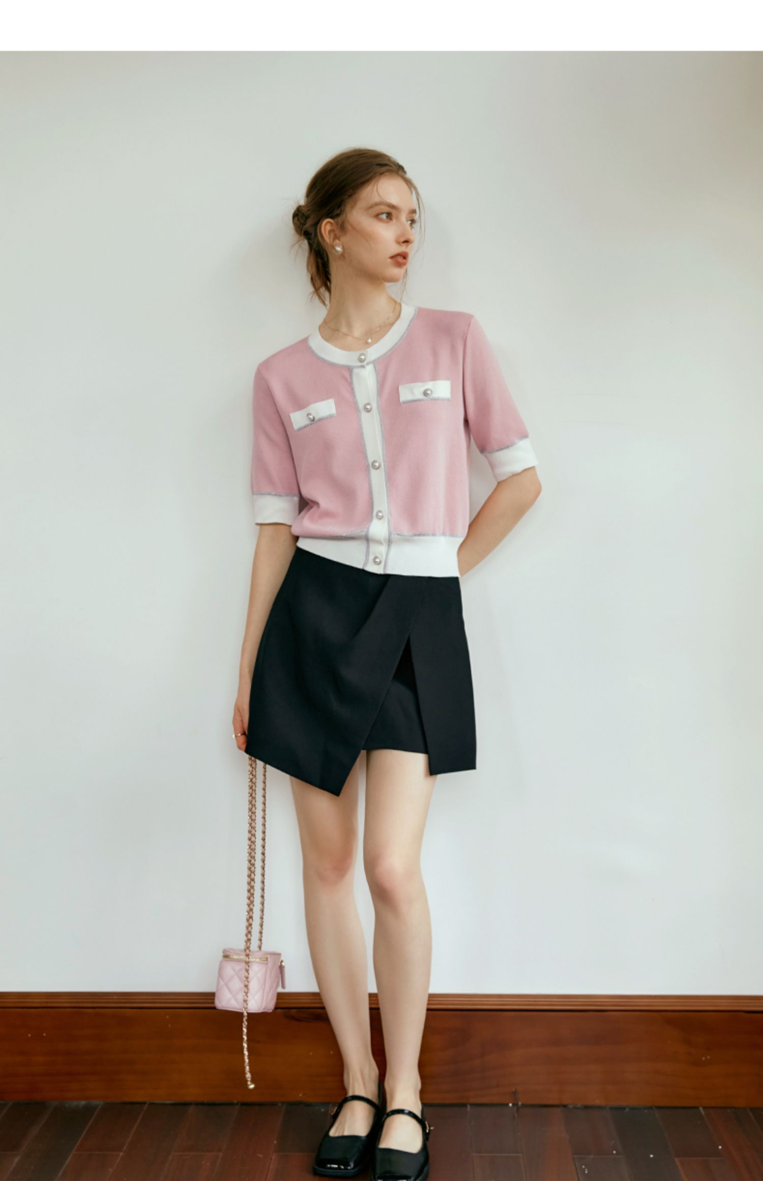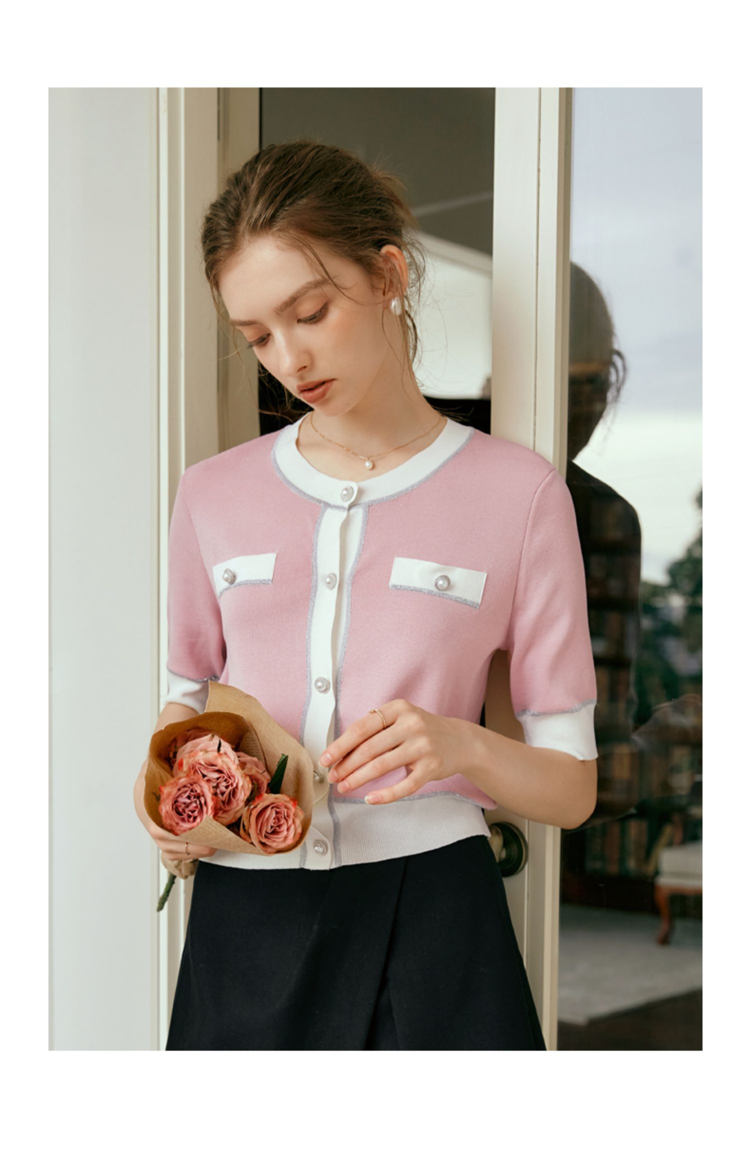欧芮儿法式小香风针织开衫女夏季2024年新款短袖冰丝撞色毛衣外套