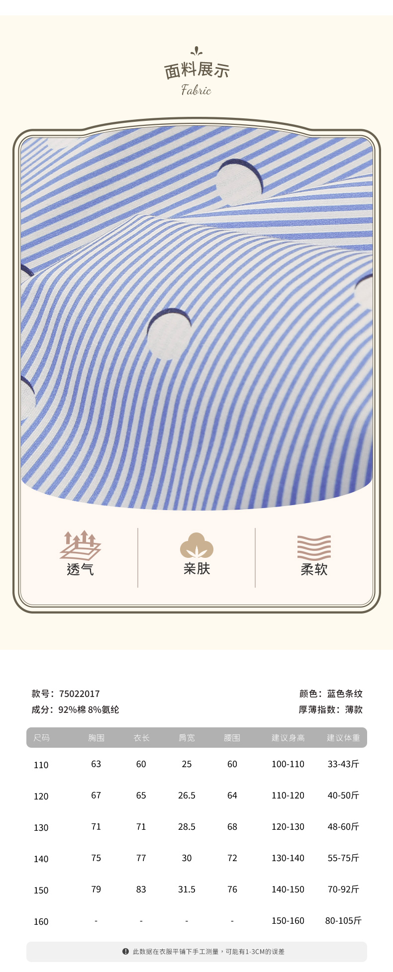 | 安全等级: B类 | 材质成分: 棉92% 聚氨酯弹性纤维(氨纶)8% |
