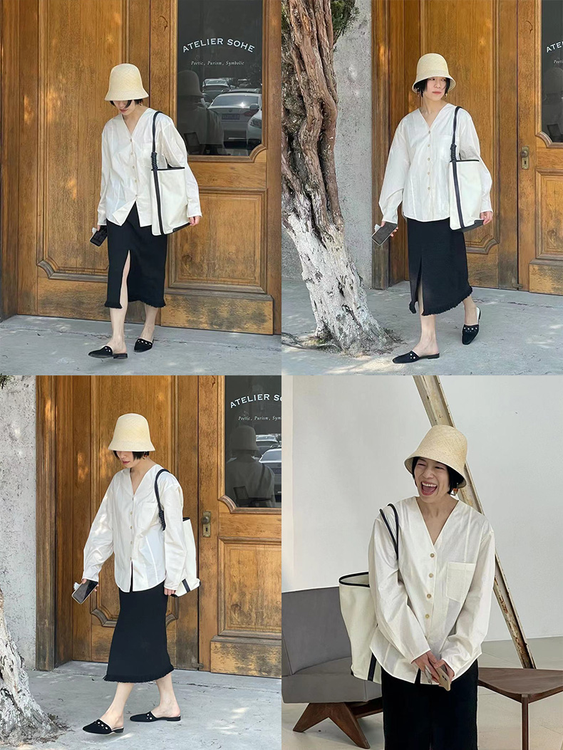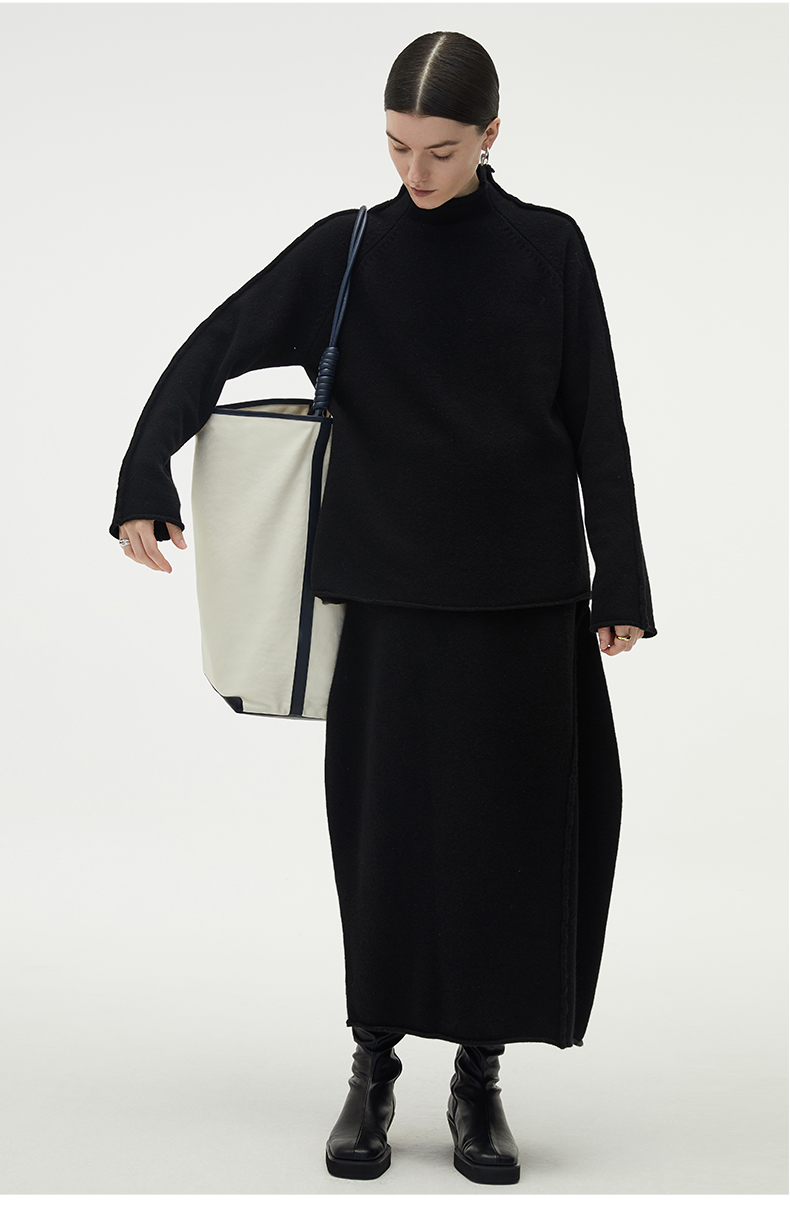 HIDEMI 简约设计感微荡立领半袖廓形套装 黑色/白色 上衣/半身裙