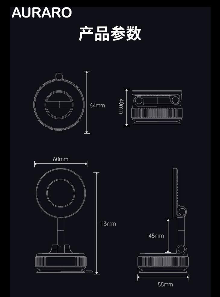 ✅AURARO国际热卖夯货3C小产品手机支架,三位世冠女神联袂代言 ✅真空吸附+N52铷磁,双面使用吸力强劲不脱落 ✅锌合金支撑臂+精钢阻尼轴,ProMax大手机也毫无压力! ✅三轴自由,180°上下翻转+360°横竖斜视角,随意调节使用角度 ✅折叠式设计,整体仅有保温杯的瓶盖大小,克重26,口袋就能轻松携带 ✅黑白双色可选,哑光金属质感机身,圆润无棱角不刮手,无痕吸附的实用主义优物