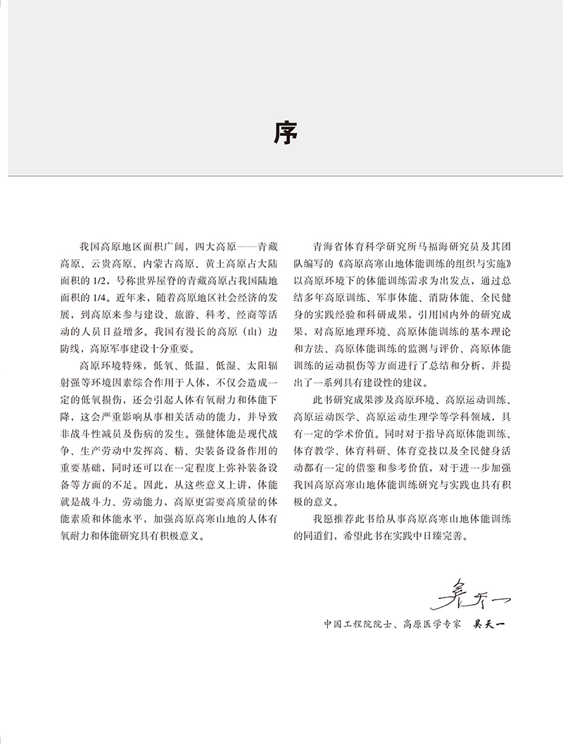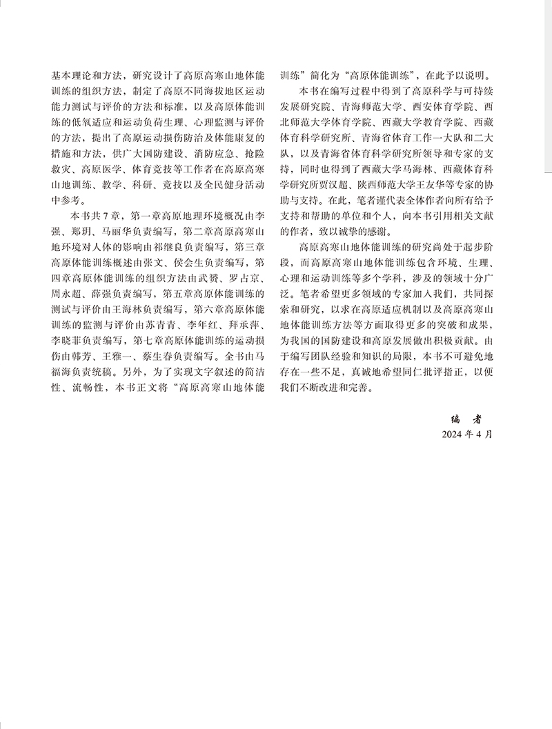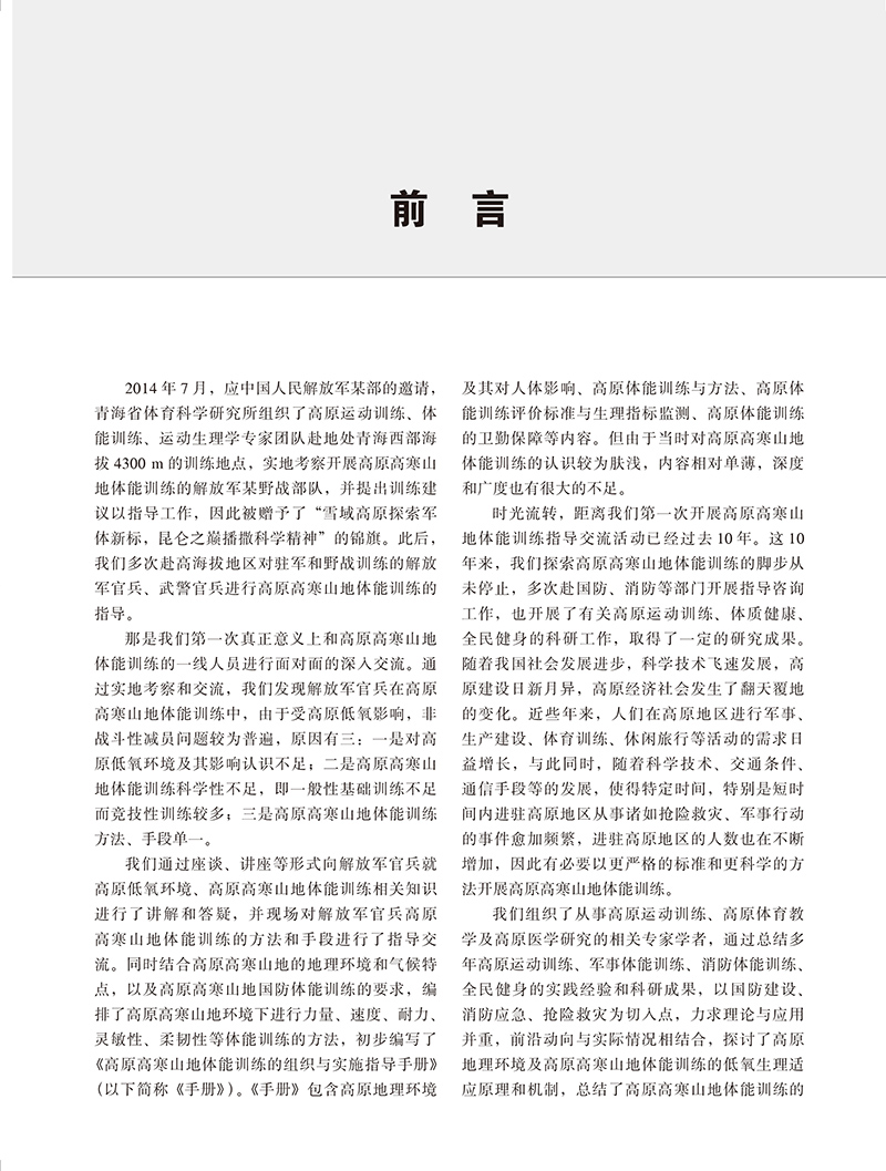 本书作者为从事高原训练、高原体育教学及高原医学研究的相关专家学者,通过总结多年高原训练、军事体能、消防体能、全民健身的实践经验和科研成果,以国防建设、消防应急、抢险救援为切入点,力求理论与应用并重,前沿动向和实际相结合,探讨了高原地理环境及高原高寒山地体能训练的低氧生理适应原理和机制,总结了高原体能训练的基本理论和方法,研究设计了高原体能训练的组织方法,制定了高原不同海拔地区运动能力测试与评价的方法和标准,以及高原体能训练的低氧适应和运动负荷生理、心理监测与评价的方法,提出了高原运动损伤防治及体能康复的措施和方法,供广大国防、消防、抢险救援、高原医学、体育等工作者在高原体能训练、体育教学、科研、竞技体育以及全民健身活动中参考。