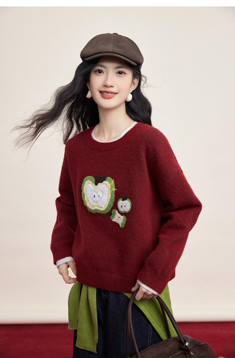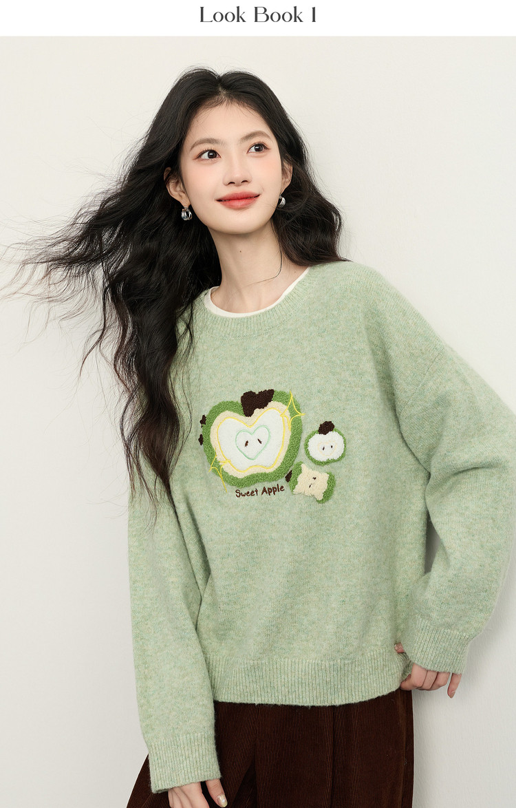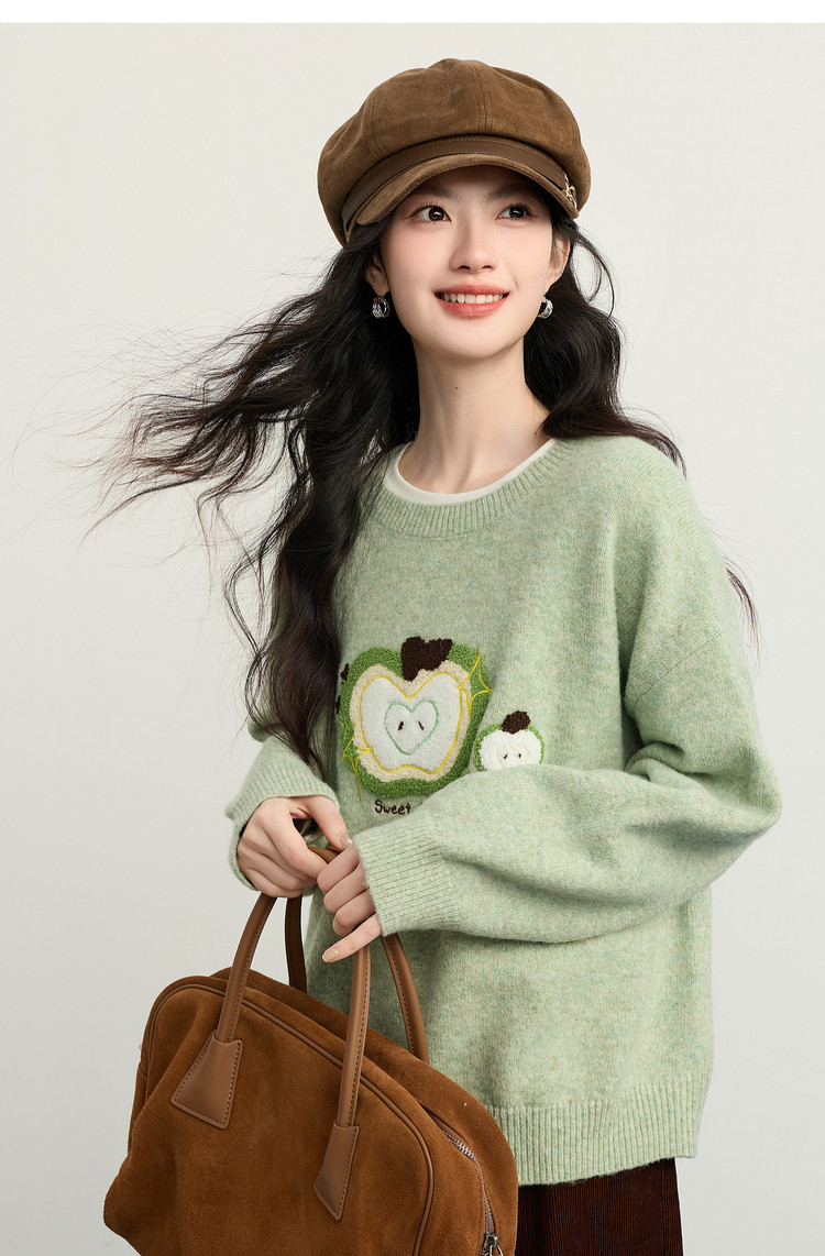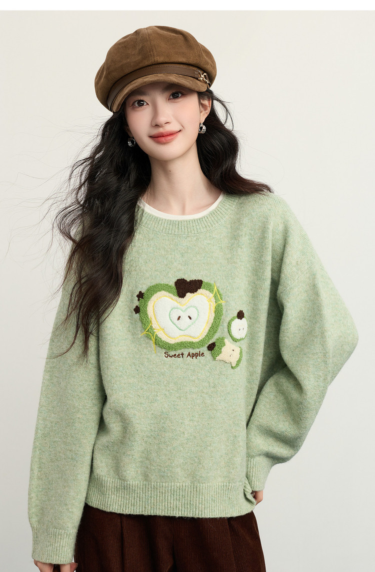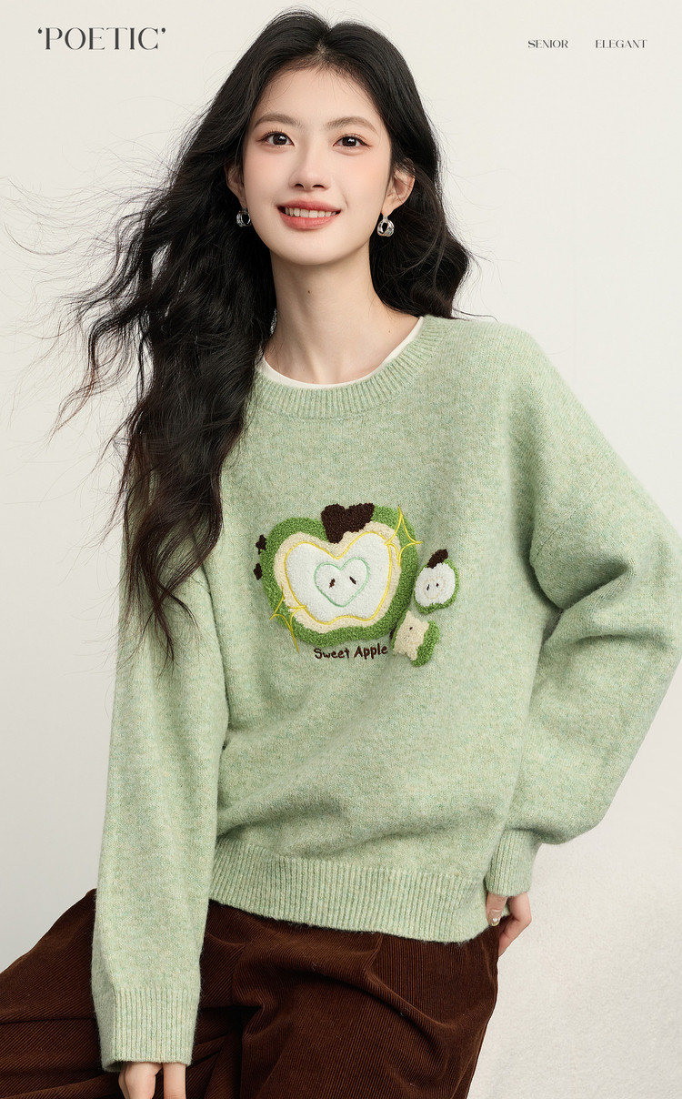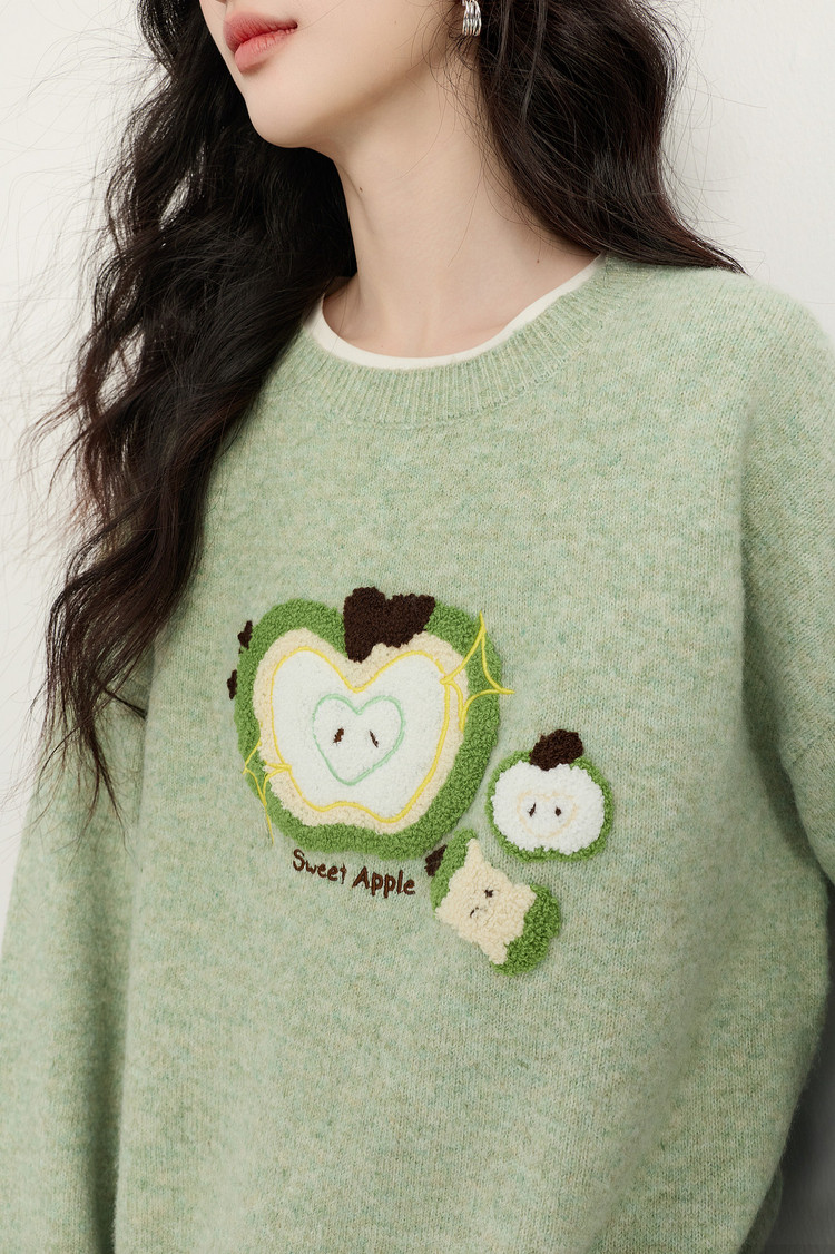 【12/31新品】熙世界苹果毛巾绣绿色厚毛衣女慵懒高级感冬季宽松圆领软糯针织衫