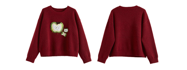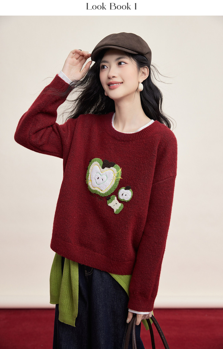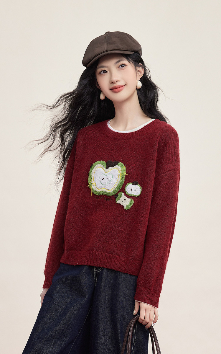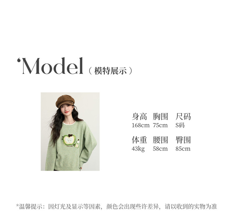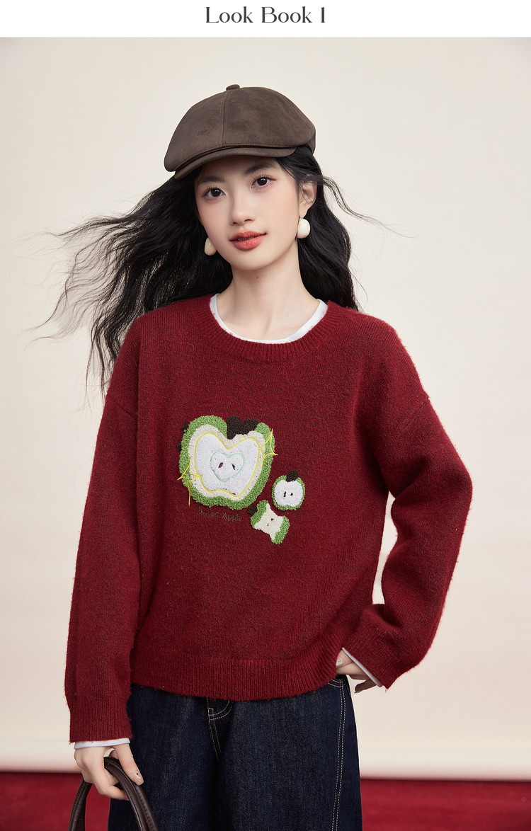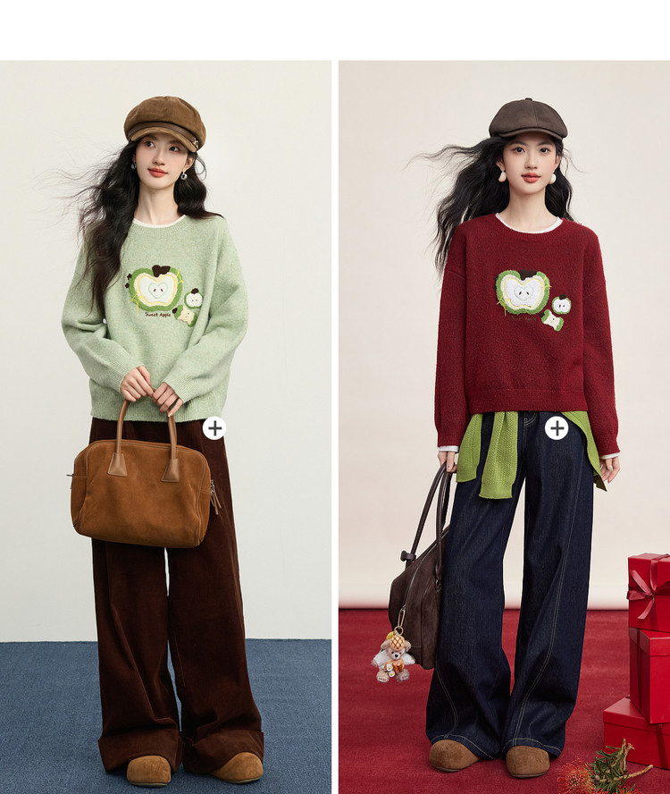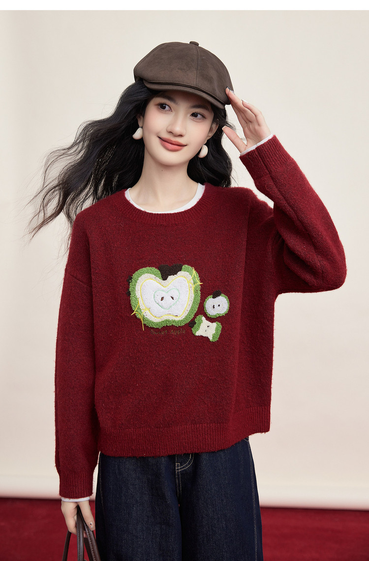 【12/31新品】熙世界苹果毛巾绣绿色厚毛衣女慵懒高级感冬季宽松圆领软糯针织衫