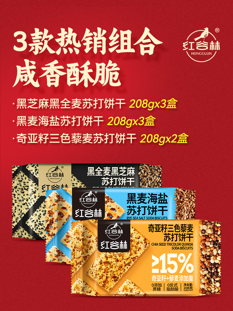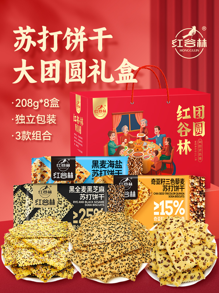 红谷林苏打饼干礼盒黑麦海盐奇亚籽三色藜麦黑芝麻黑全麦端午礼盒送礼
