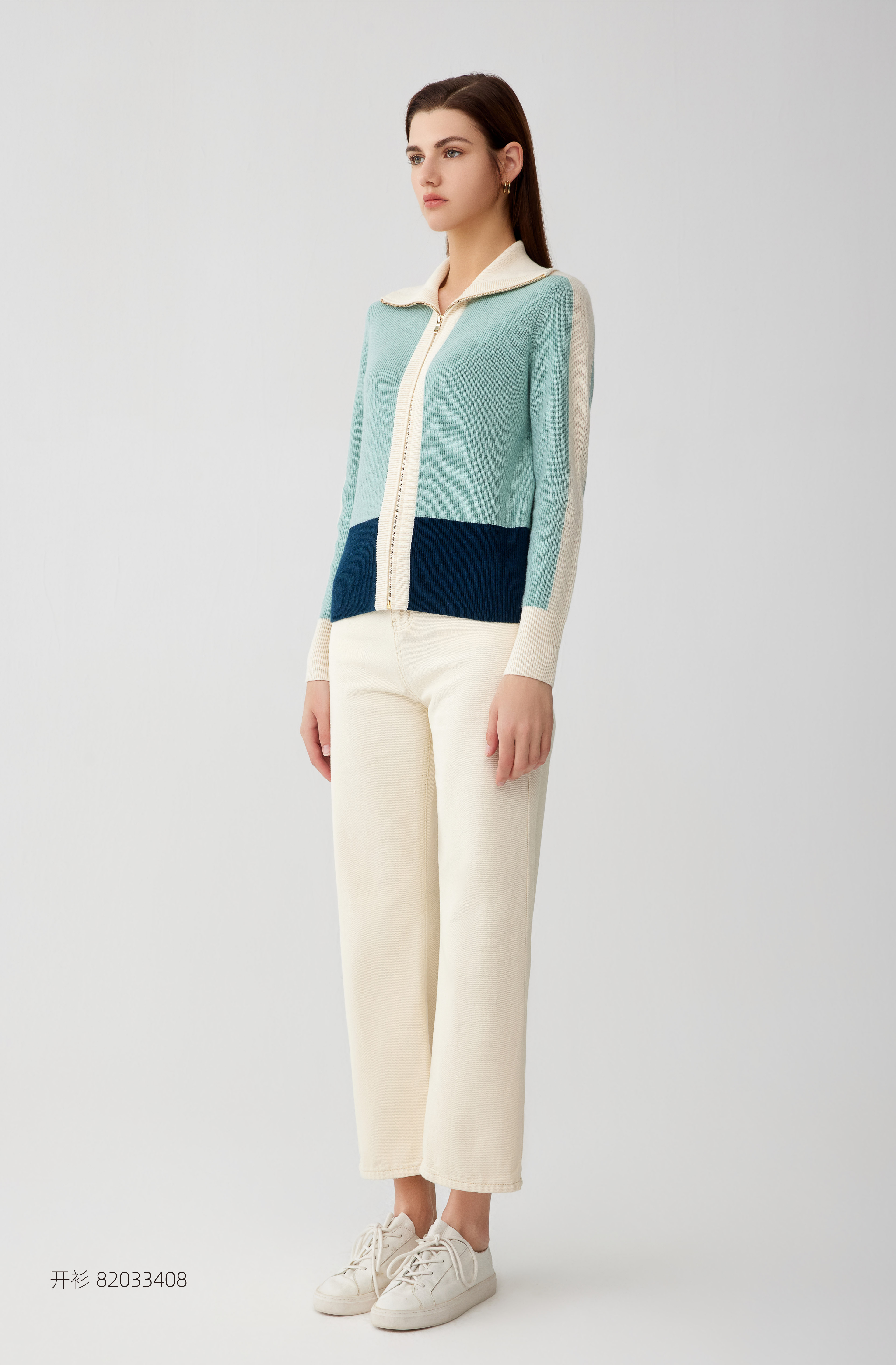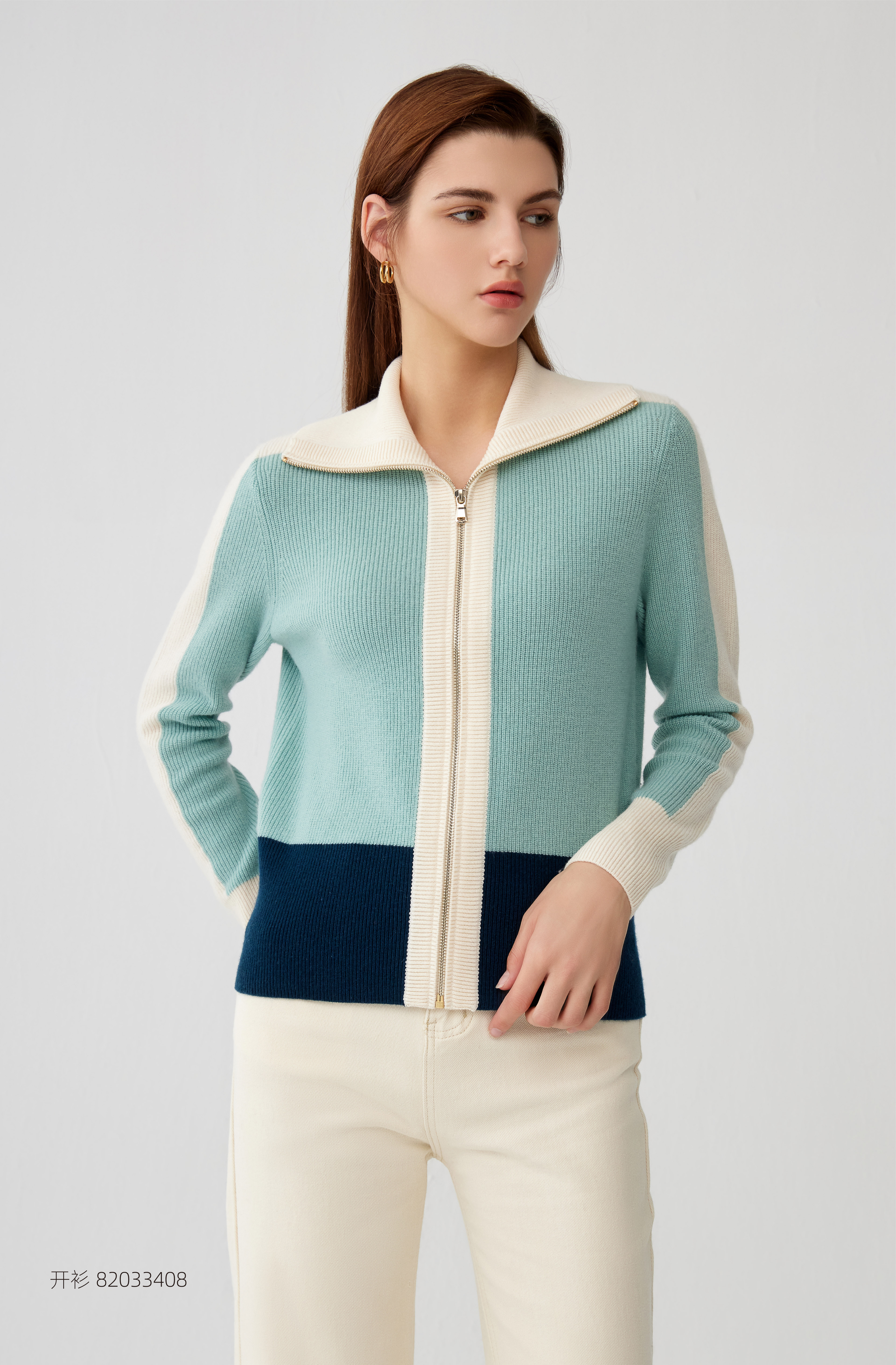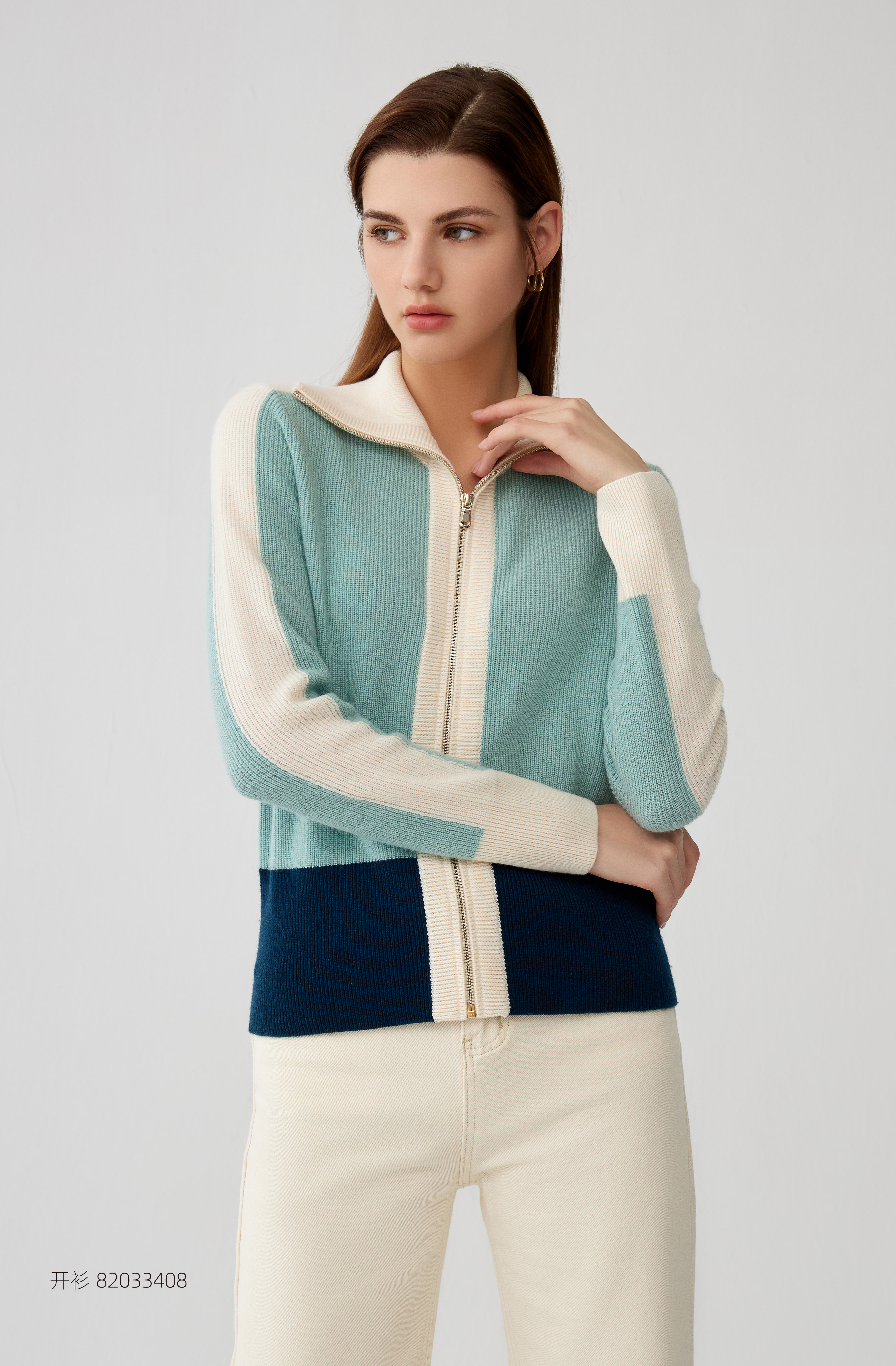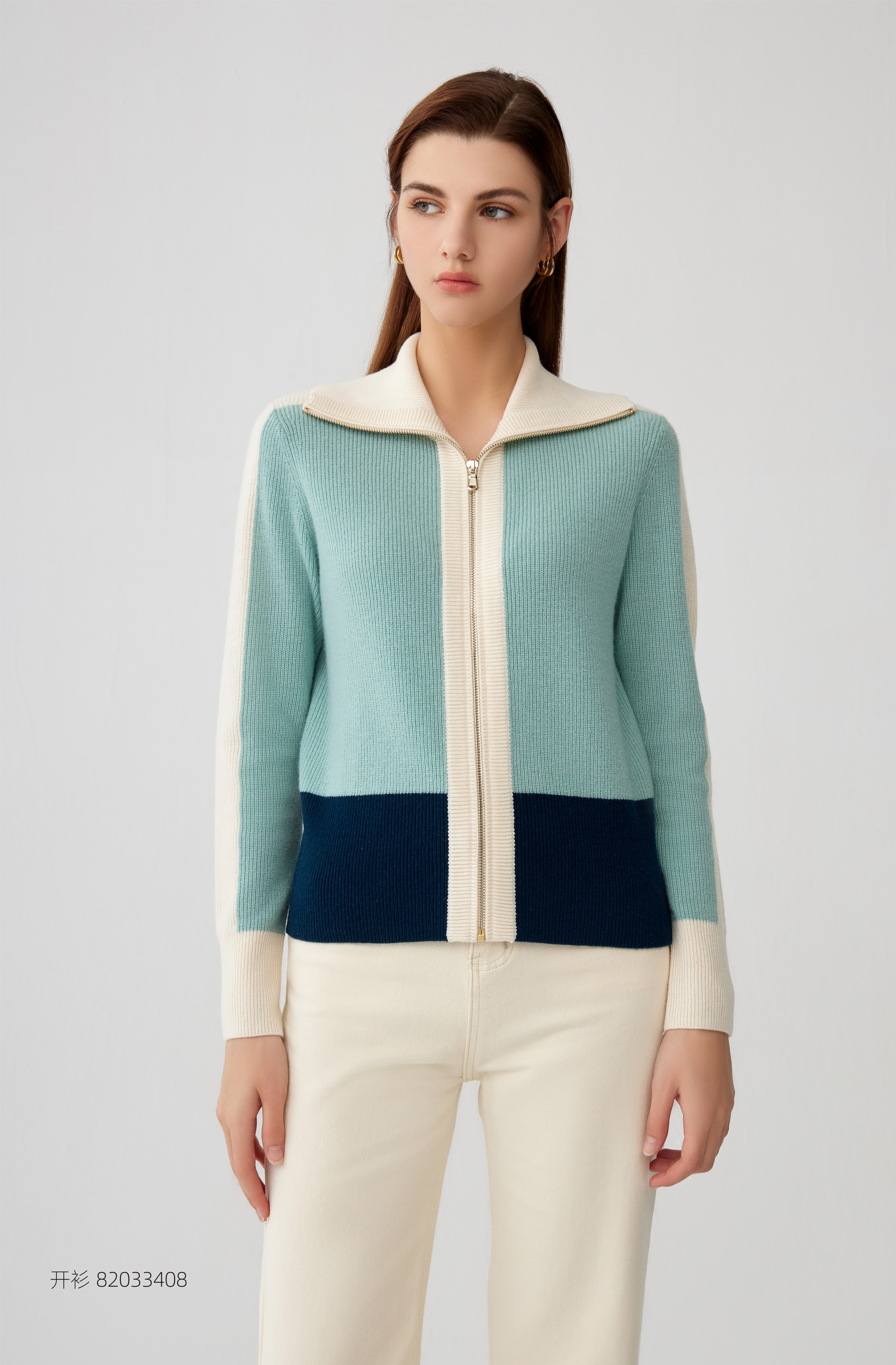 【纯羊绒撞色针织开衫】羊绒世家秋冬新品女士100%山羊绒针织外套时尚撞色开衫