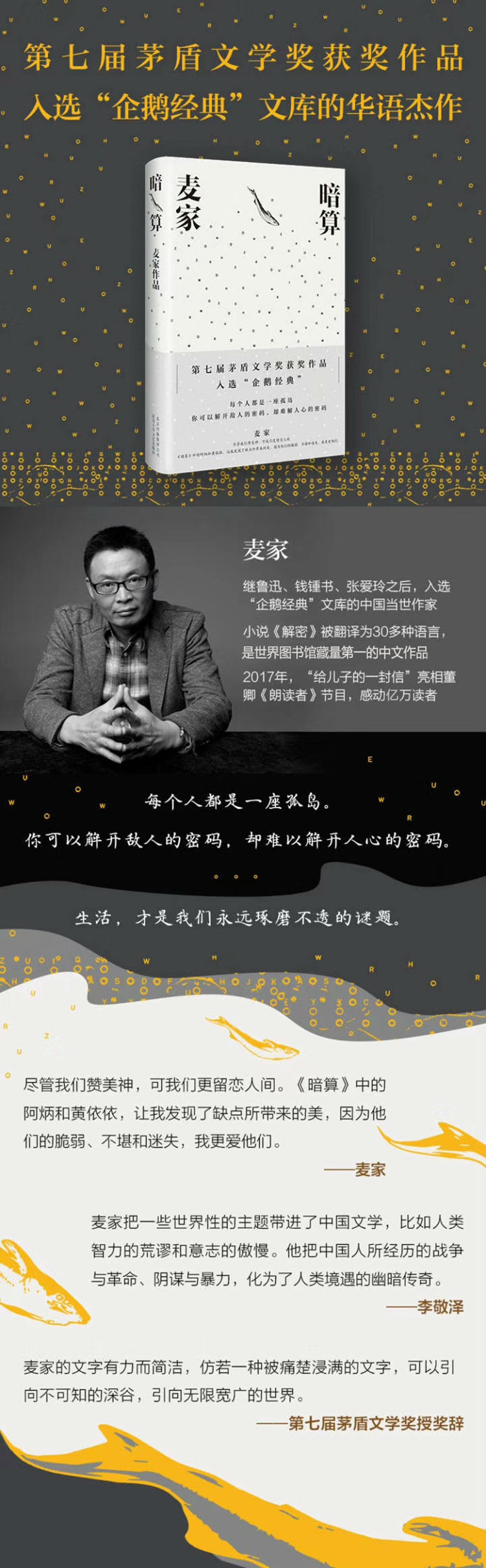 麦家的写作对于当代中国文坛来说,无疑具有独特性。《暗算》讲述了具有特殊禀赋的人的命运遭际,书写了个人身处在封闭的黑暗空间里的神奇表现。破译密码的故事传奇曲折,充满悬念和神秘感,与此同时,人的心灵世界亦得到丰富细致地展现。麦家的小说有着奇异的想象力,构思独特精巧,诡异多变。他的文字有力而简洁,仿若一种被痛楚浸满的文字,可以引向不可知的深谷,引向无限宽广的世界。他的书写,能独享一种秘密,一种幸福,一种意外之喜。——第七届茅盾文学奖授奖辞