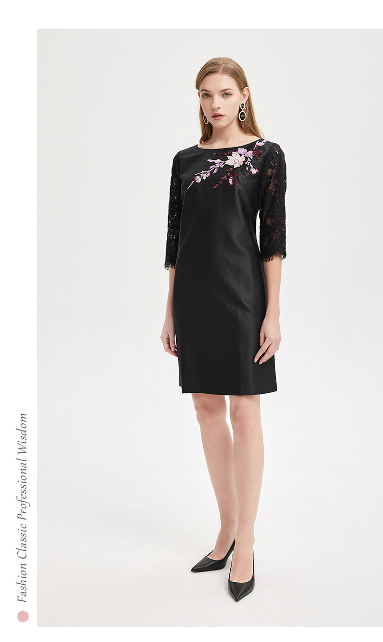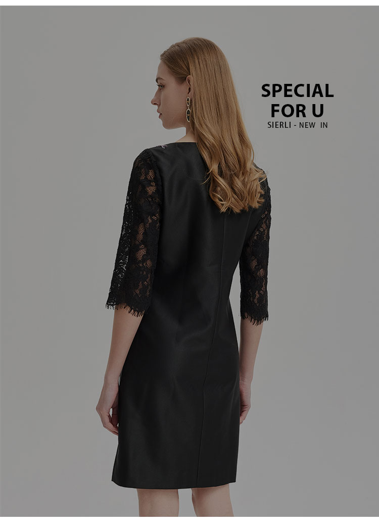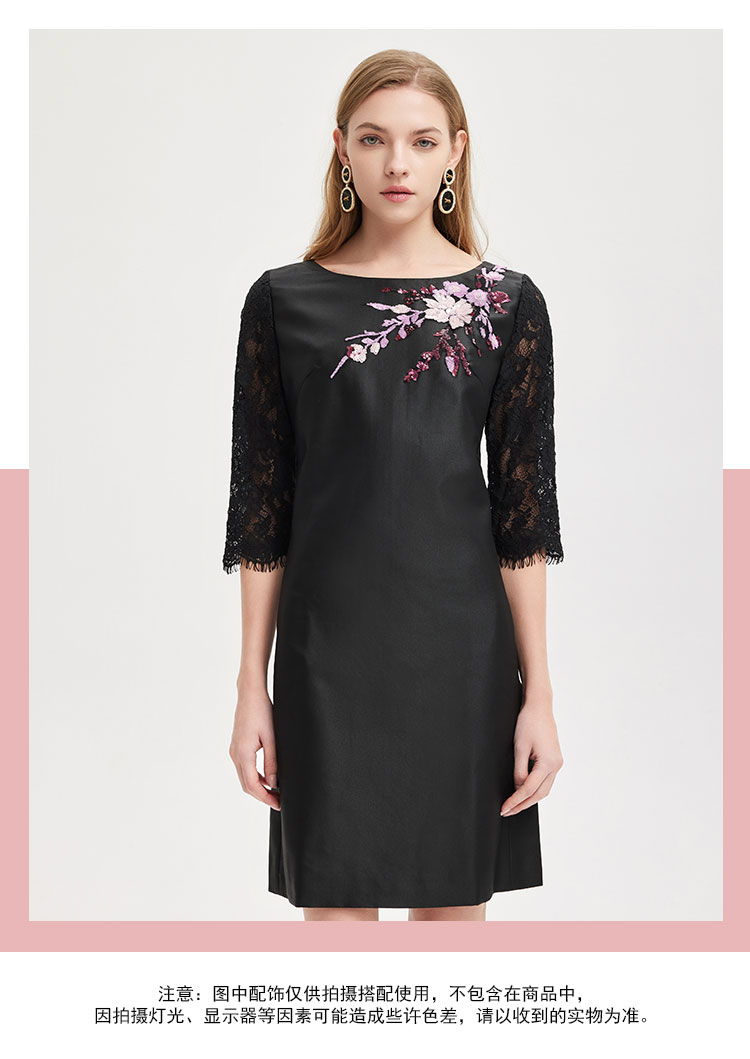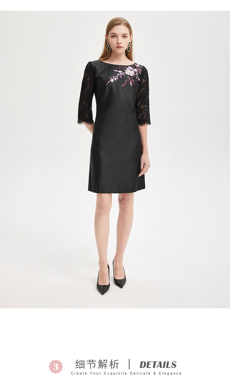 RE8A9斯尔丽2021春季新品淑女气质直身立体贴花蕾丝袖小黑裙