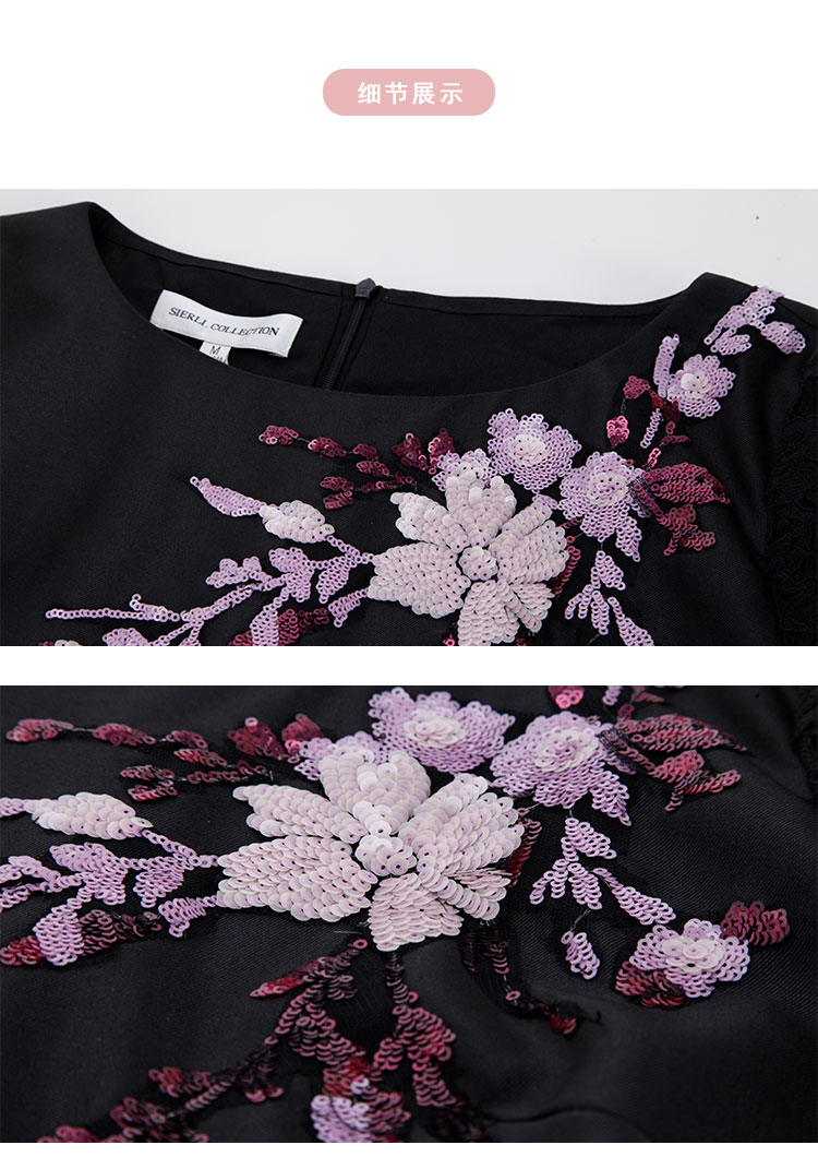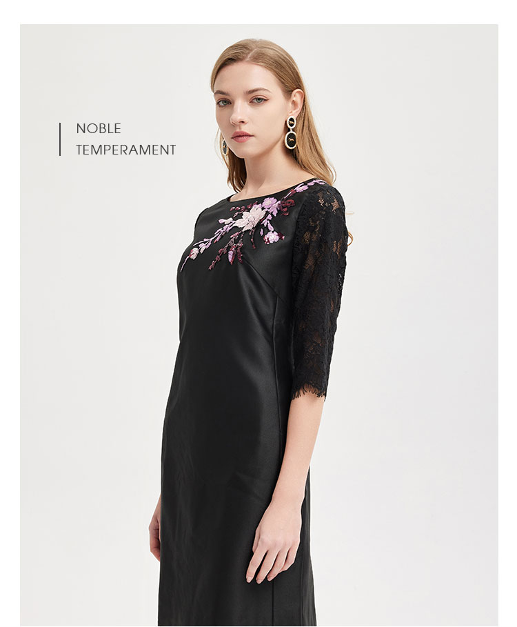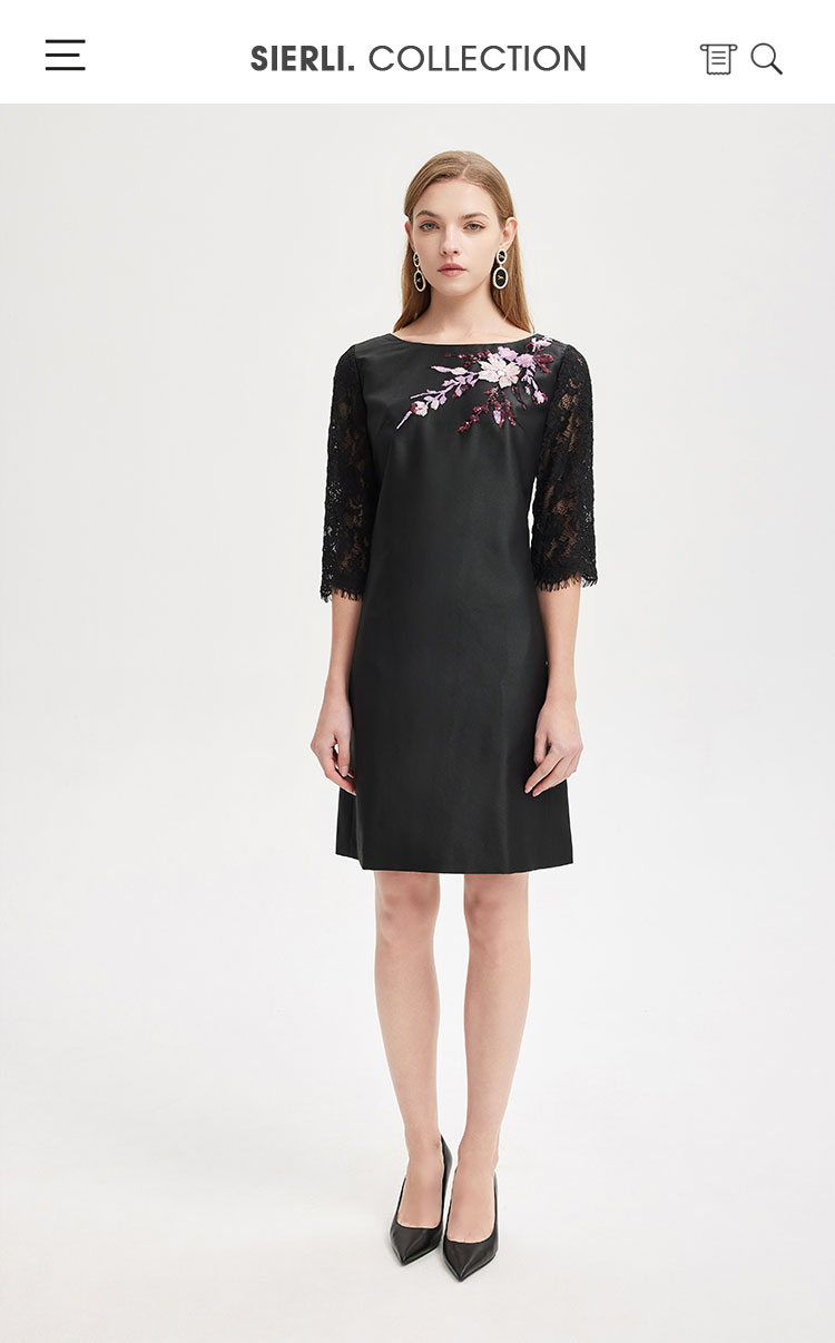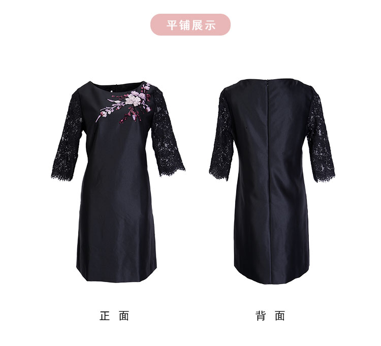 RE8A9斯尔丽2021春季新品淑女气质直身立体贴花蕾丝袖小黑裙