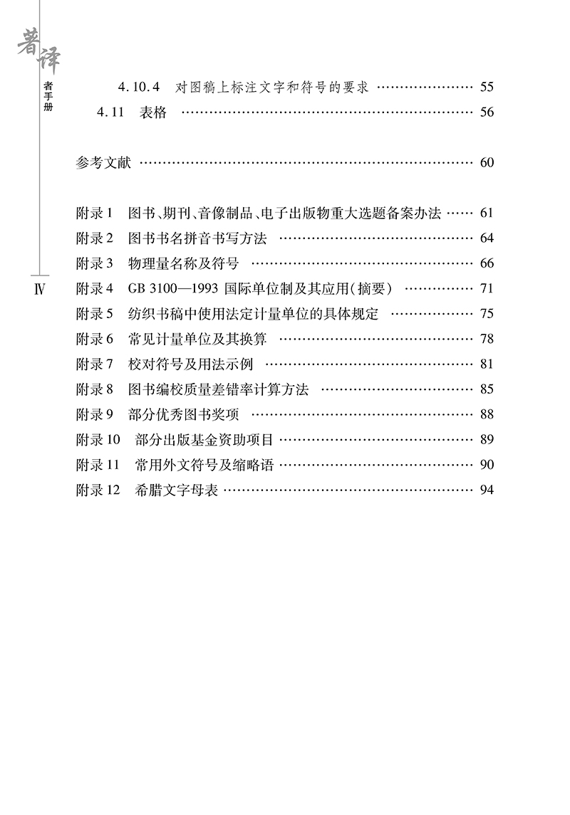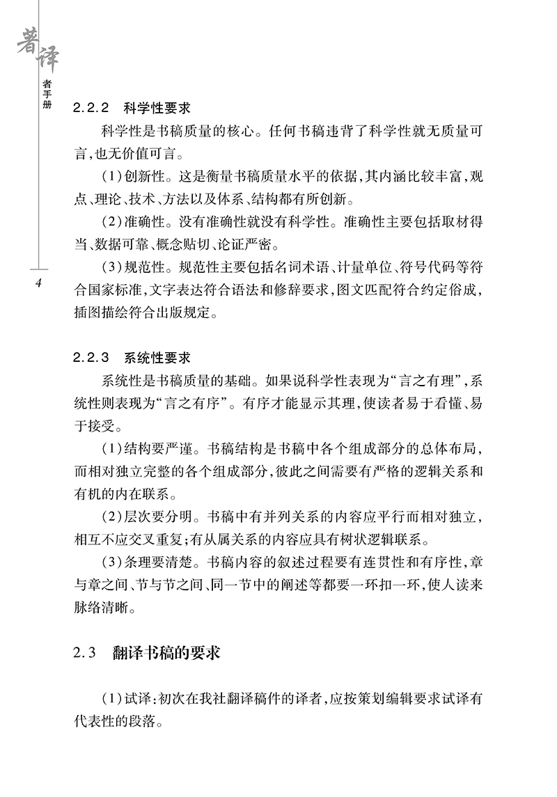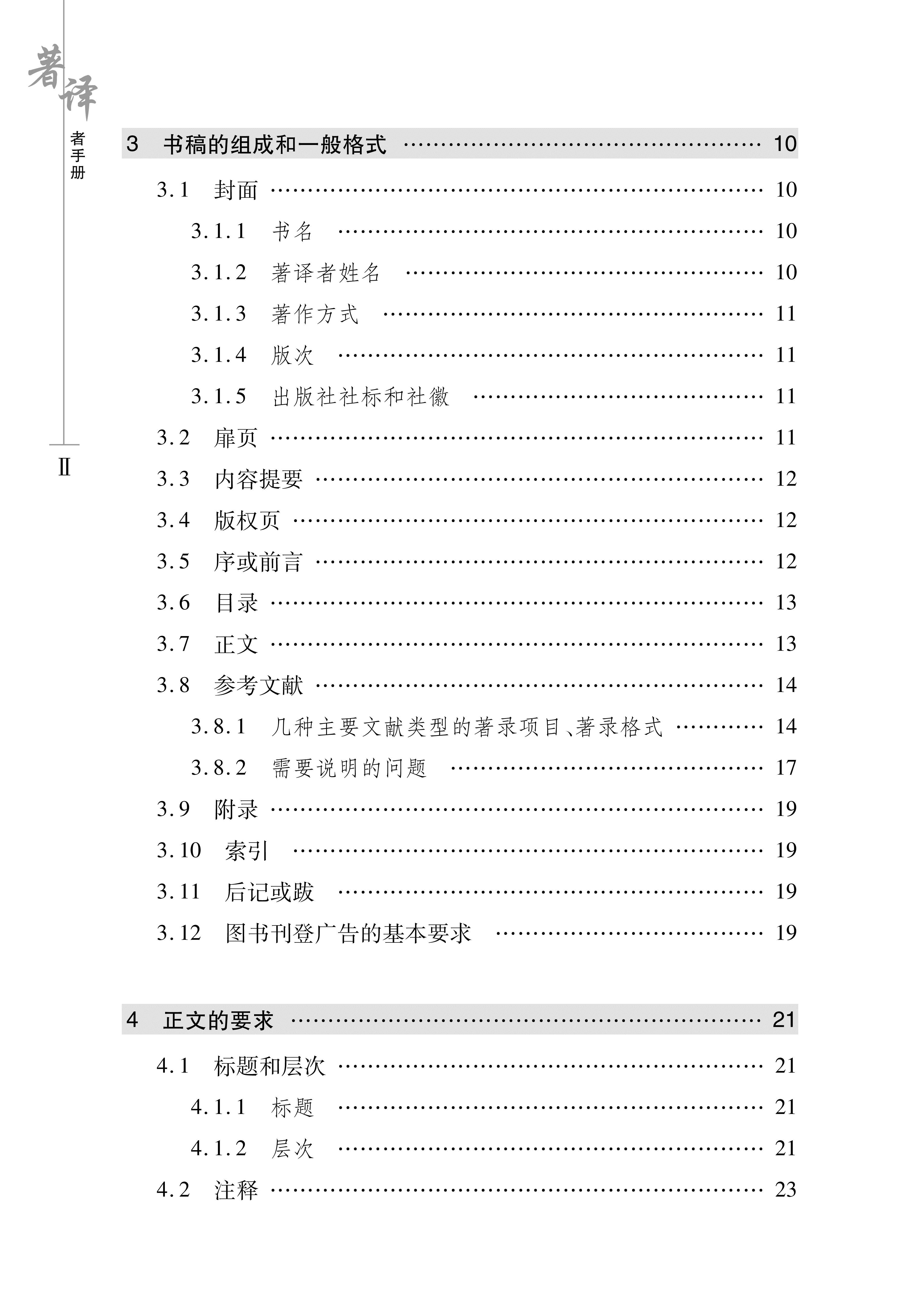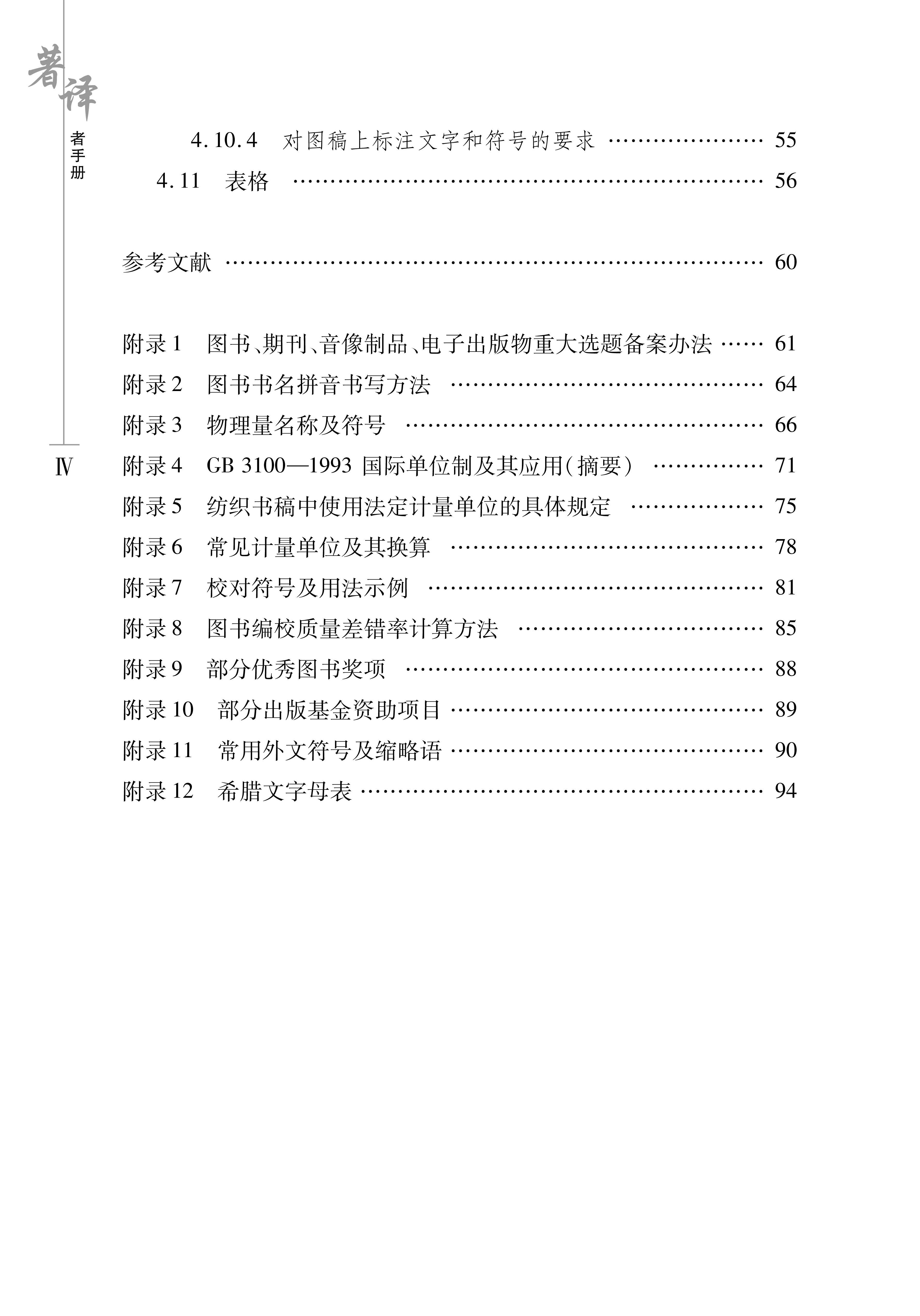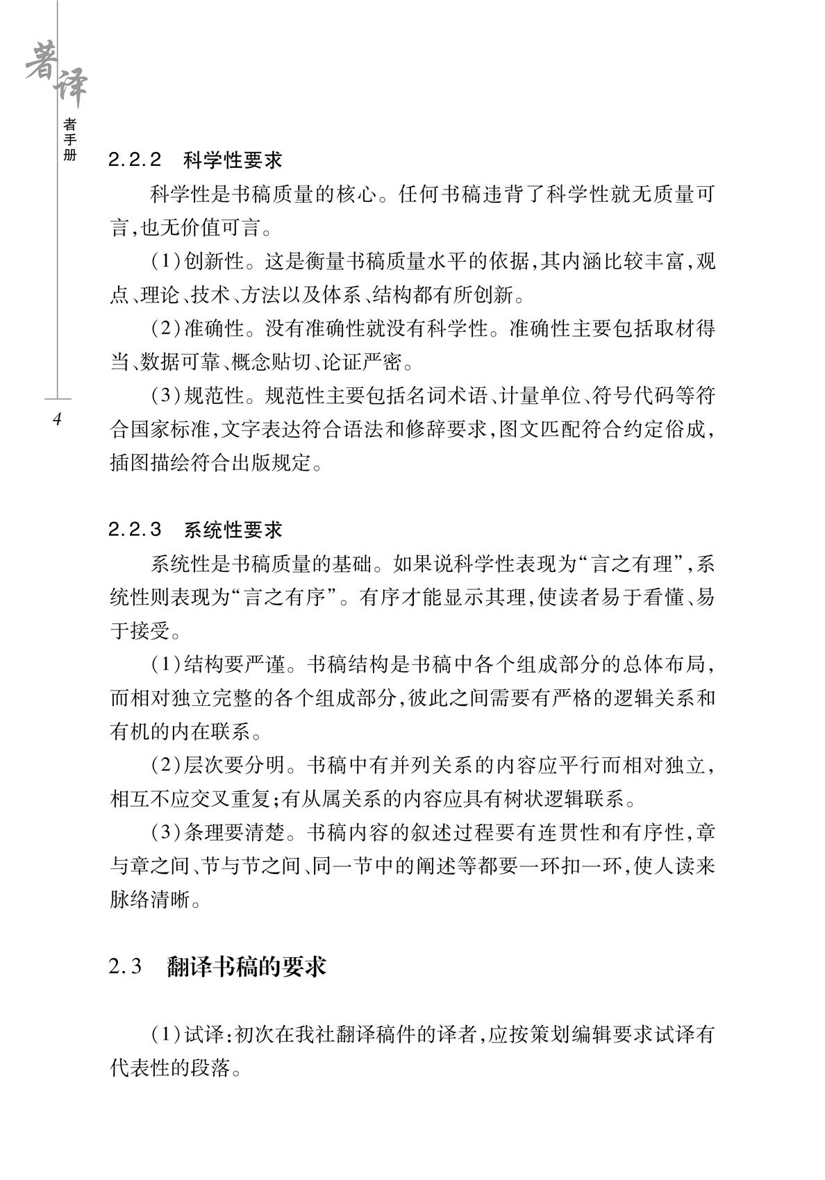 《著译者手册(第4版)》内容简介:编印本手册的目的在于帮助著译者了解和掌握著译书稿的基本规定和有关知识,使书稿达到新闻出版总署和我社的质量要求。我社于1983年、1991年和1998年编印、修订的《著译者手册》曾起到过很好的作用。但近几年来,国家新颁布了许多与图书出版有关的法律、规定和标准,又废止了某些原有规定,原手册中部分内容已不适用。同时,随着计算机技术飞速发展带来的出版模式的变革以及近年来我社图书板块的拓展和出版工作中实践经验的积累等,都需要对本手册进行适当的修改和补充。本次修订,为方便著译者查找和理解,对手册内容、体例结构等进行了全面调整和更新,同时将一些常用标准融入相应的正文内容中并以实例说明;更新了“文后参考文献著录规则”的内容;对各专业易混淆字词的用法分类列表汇总,对部分字词进行了辨析;在正文首页列出了我社出版流程框图,明确标注了著译者需要参与的环节。随着计算机技术的普及,手写稿退出历史舞台,我社相应调整了对打印书稿及其电子文件的交稿要求,并明确了电子出版物、音像制品的交稿要求。手册中的其他内容也有部分增删。编辑推荐《著译者手册(第4版)》是由中国纺织出版社出版的。