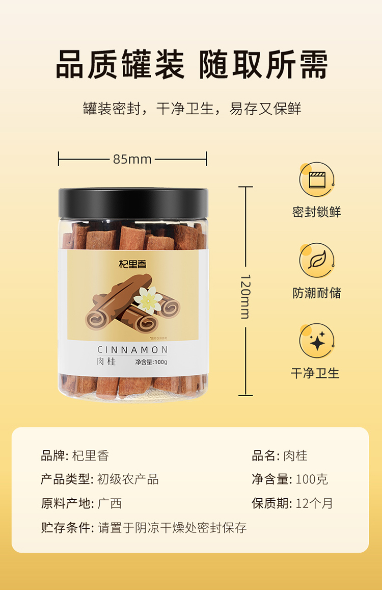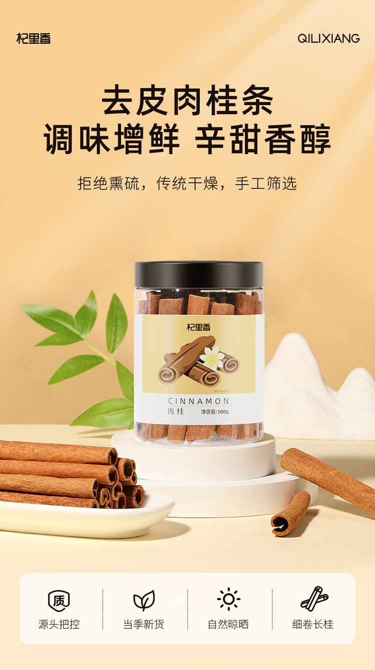 杞里香100g瓶装肉桂道地广西当季新货肉桂颜色自然棕黄,香气自然浓郁一桂多用,家中常备,煲汤炒菜,泡茶