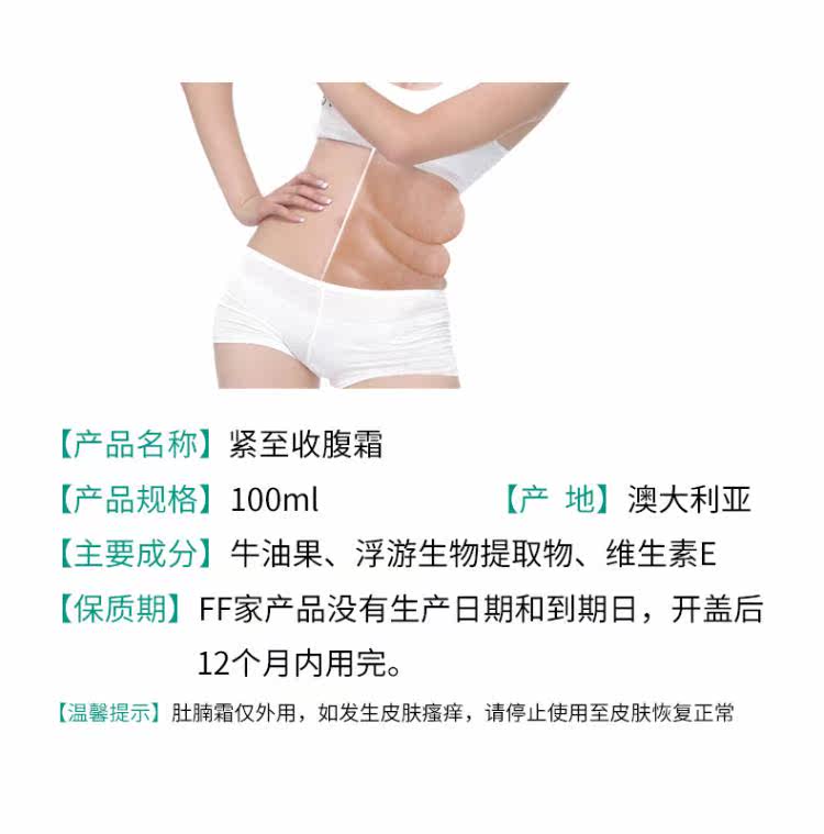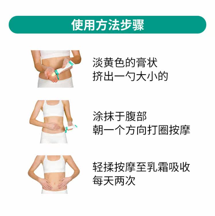 一天两次,早晚在腰腹部打圈按摩,按摩至吸收后等待1-2分钟后再穿衣服。晚上在沐浴后使用效果更佳。只能外用,如有皮肤不适,请停止使用直至皮肤恢复正常。