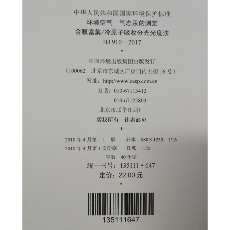 HJ 910—2017环境空气 气态汞的测定 金膜富集/冷原子吸收分光光度法 国家标准GB 环境保护 环境科学 135111647