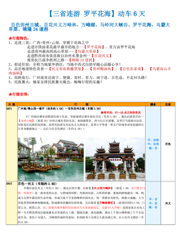 【游 三省连游 罗平花海 】 动车 6 天 百色田州古城、百花兴义万峰林、万峰湖、马岭河大峡谷、罗平花海、乌蒙大 草原、晴隆 24 道拐