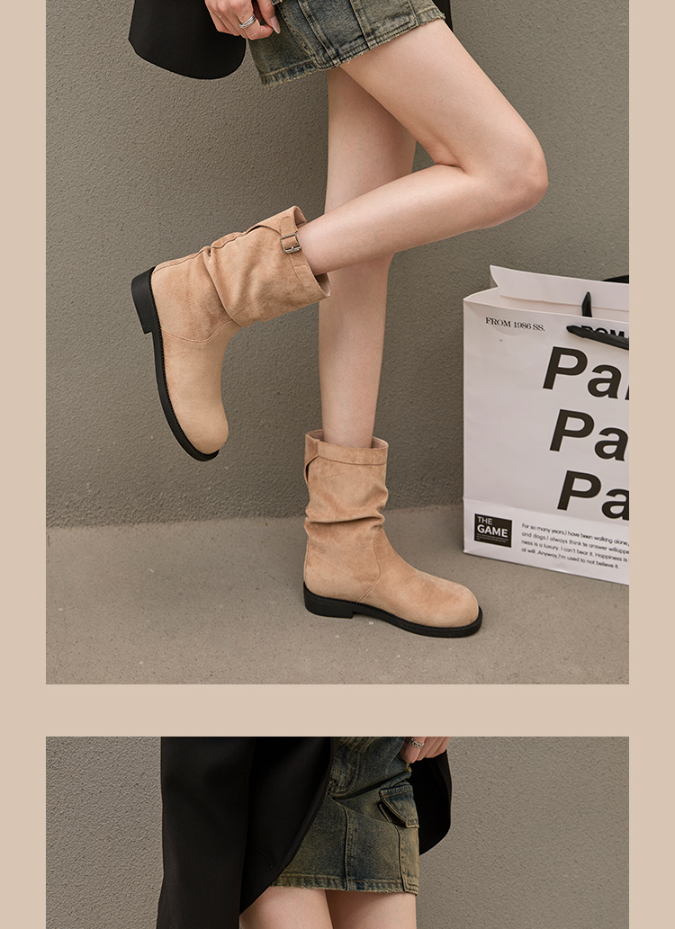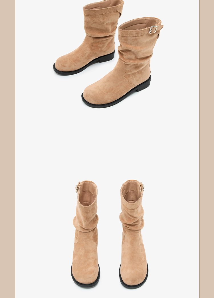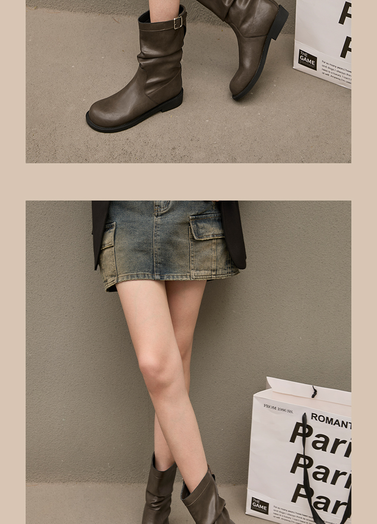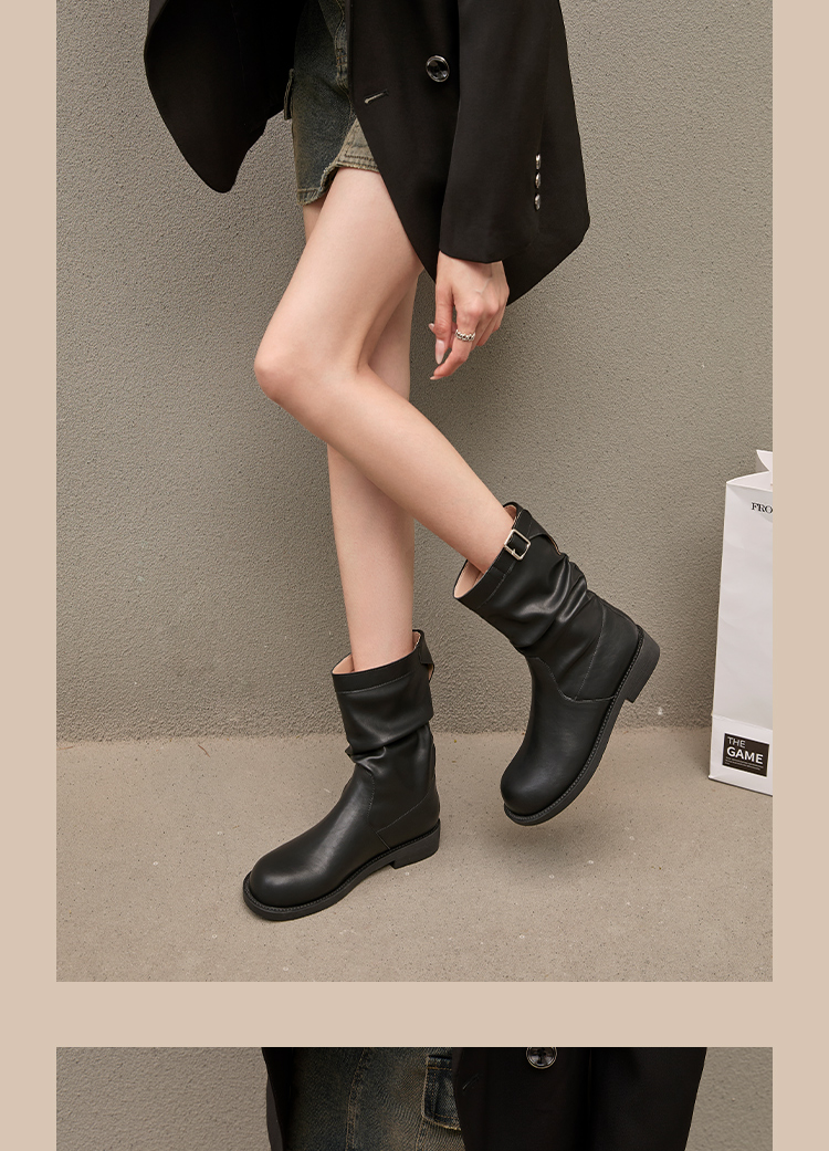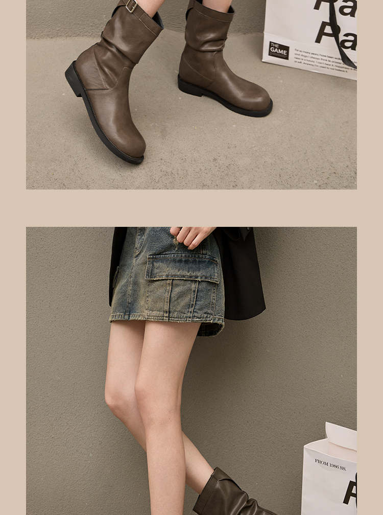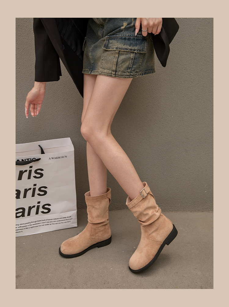 西遇复古中筒骑士靴女新款秋季英伦风圆头褶皱堆堆靴棕色短靴D0047435