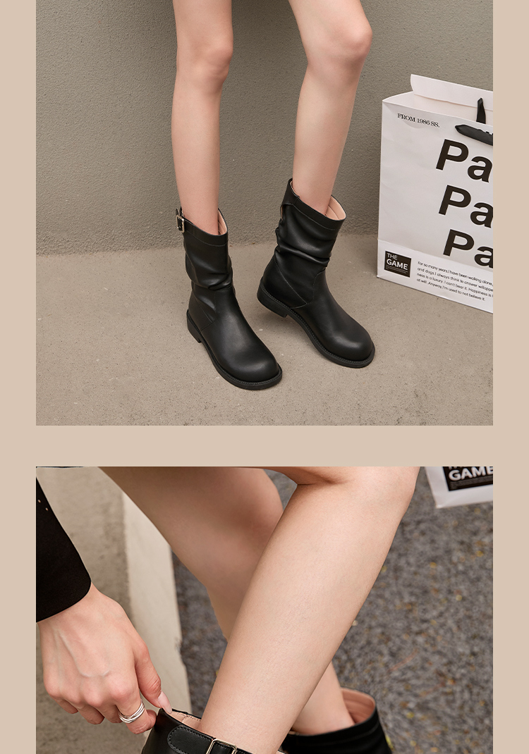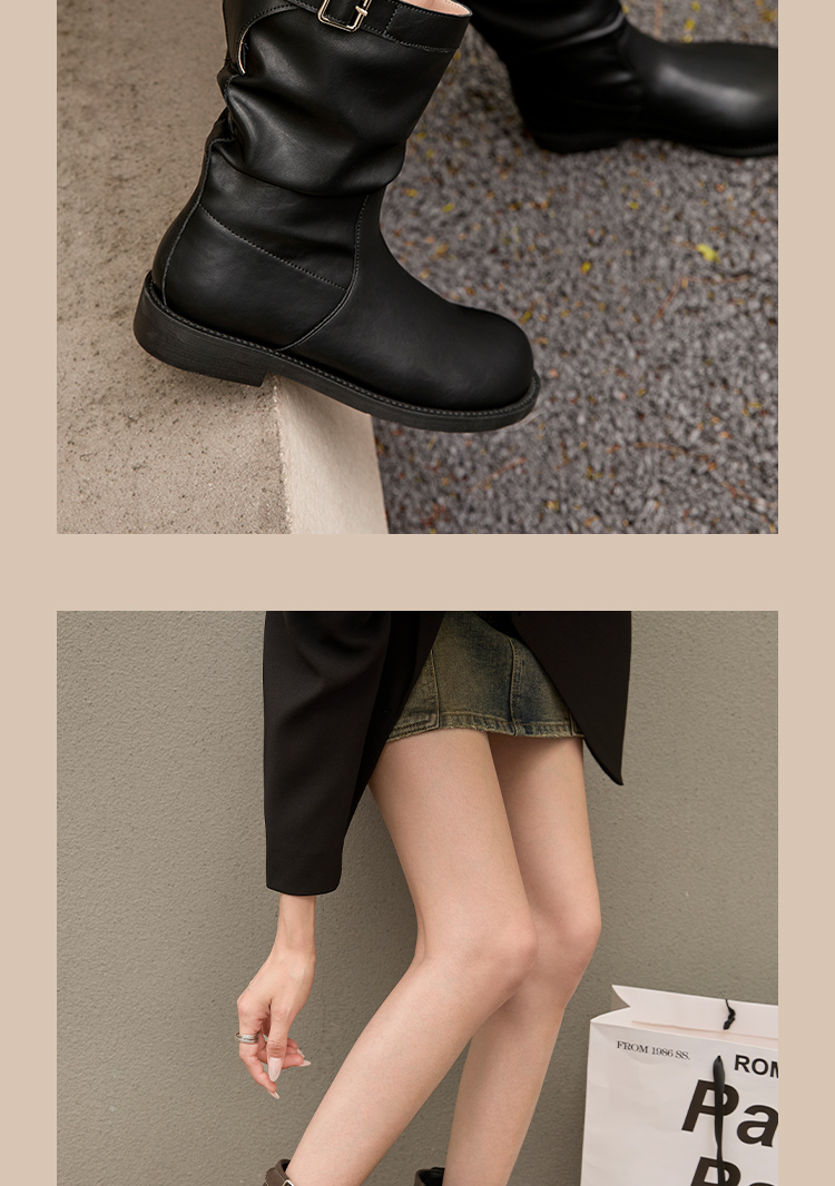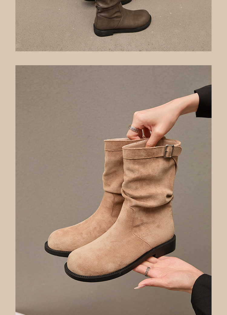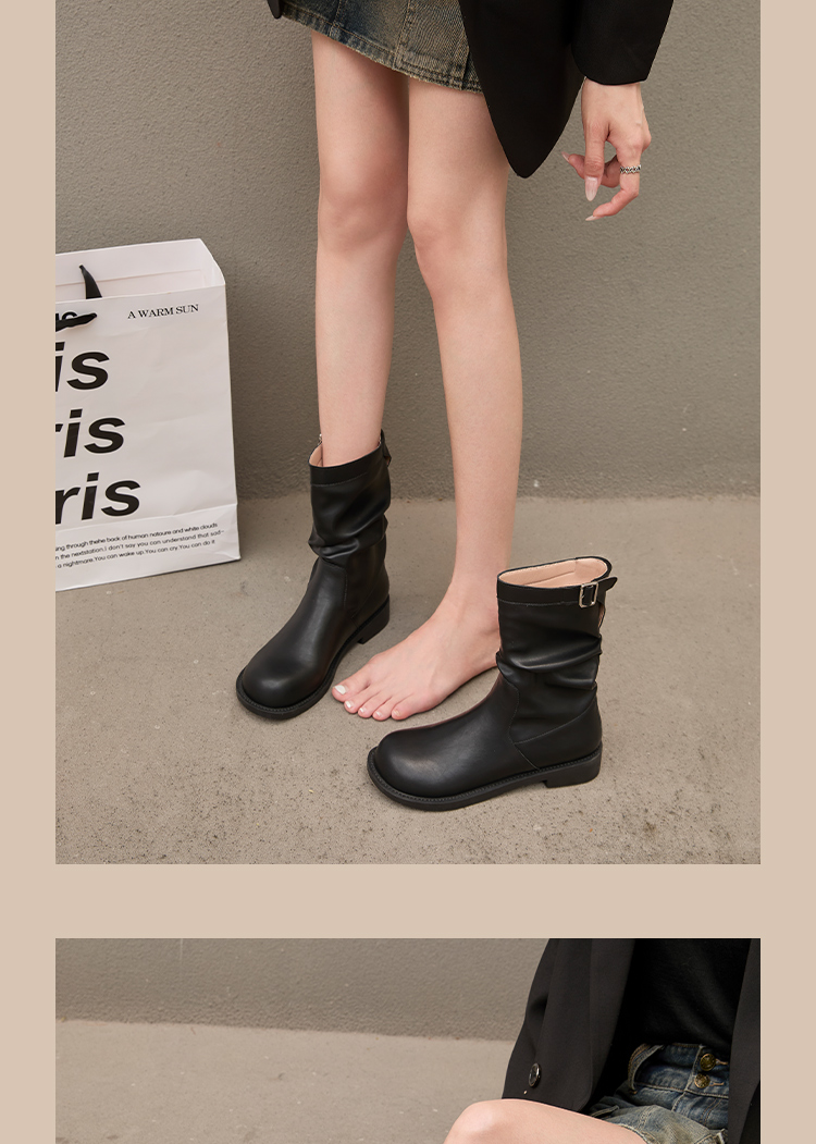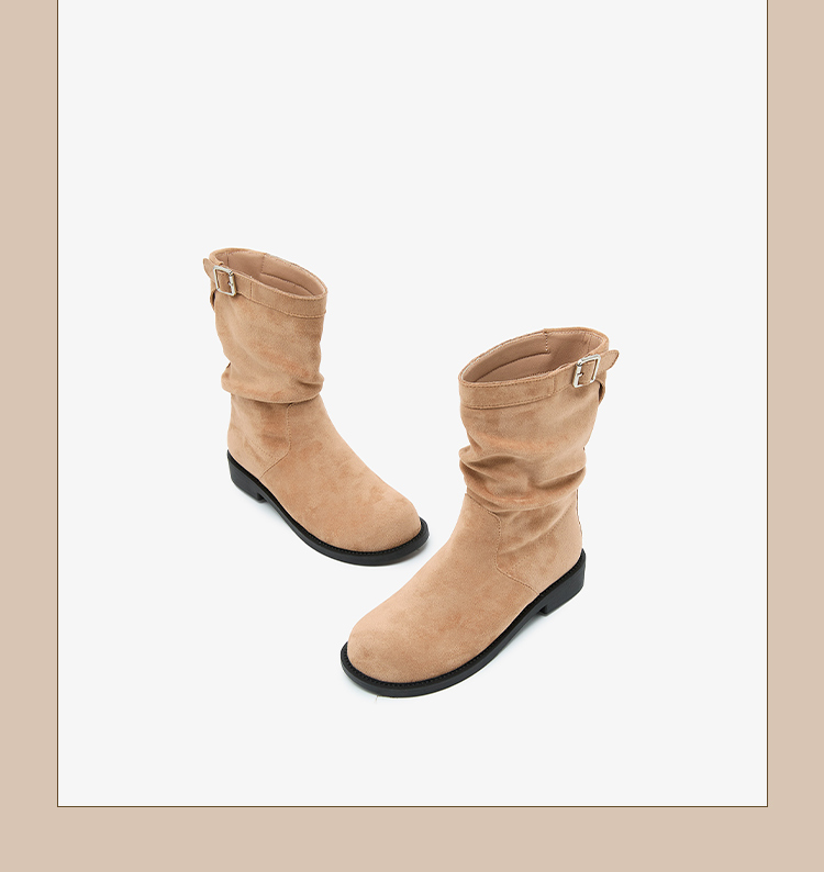 西遇复古中筒骑士靴女新款秋季英伦风圆头褶皱堆堆靴棕色短靴D0047435