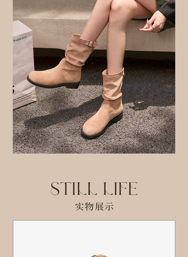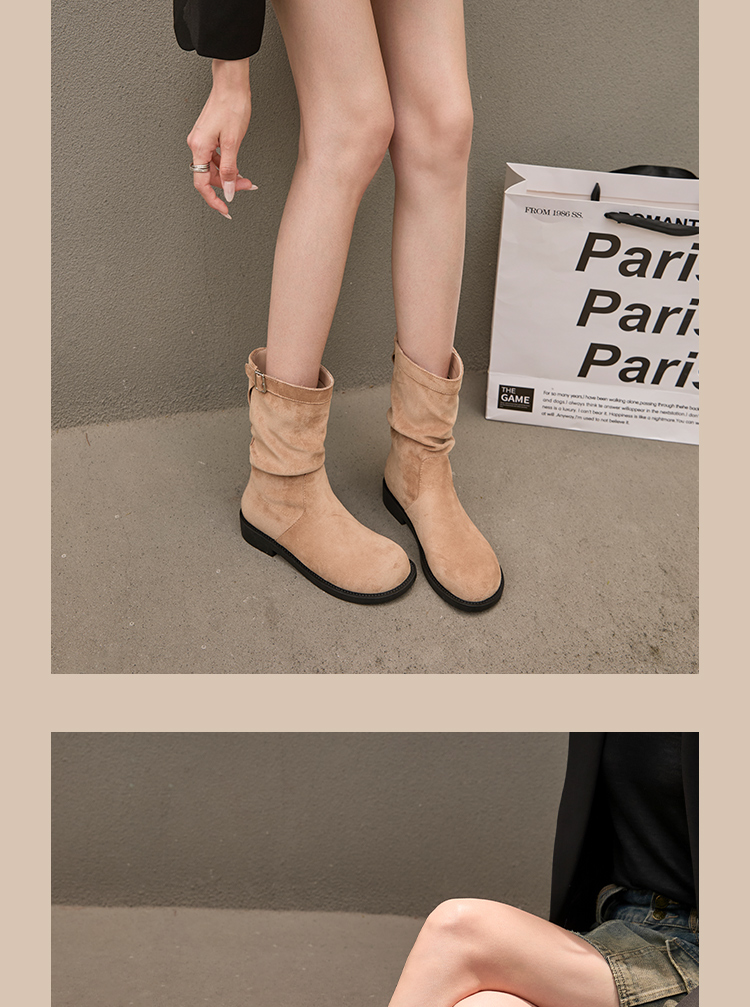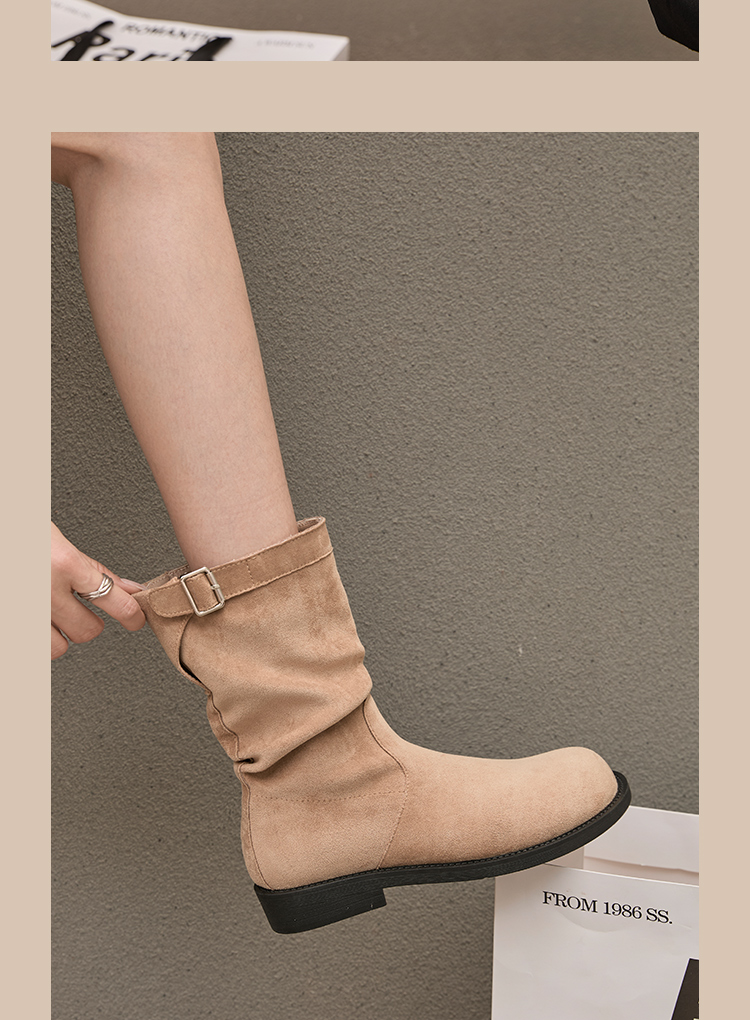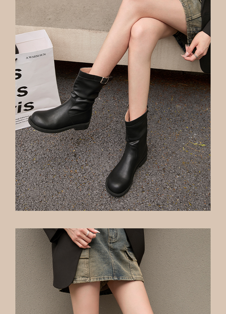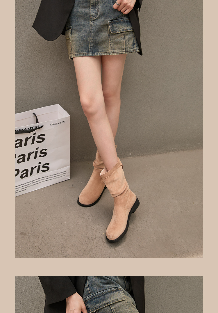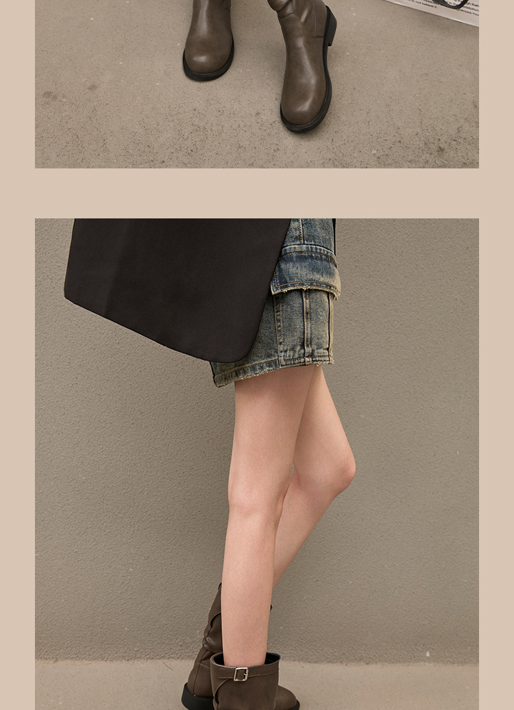 西遇复古中筒骑士靴女新款秋季英伦风圆头褶皱堆堆靴棕色短靴D0047435