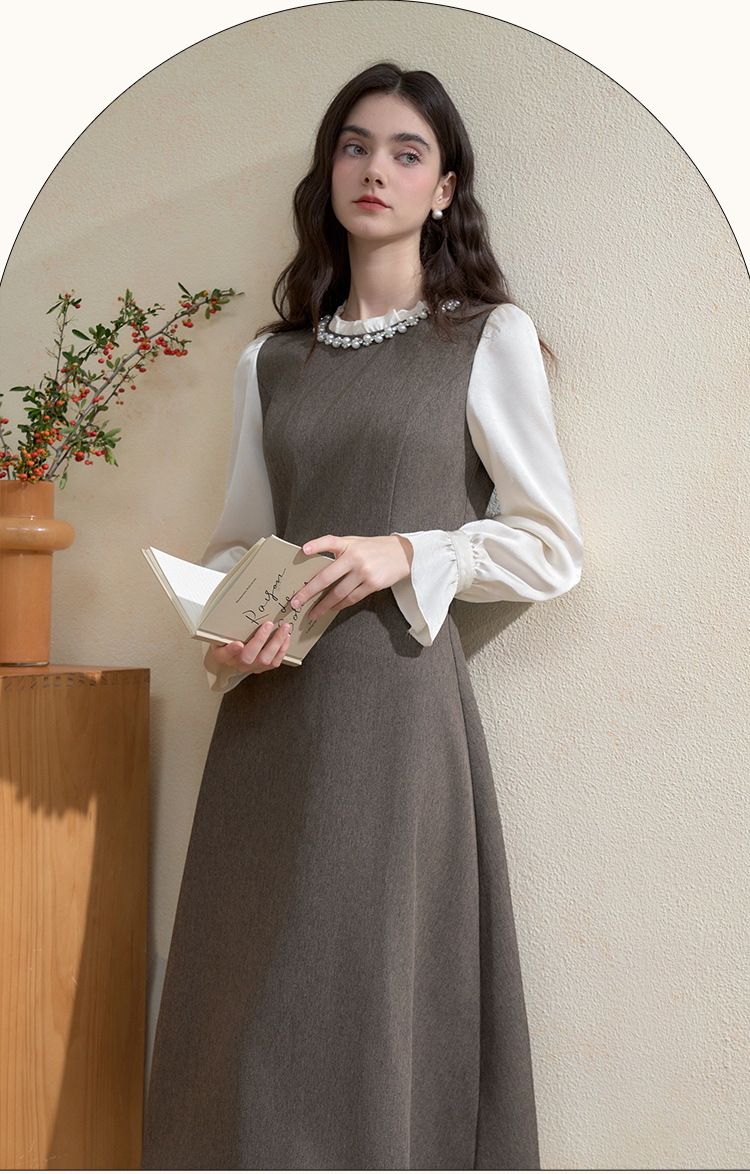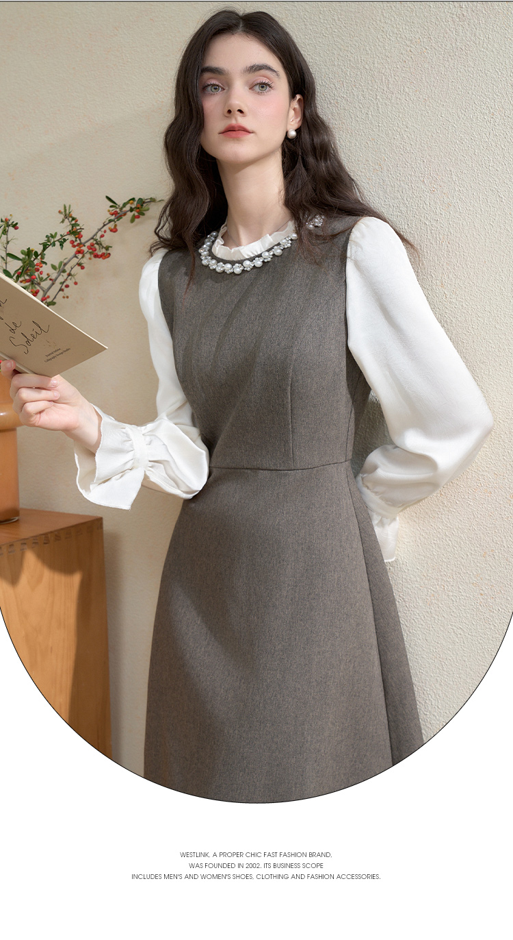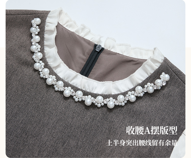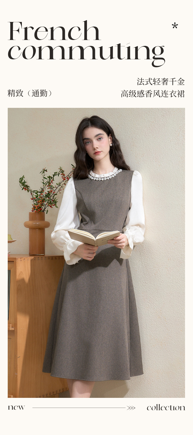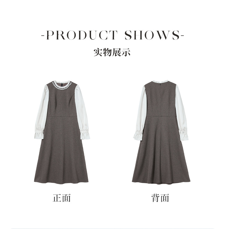 西遇法式名媛钉珠领口高级感通勤连衣裙女秋季假两件A字长裙V2951222