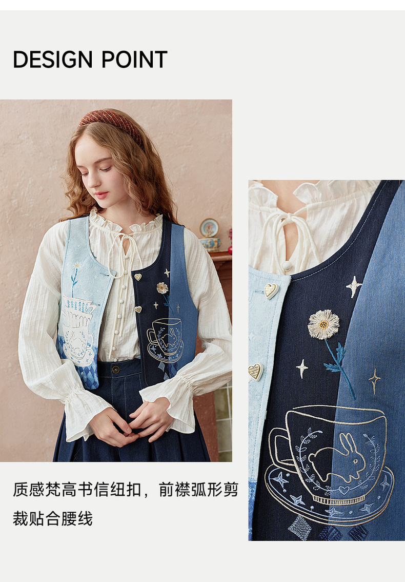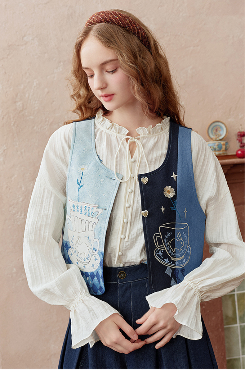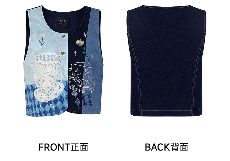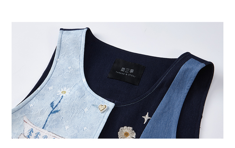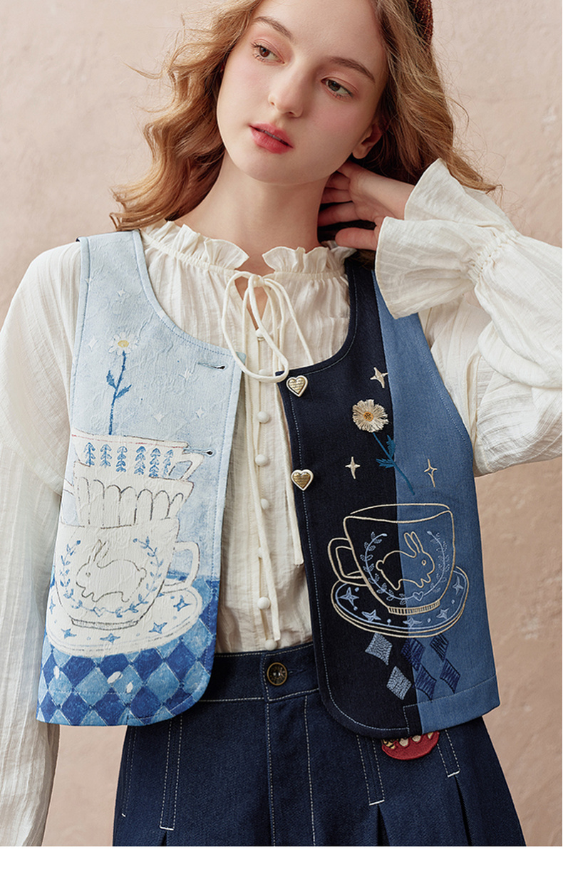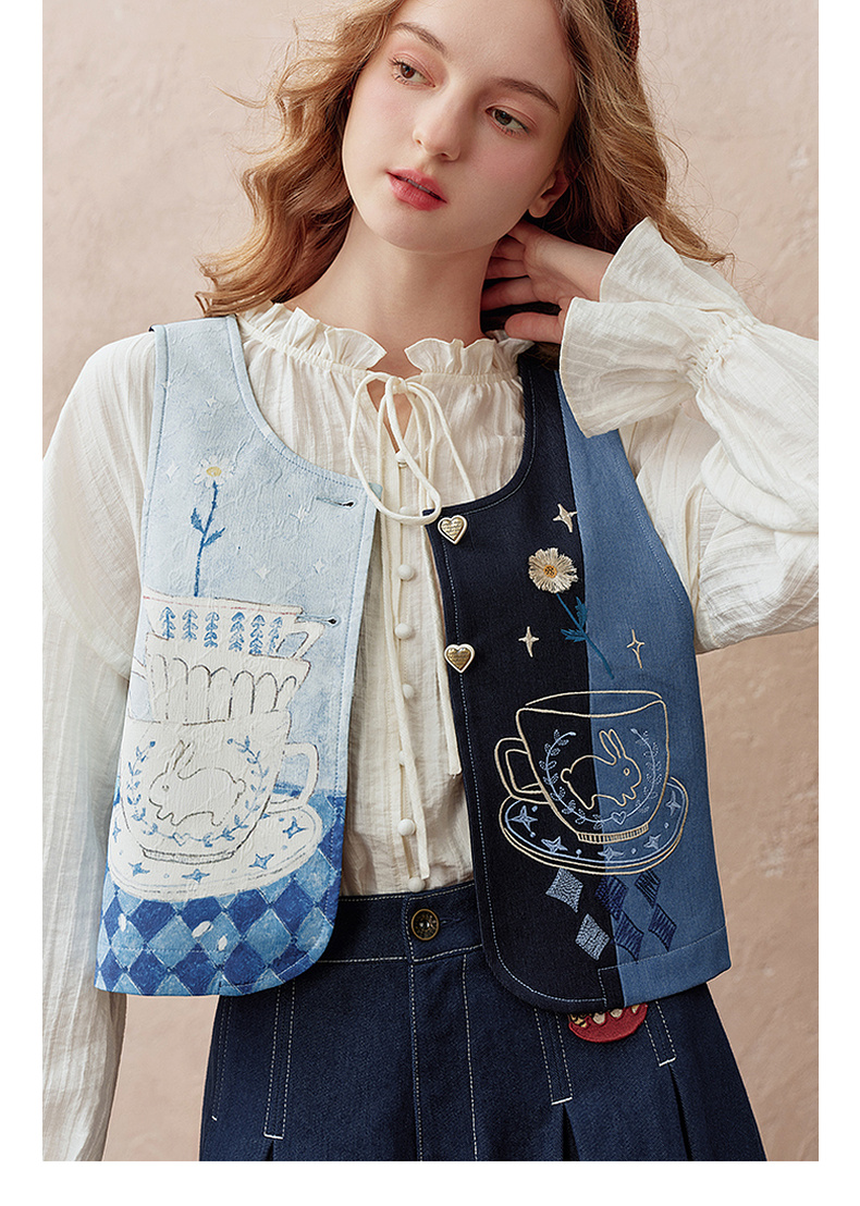 两三事晴兔茶叙2025秋季新款复古印花刺绣拼色短款马甲女宽松马夹