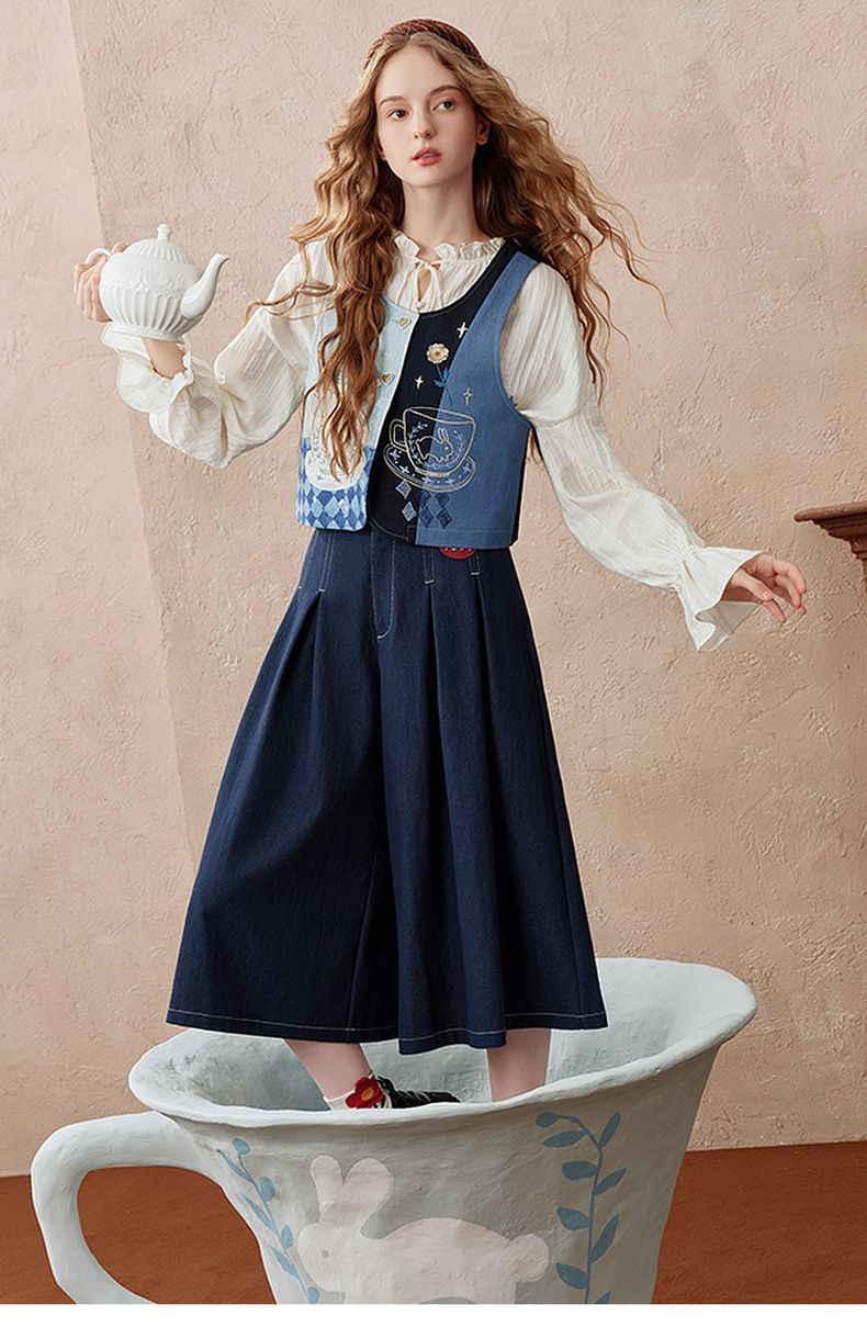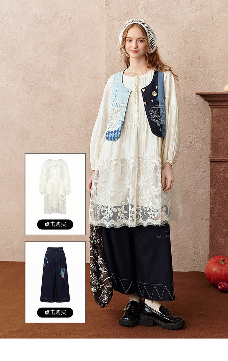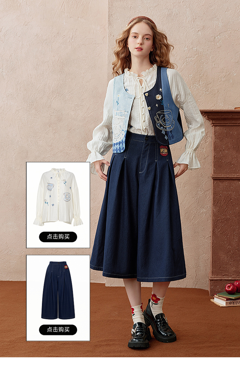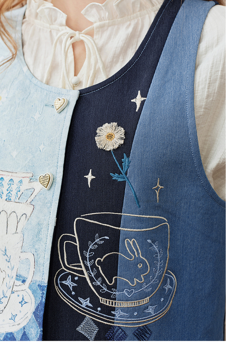 两三事晴兔茶叙2025秋季新款复古印花刺绣拼色短款马甲女宽松马夹