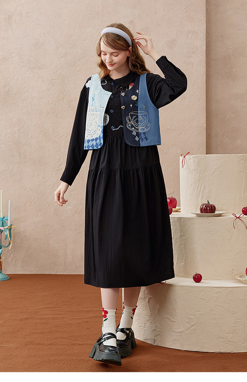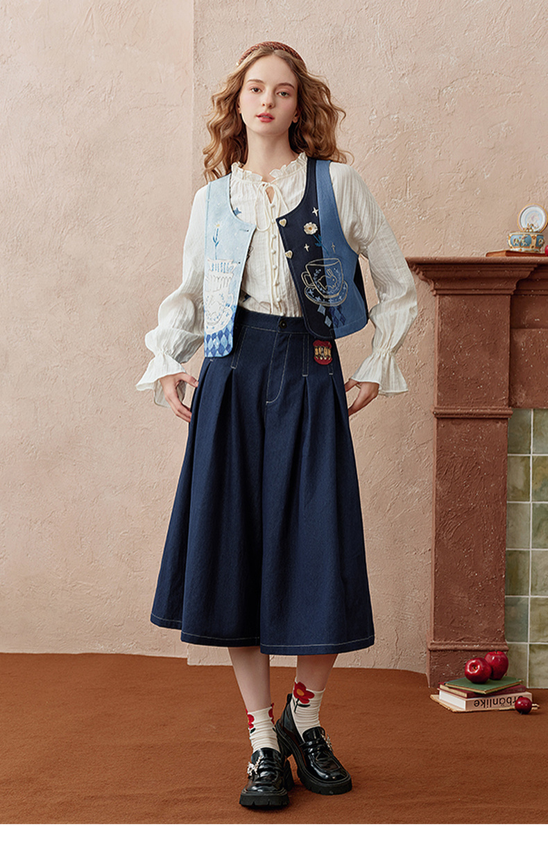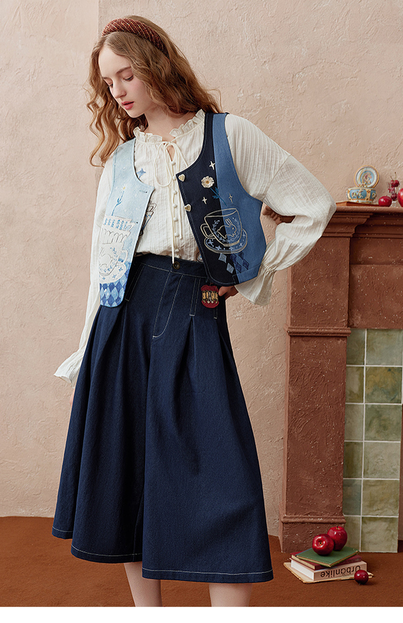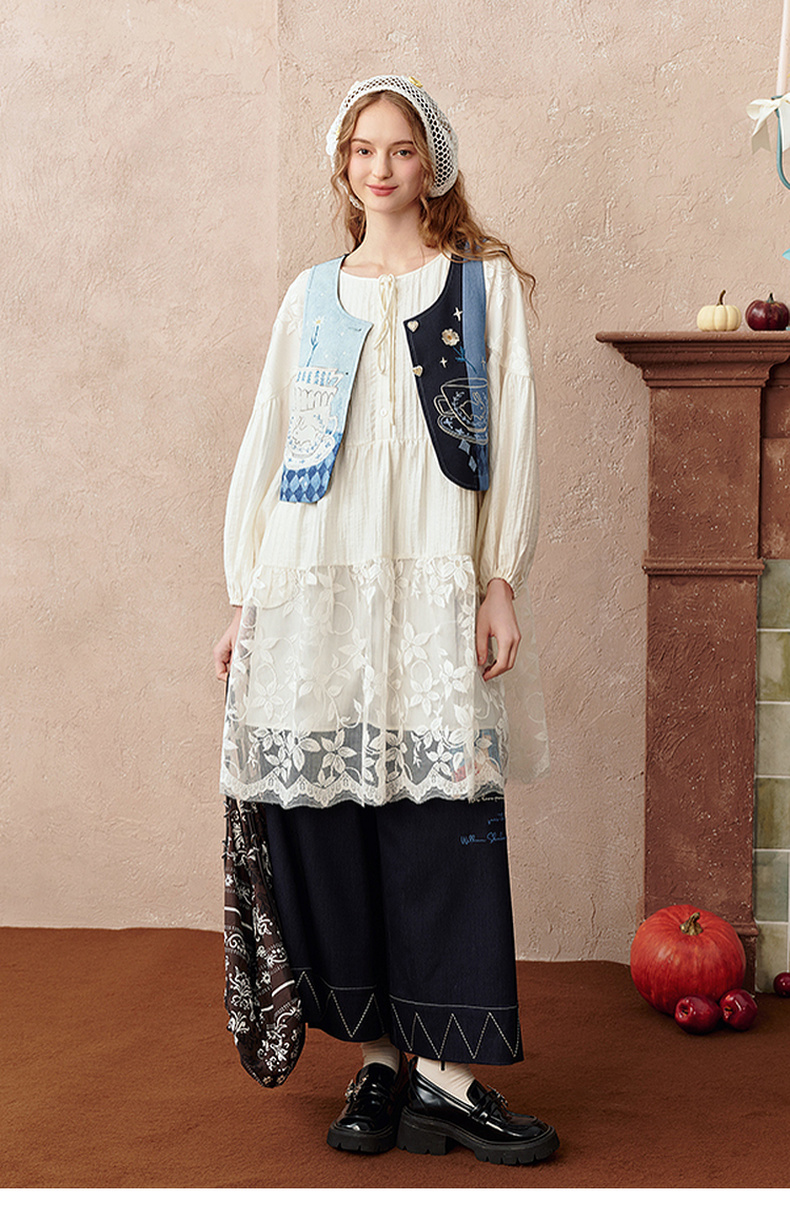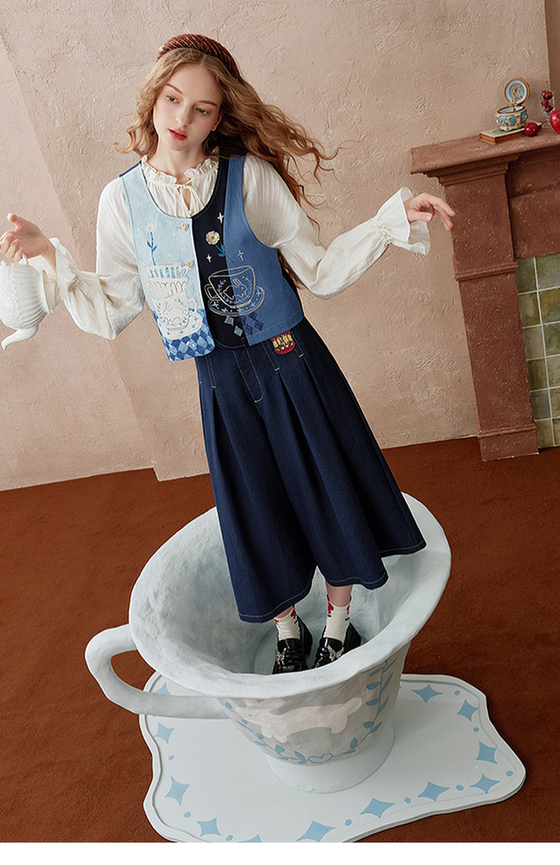 两三事晴兔茶叙2025秋季新款复古印花刺绣拼色短款马甲女宽松马夹