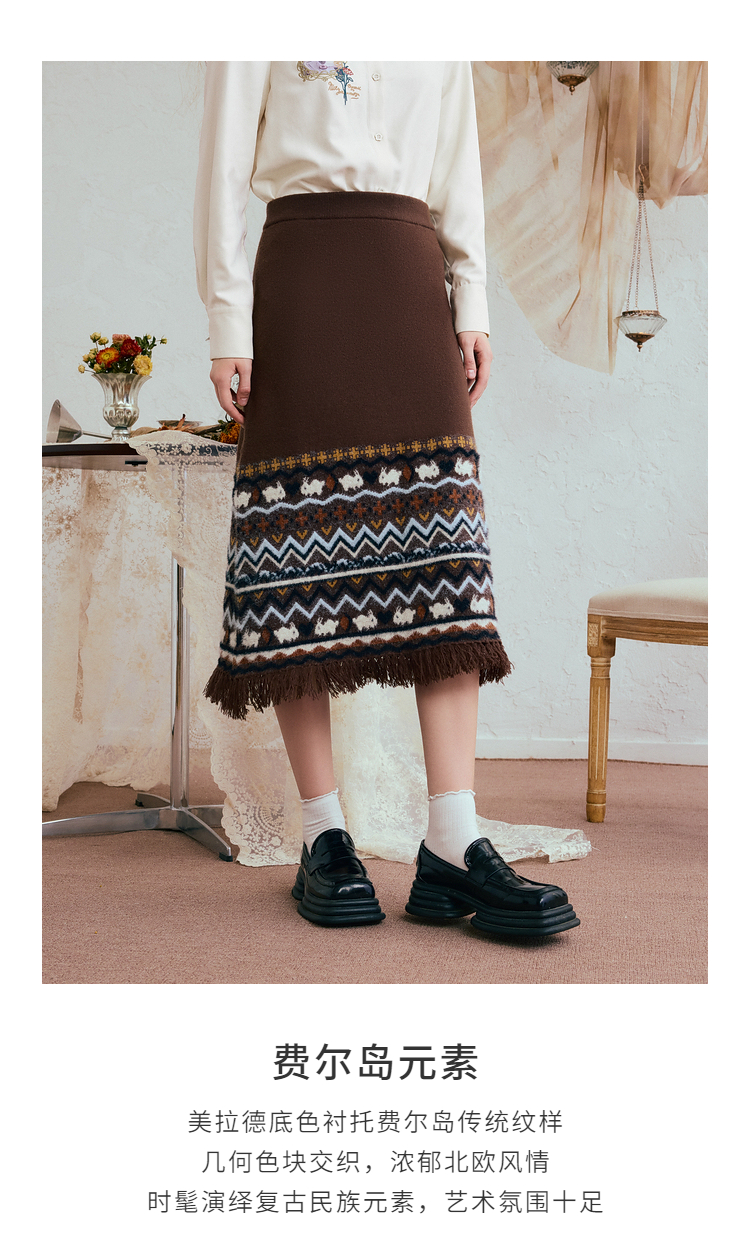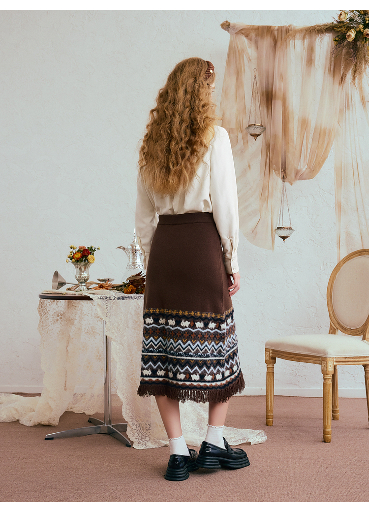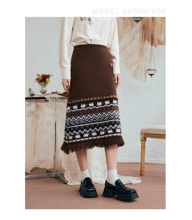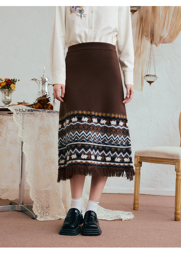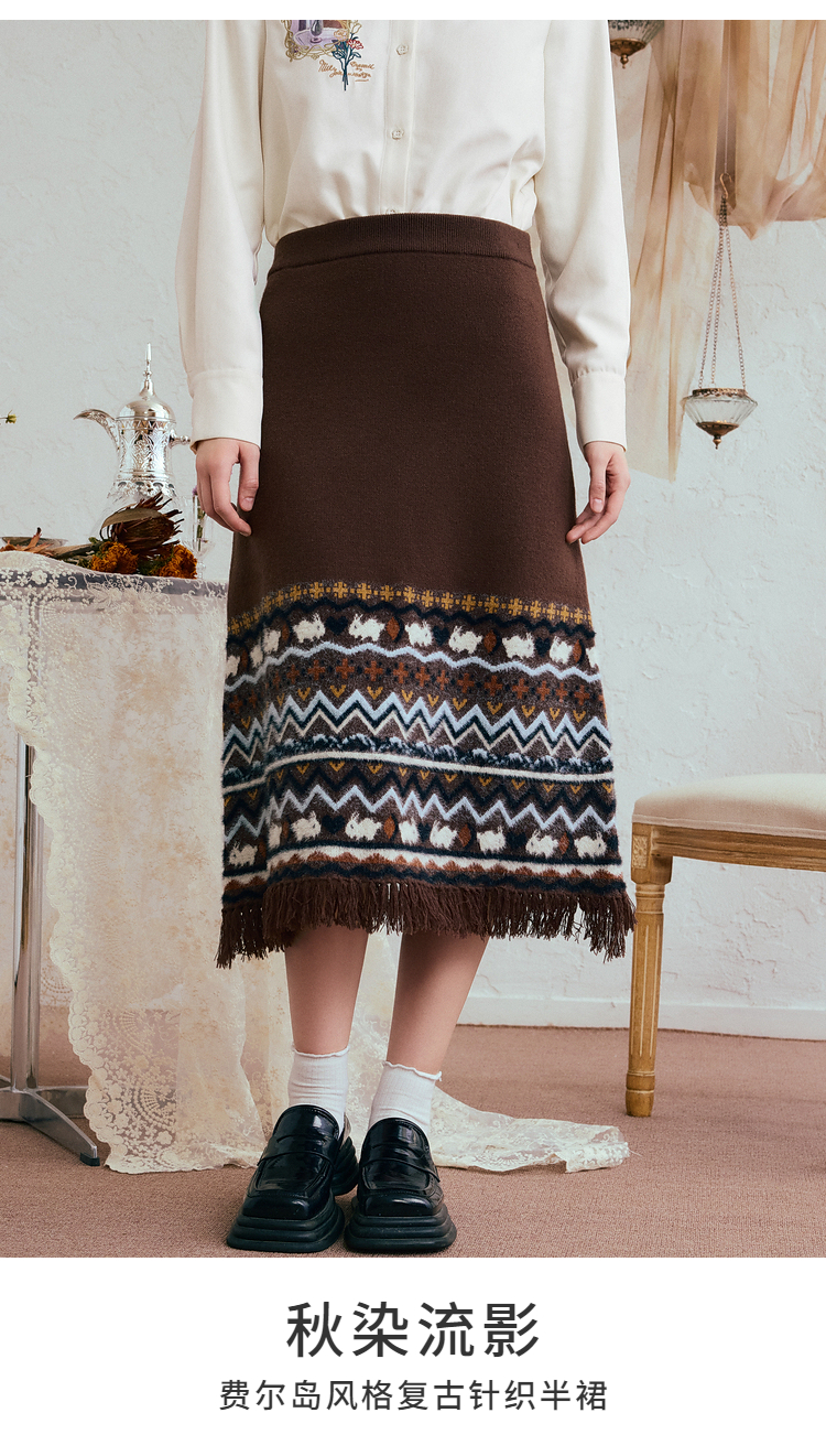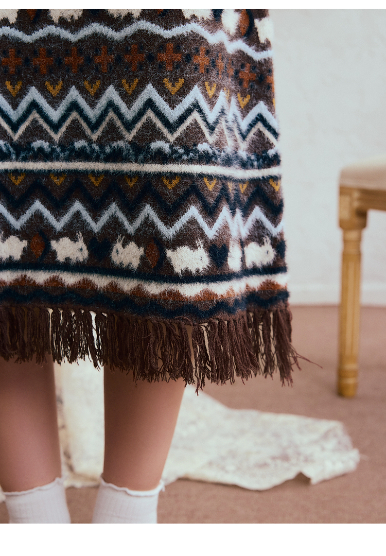 两三事秋染流影2025冬季新款复古小兔几何图案流苏裙摆毛织半身裙