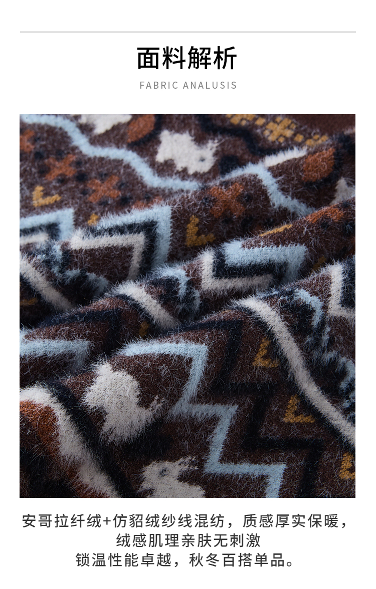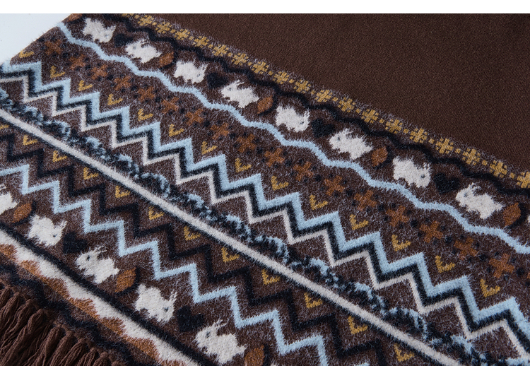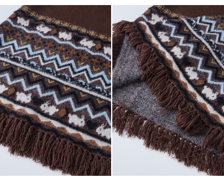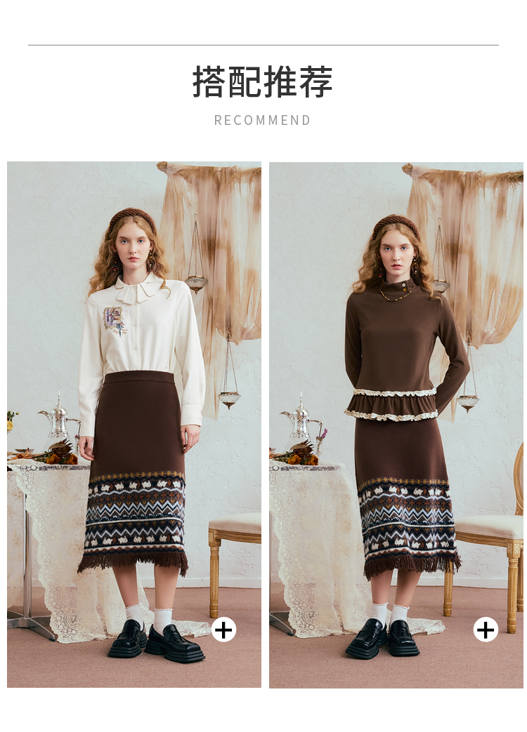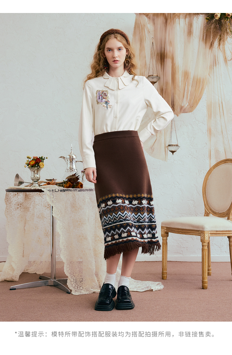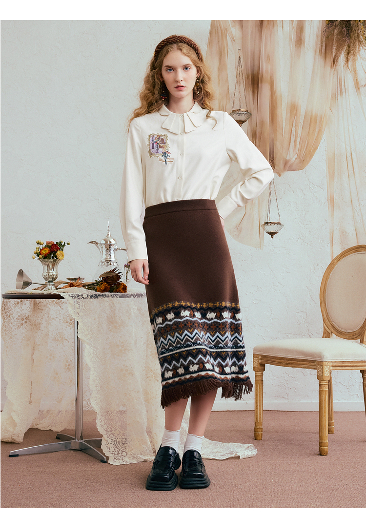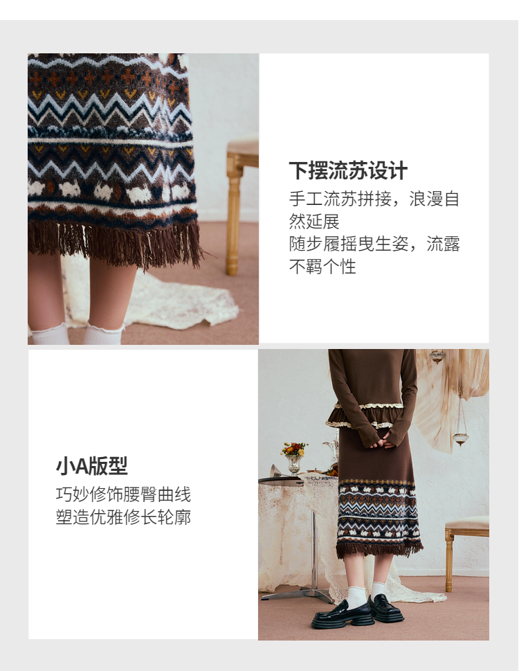 两三事秋染流影2025冬季新款复古小兔几何图案流苏裙摆毛织半身裙