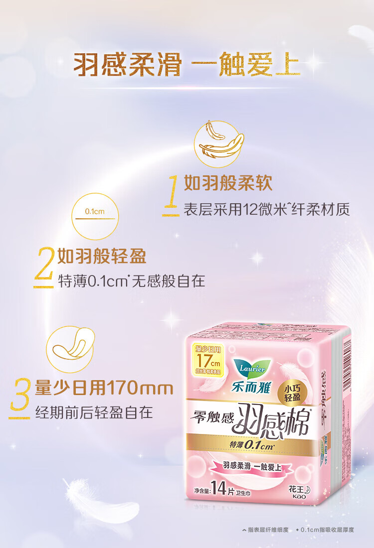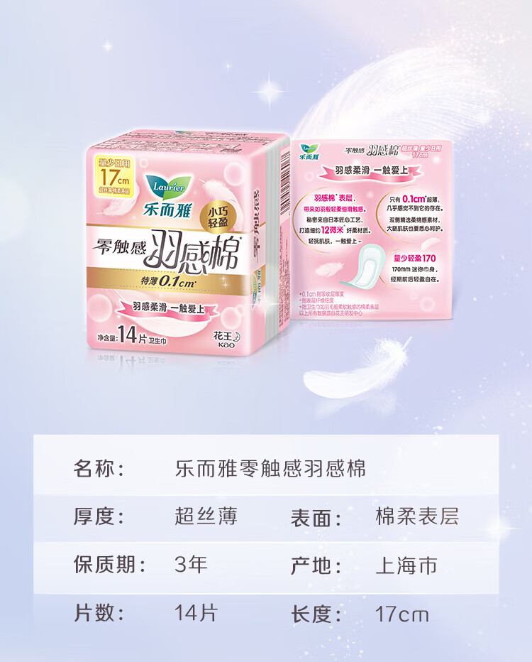 乐而雅零触感羽感棉17cm迷你卫生巾14片/包