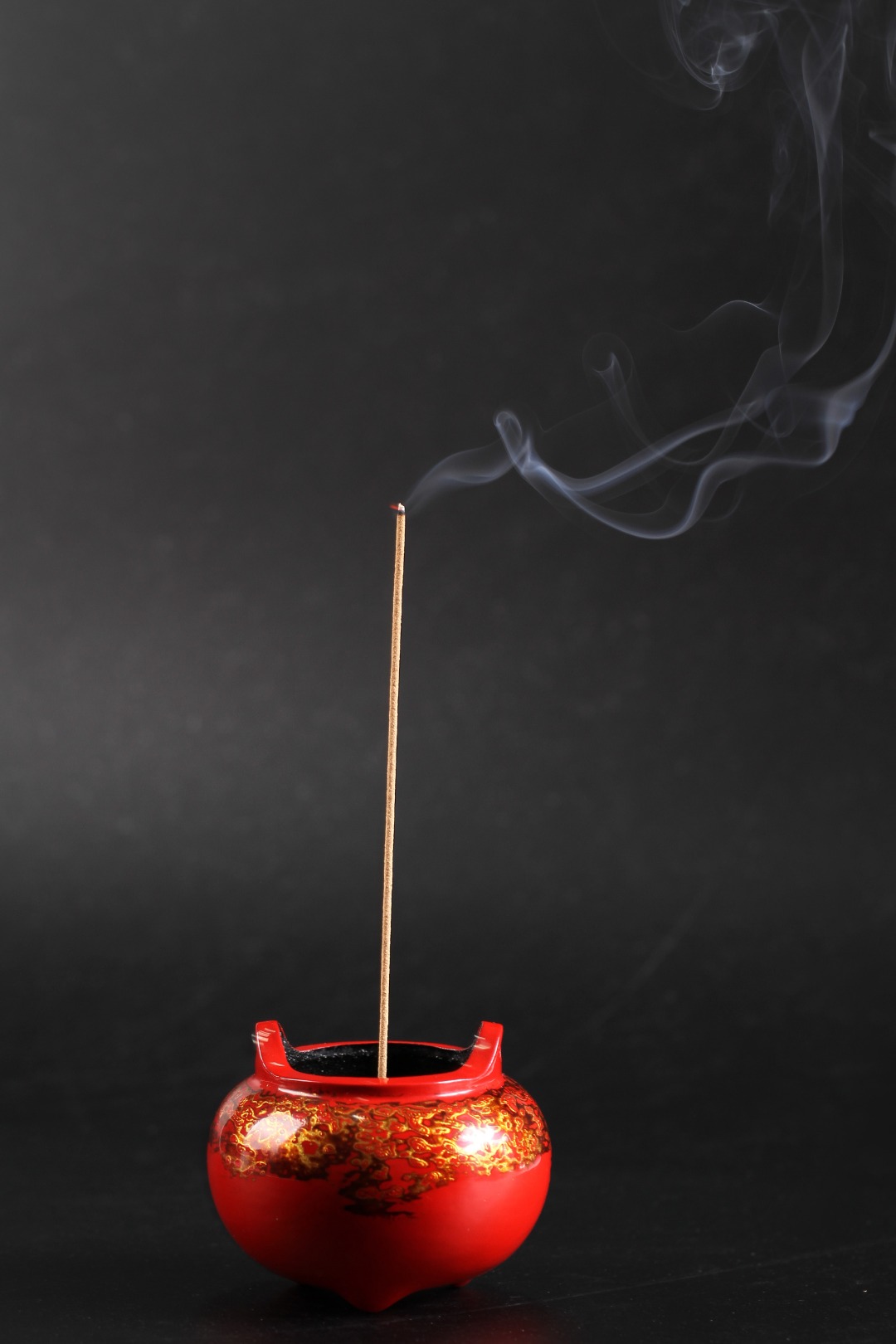 器型依明朝宣德炉而制,轮廓清晰,古朴厚重,炉体丰满,宽口鼓腹,底部饰以经典三足乳,比例匀称,搭配协调,双耳直立向上,颇具上古礼器之遗韵,有敬天法祖之意,端庄大气,表面色彩手作髹漆,散金平脱,以金、螺碎片散布其中,精细密致,随彩光华,陈设雅致,于青烟中静享其乐。