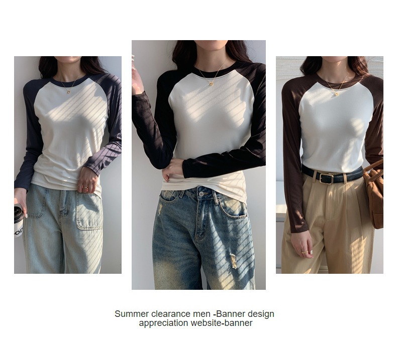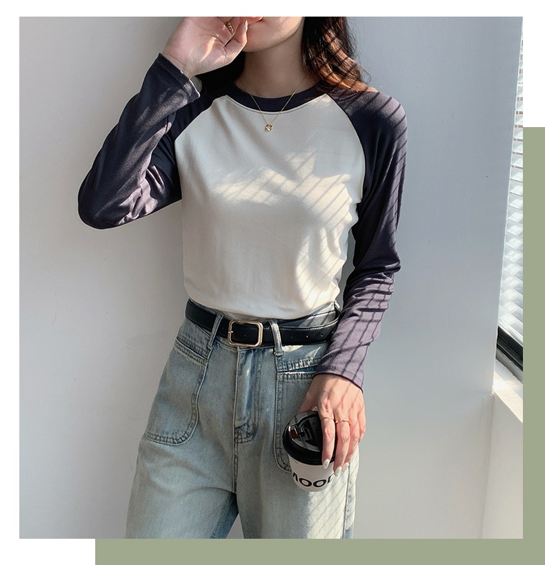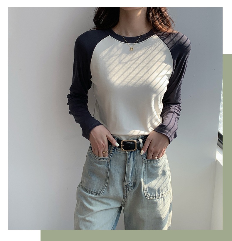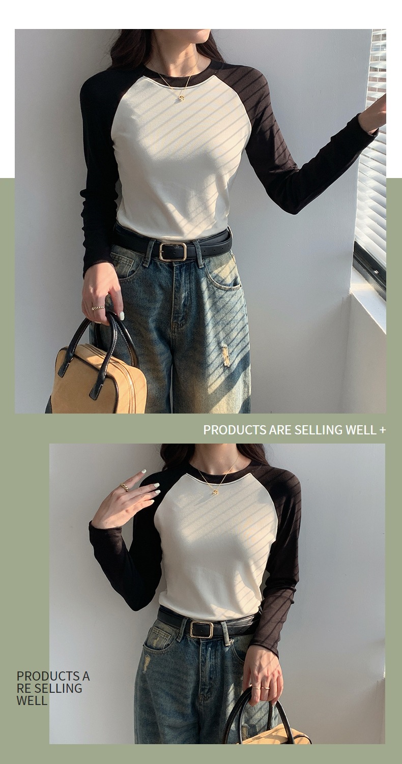 2024秋冬新款圆领撞色打底衫女韩版修身显瘦拼接打底上衣插肩袖 商品图2