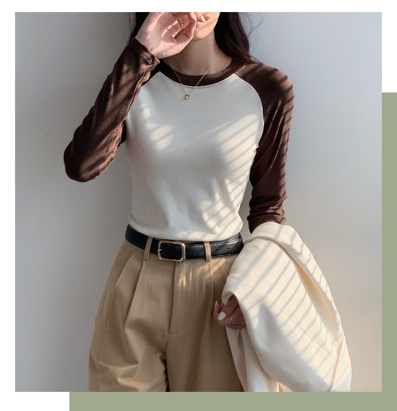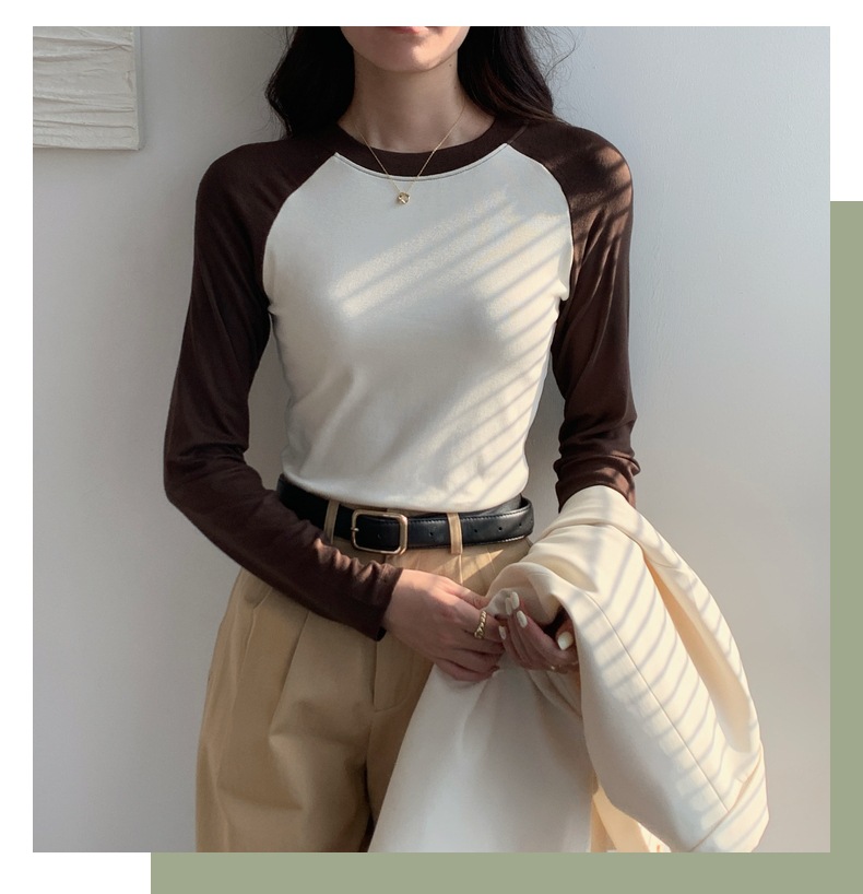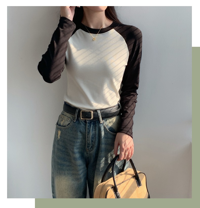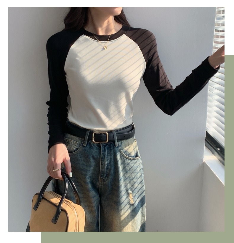 2024秋冬新款圆领撞色打底衫女韩版修身显瘦拼接打底上衣插肩袖 商品图1