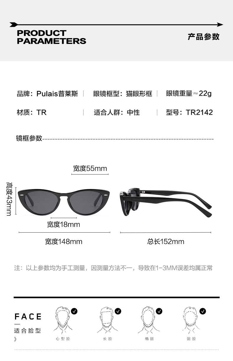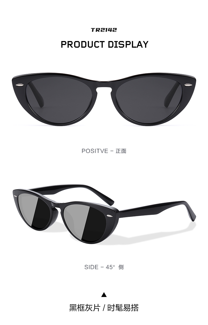 普莱斯太阳镜TR2142 修颜不挑脸 偏光超黑 猫眼型框 双色可选