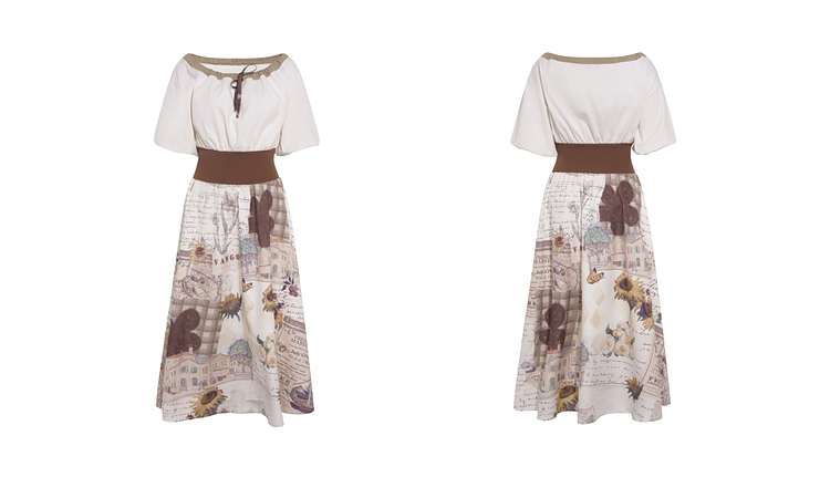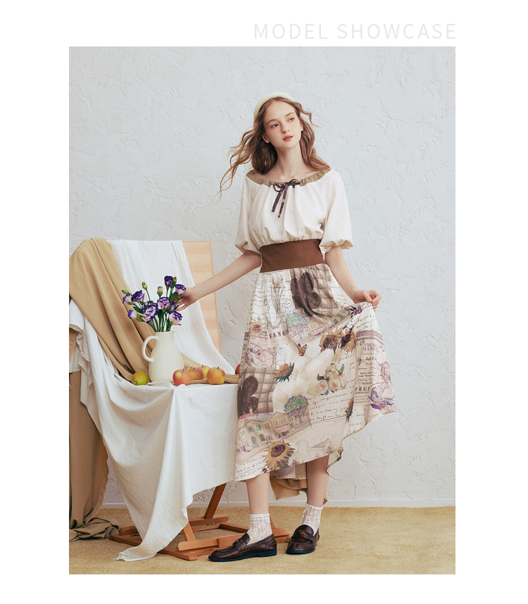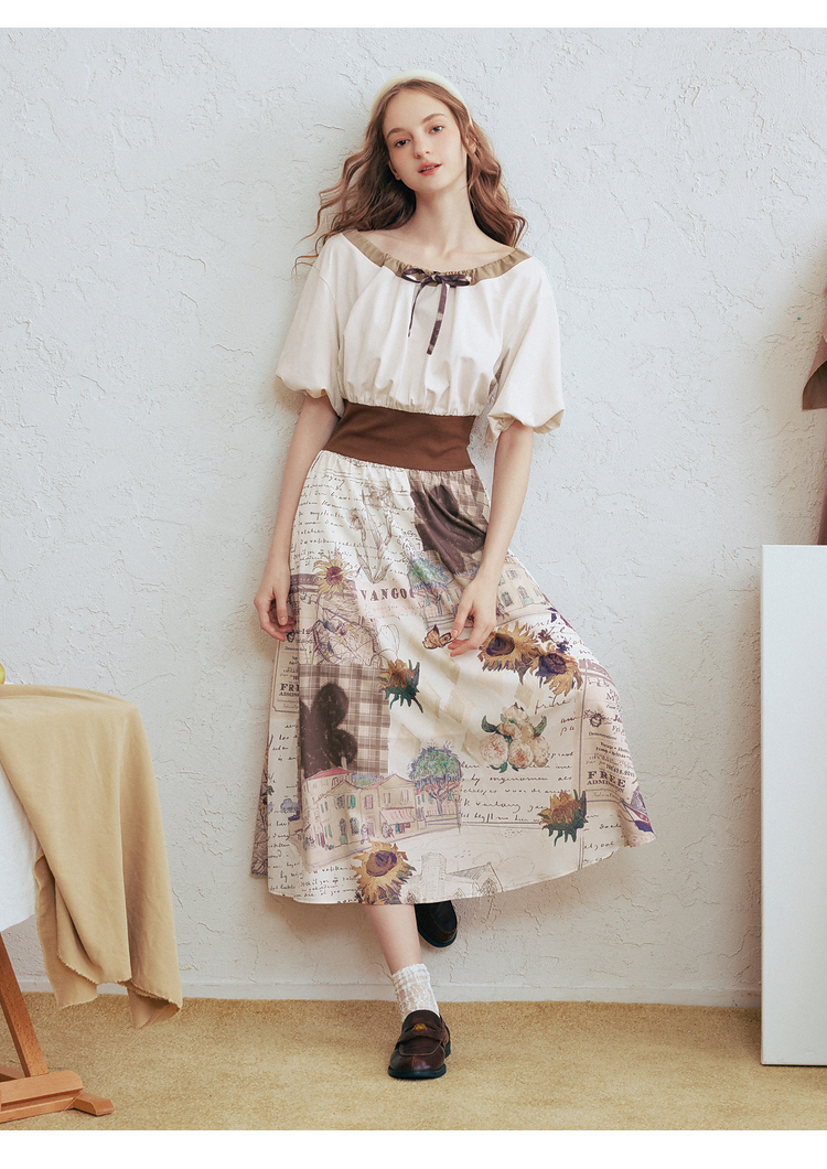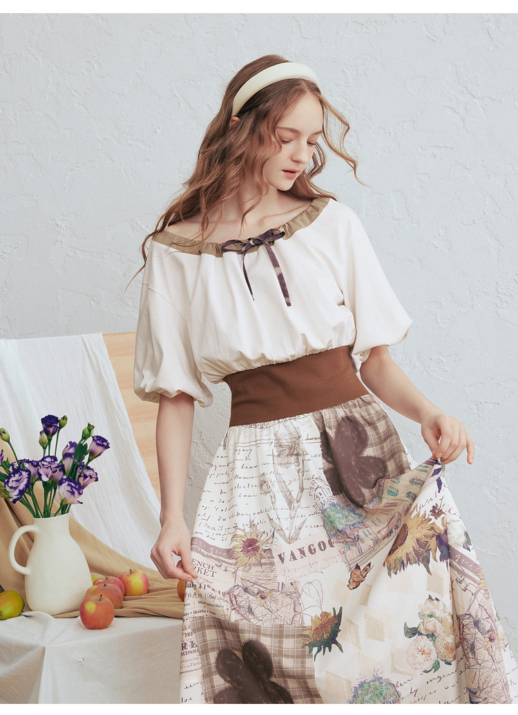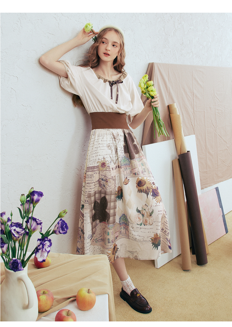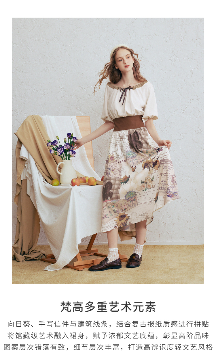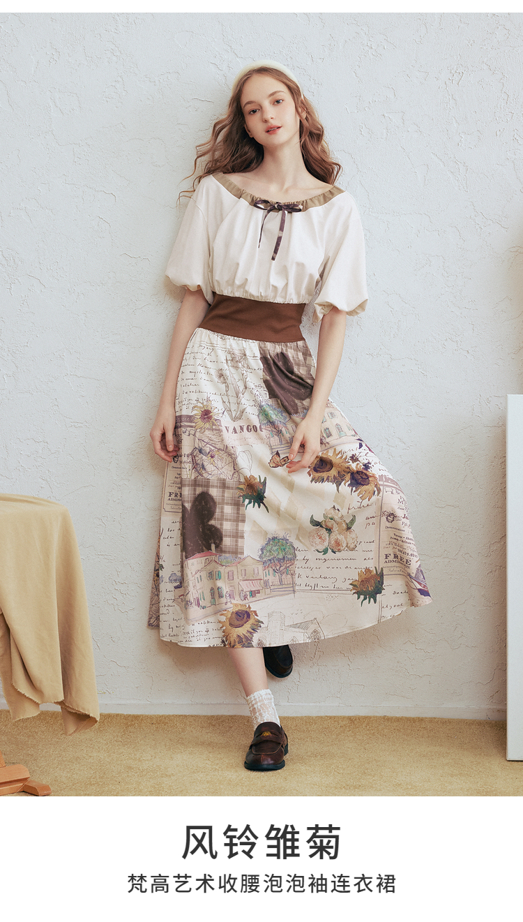 两三事梵高文艺风铃雏菊2026春新款复古印花拼接收腰泡泡袖连衣裙