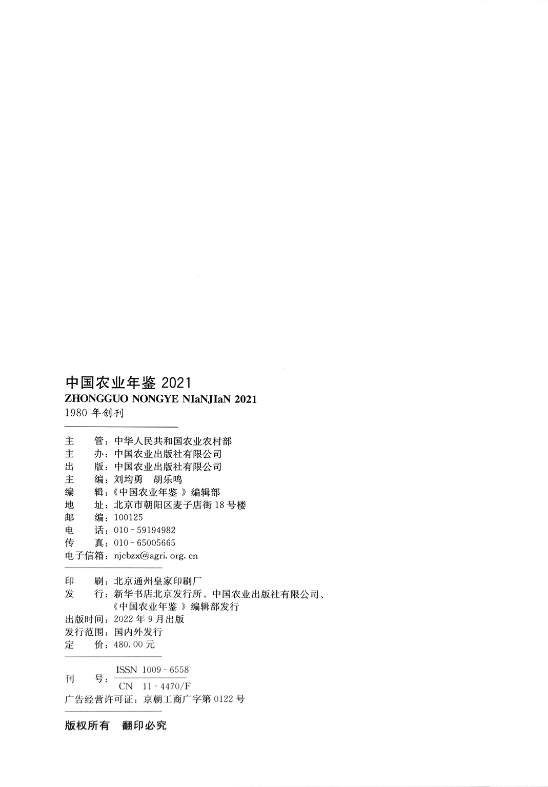 中国农业年鉴2021 1009-6558(2021)