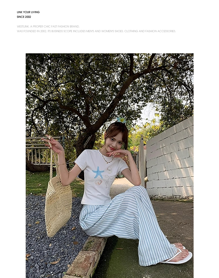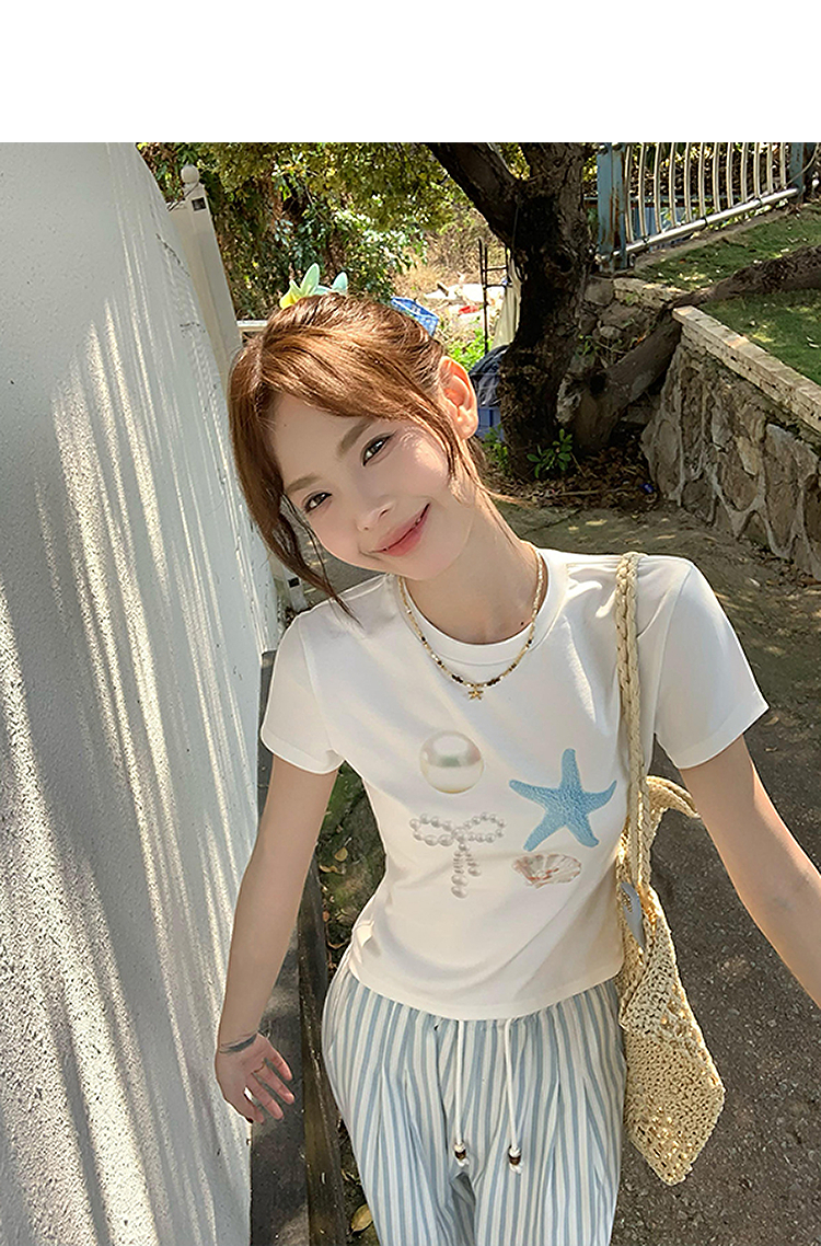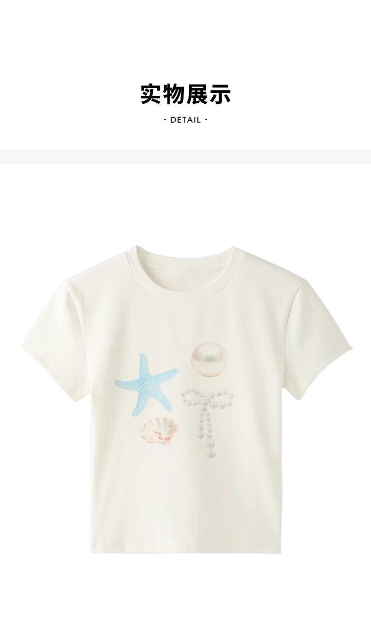 西遇度假风海星贝壳印花短袖T恤女2026夏季新款修身显瘦百搭上衣SS060258