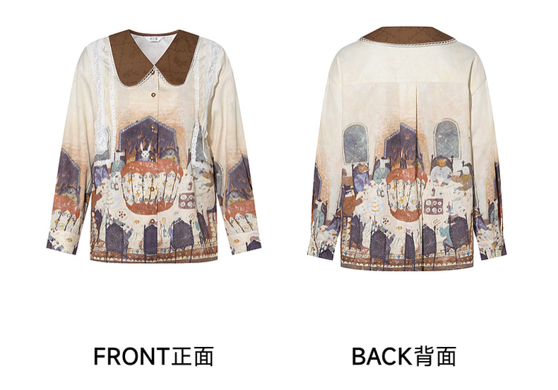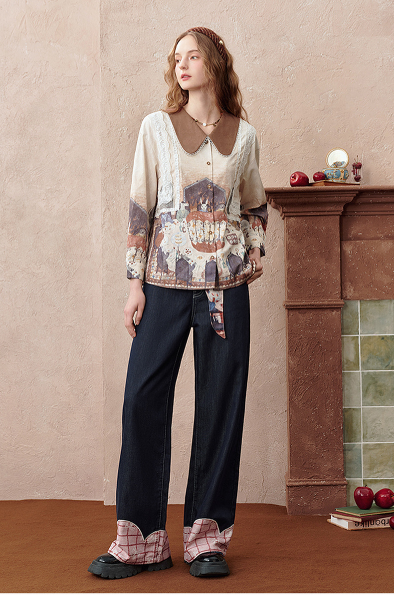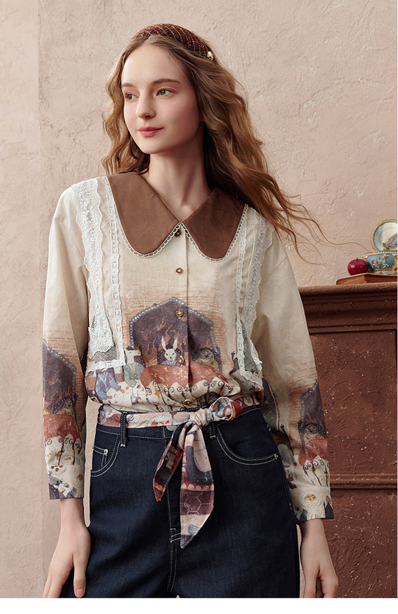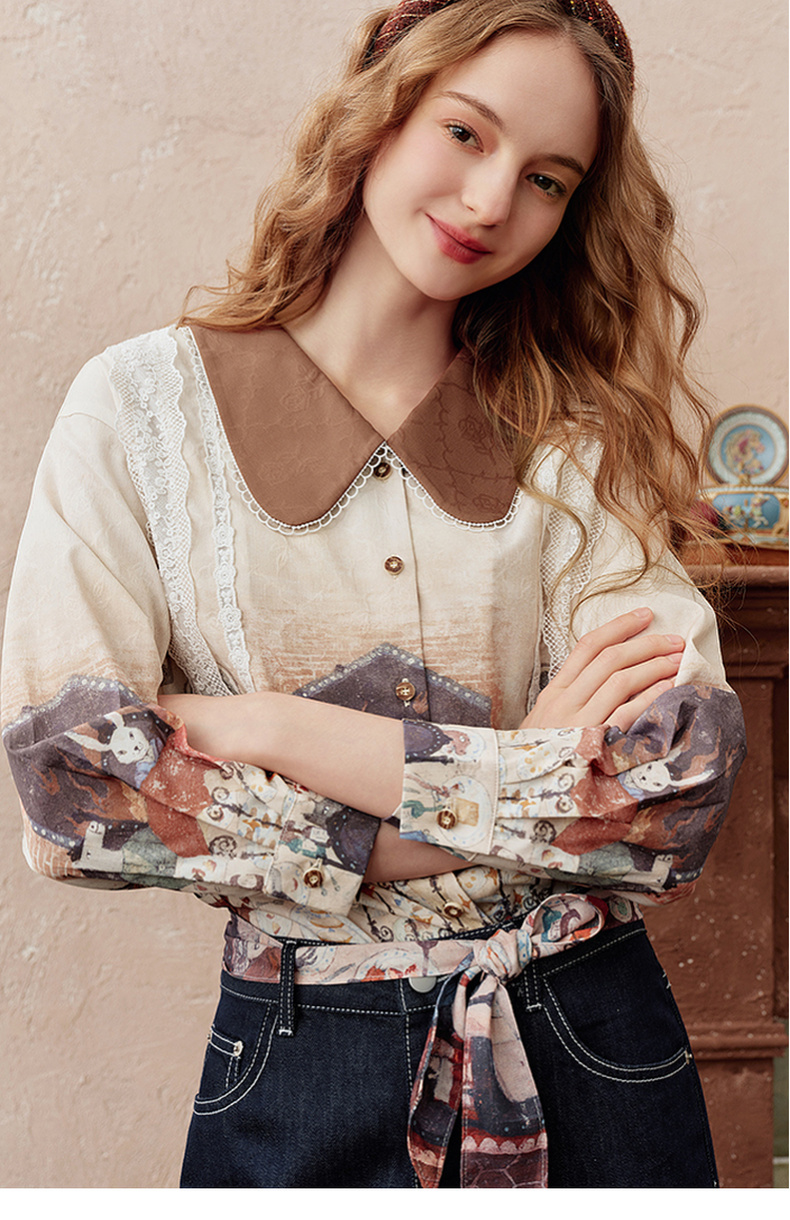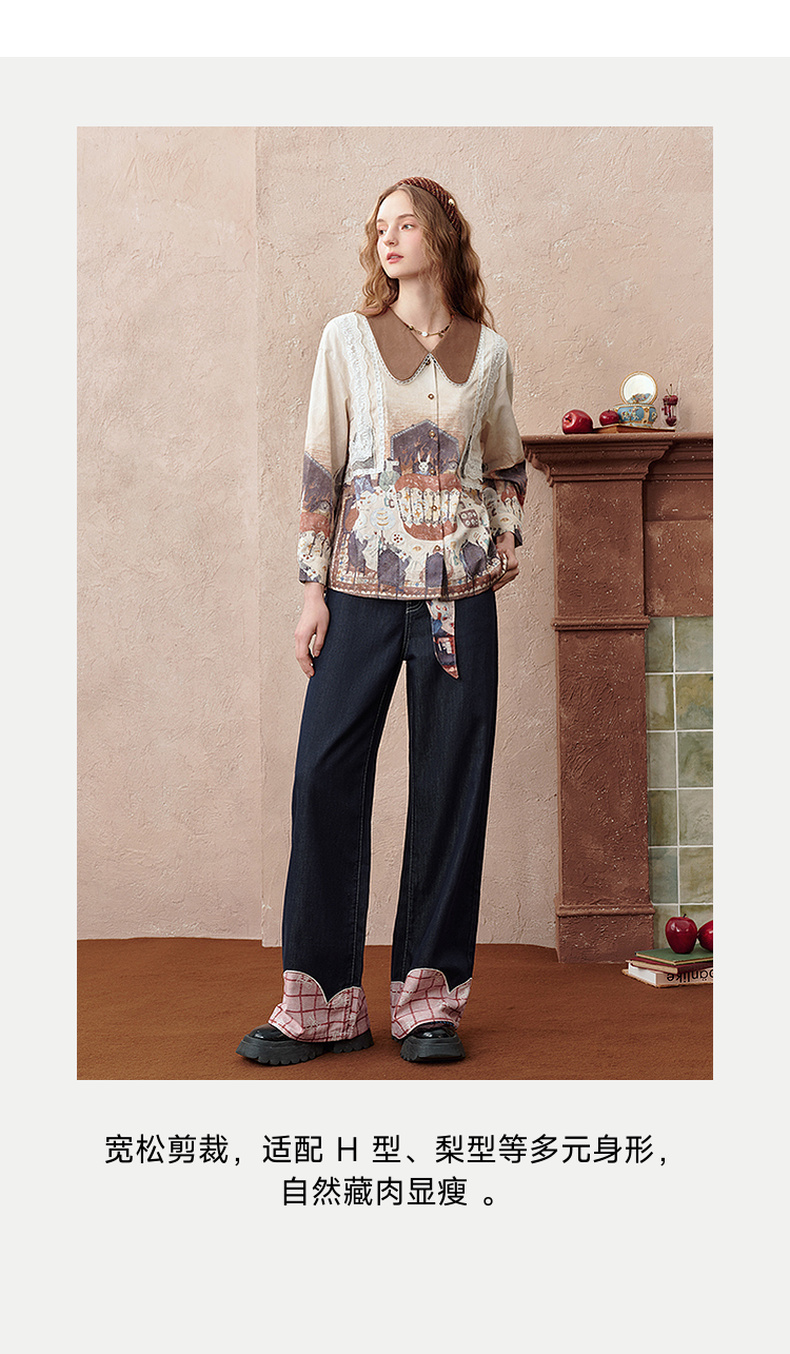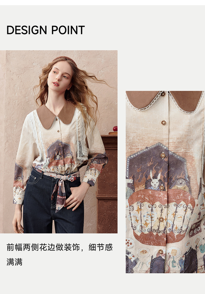两三事童话酒会2025秋季新款复古拼色翻领花边印花长袖衬衫女宽松
