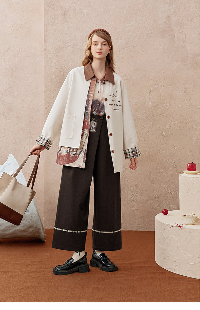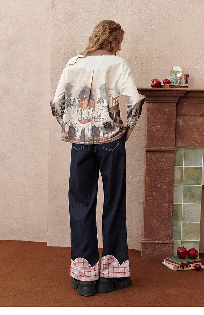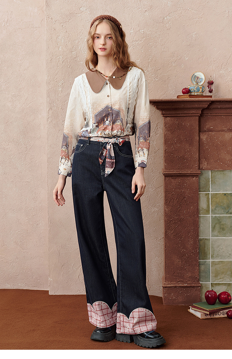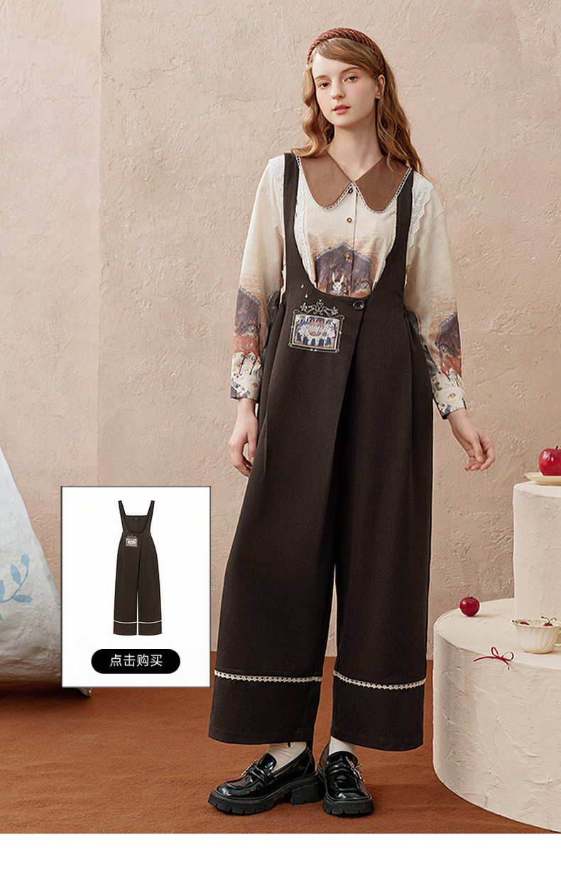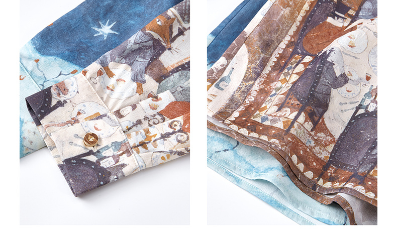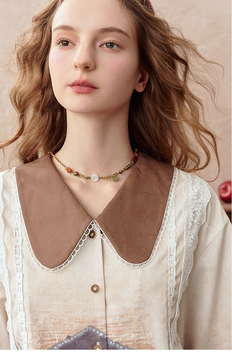 两三事童话酒会2025秋季新款复古拼色翻领花边印花长袖衬衫女宽松