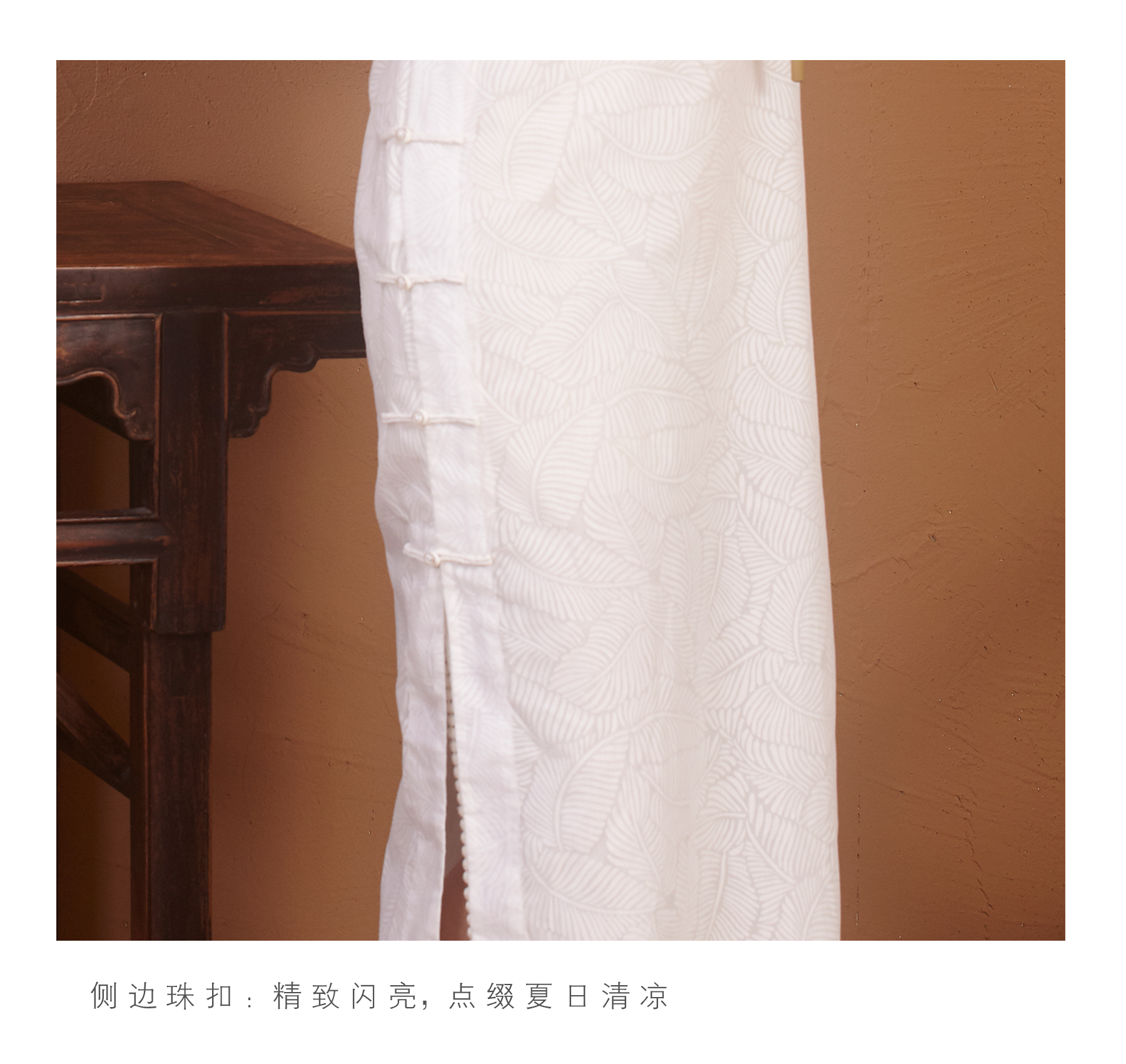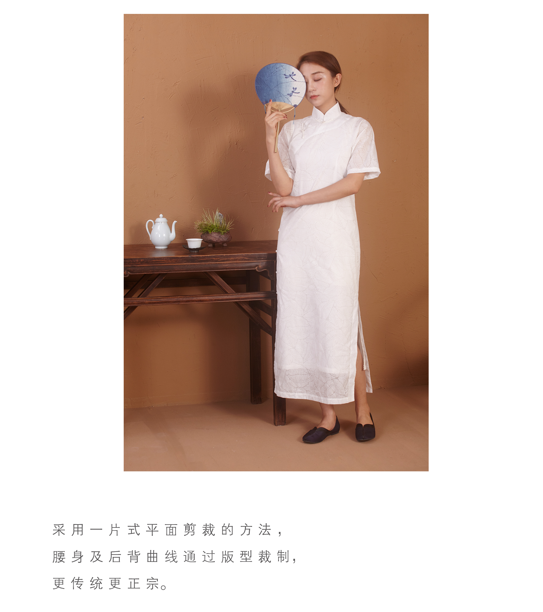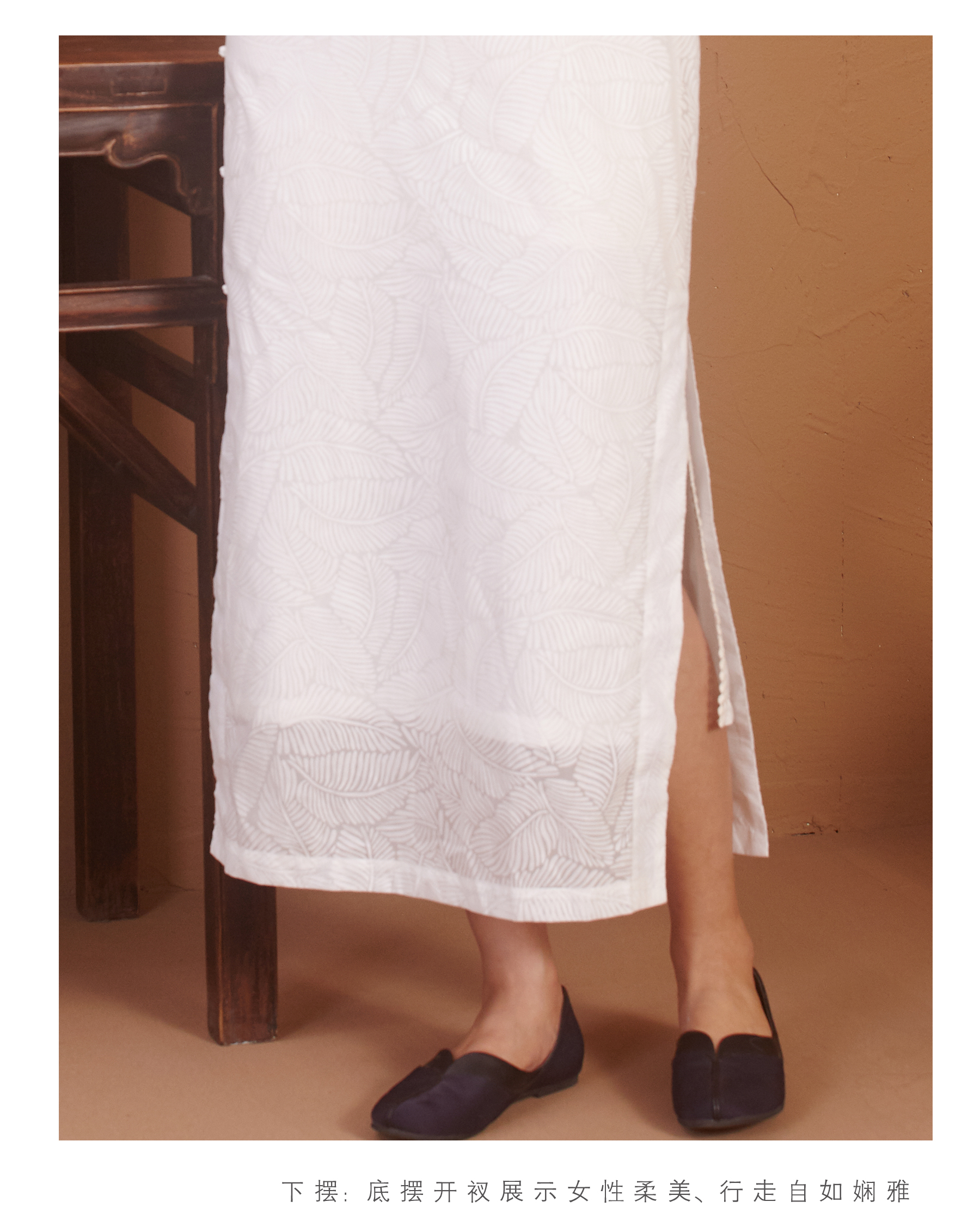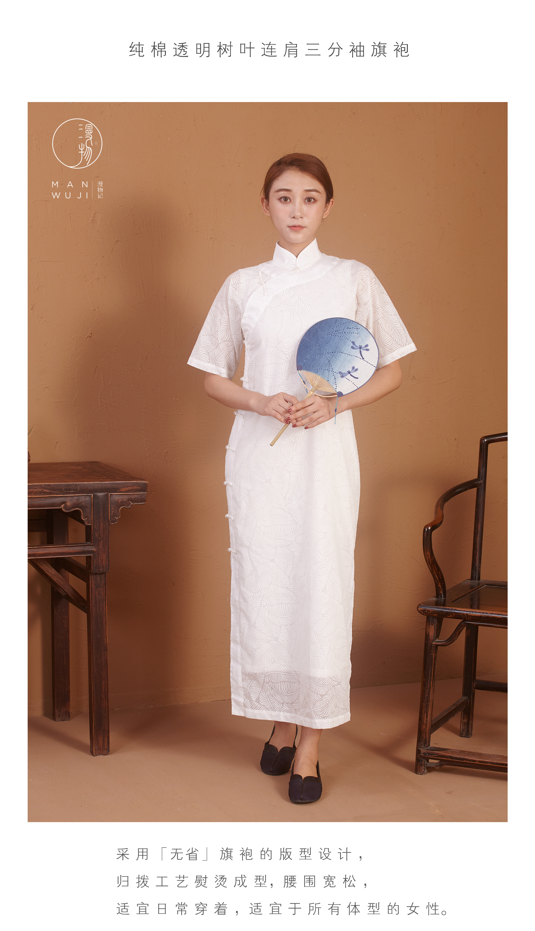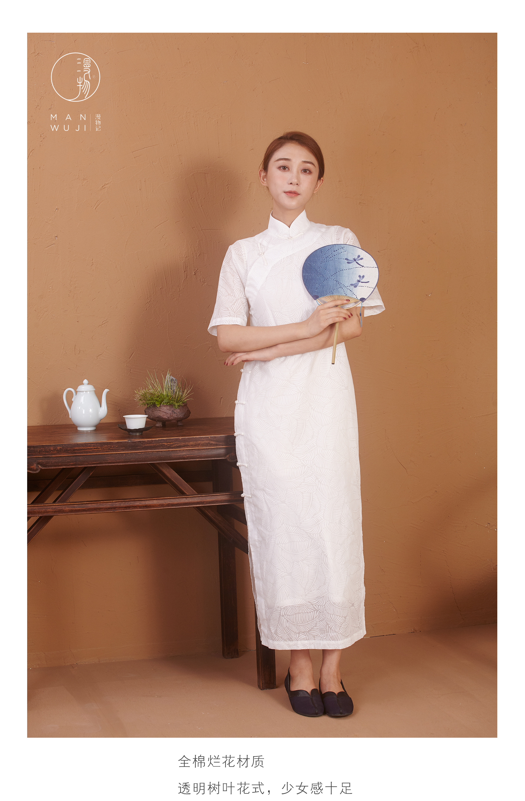 【漫物记】烂花棉连肩三分袖白色树叶纹旗袍(不含内搭)