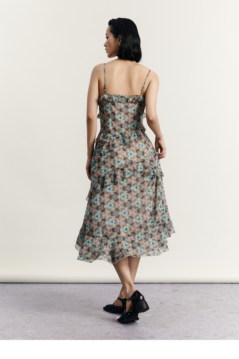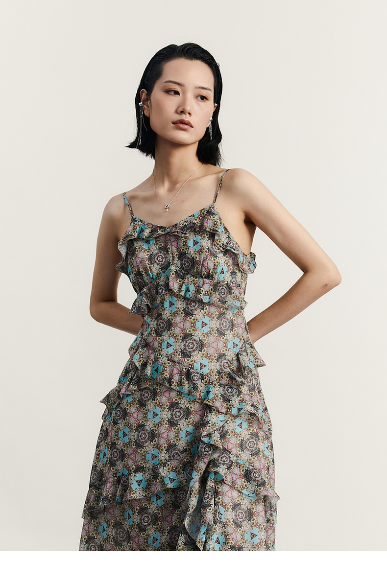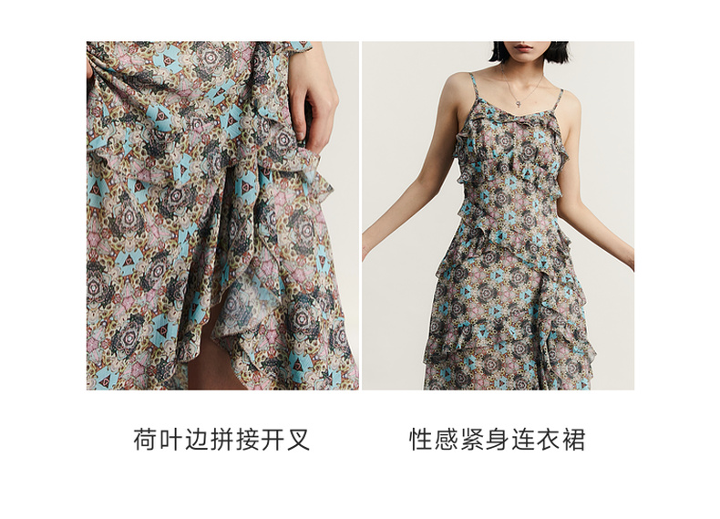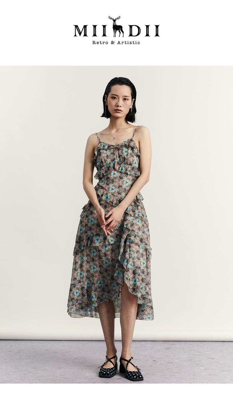 谜底吊带花色连衣裙2023秋季新款浪漫感碎花裙中长裙女233ML1006