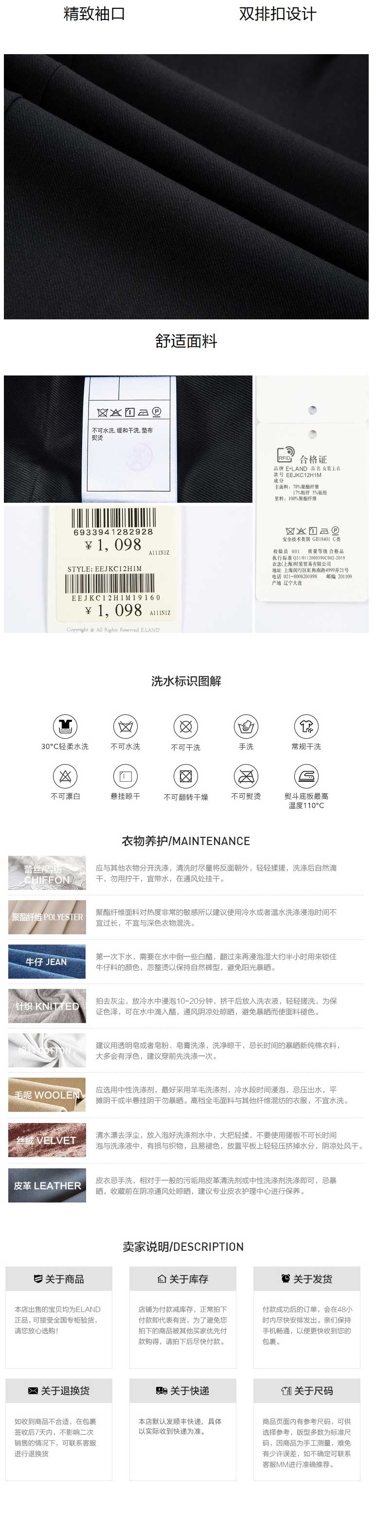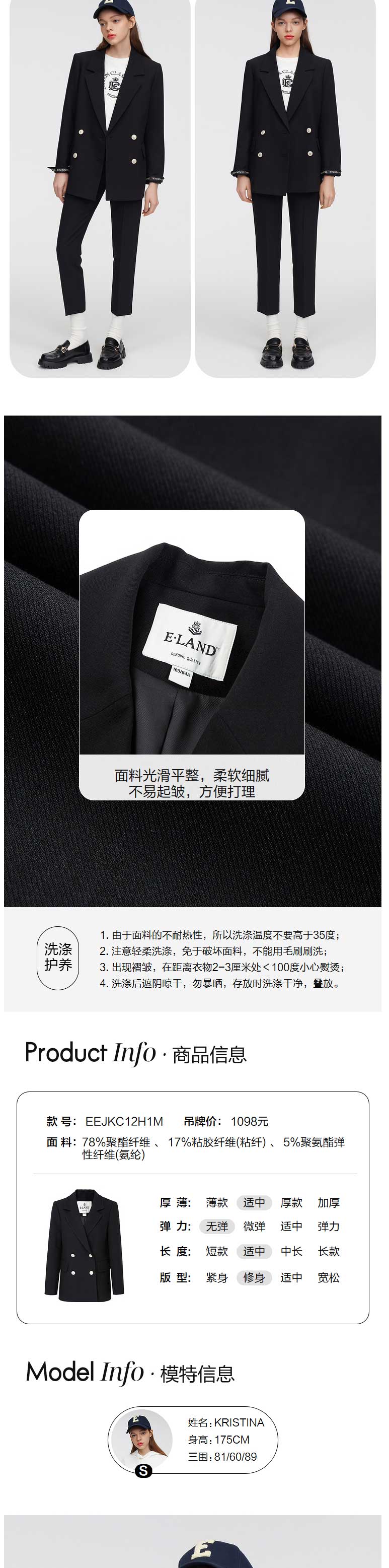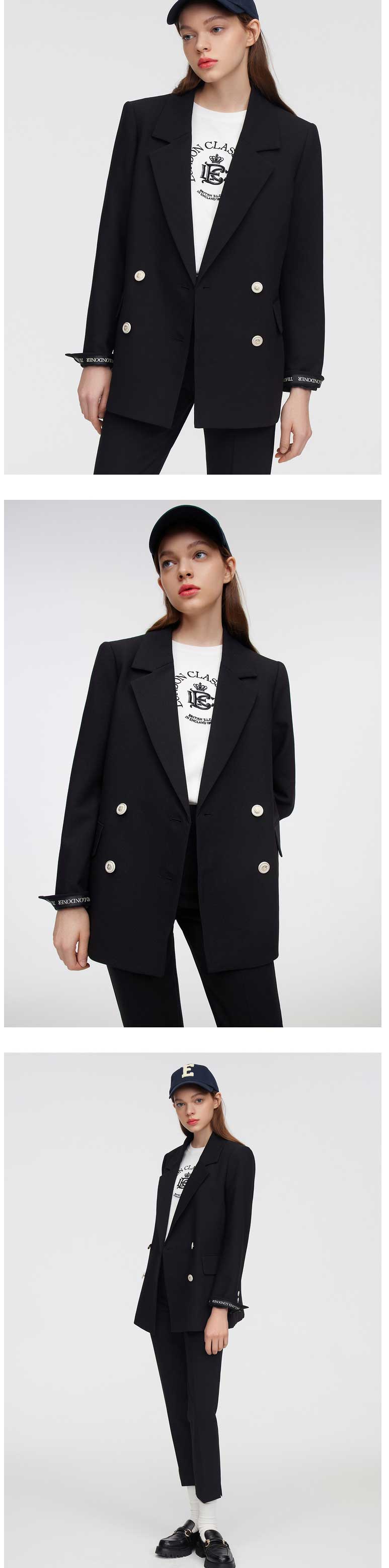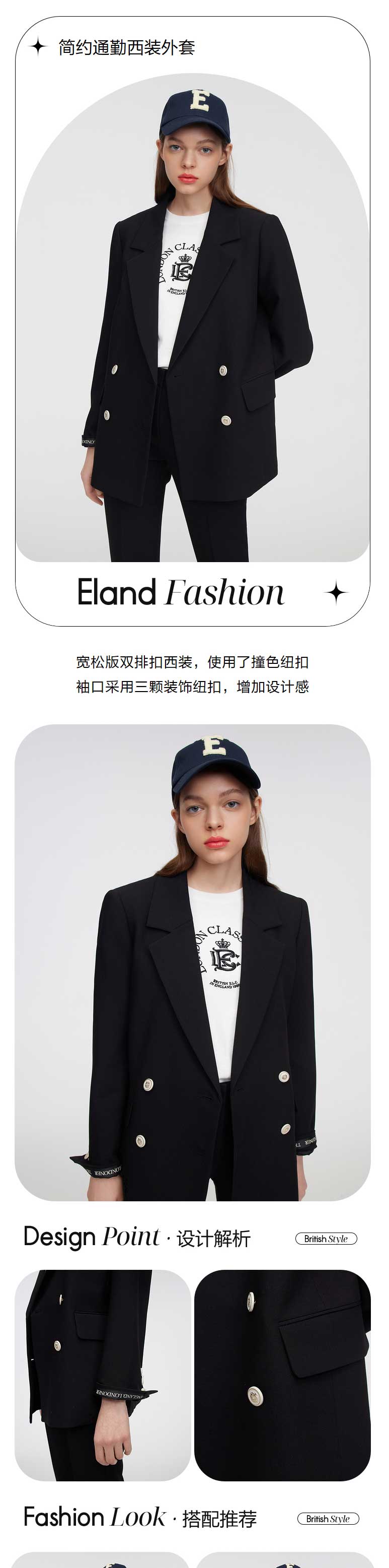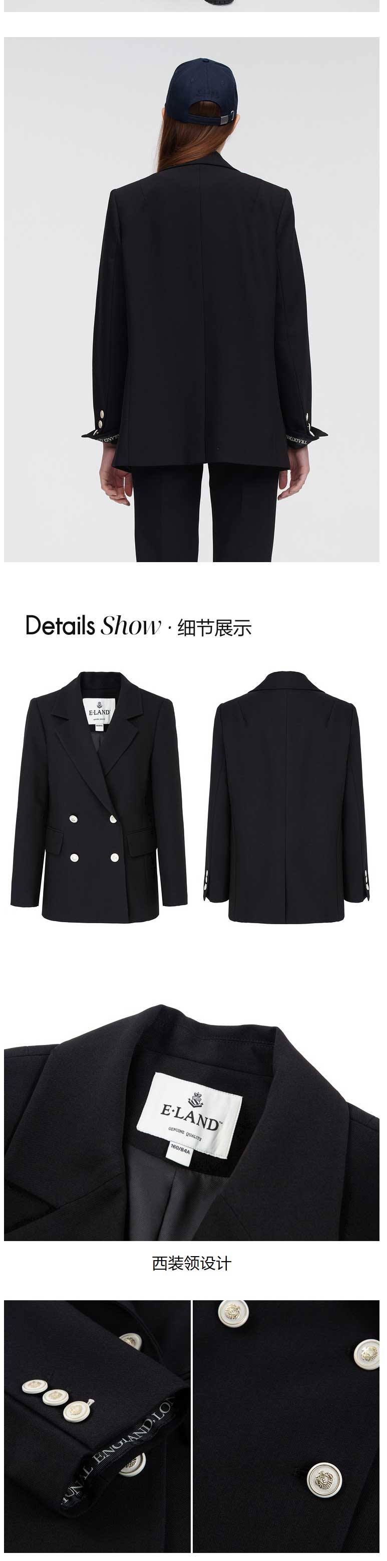 ELAND衣恋2022年春季新款简约设计感黑色双排扣西装领小西装女EEJKC12H1M