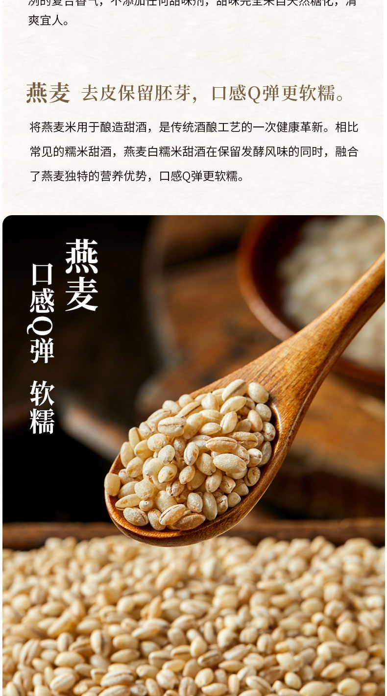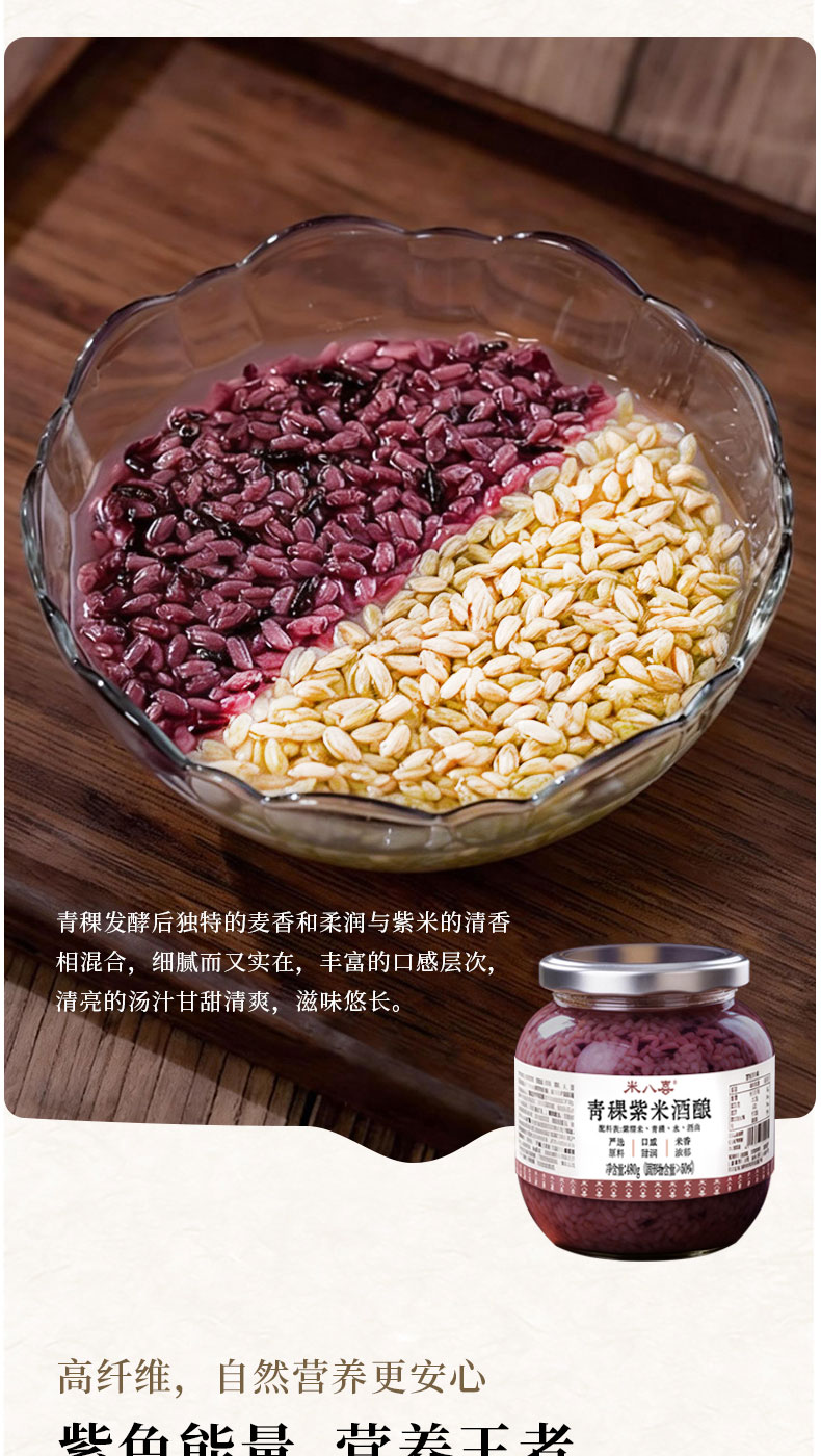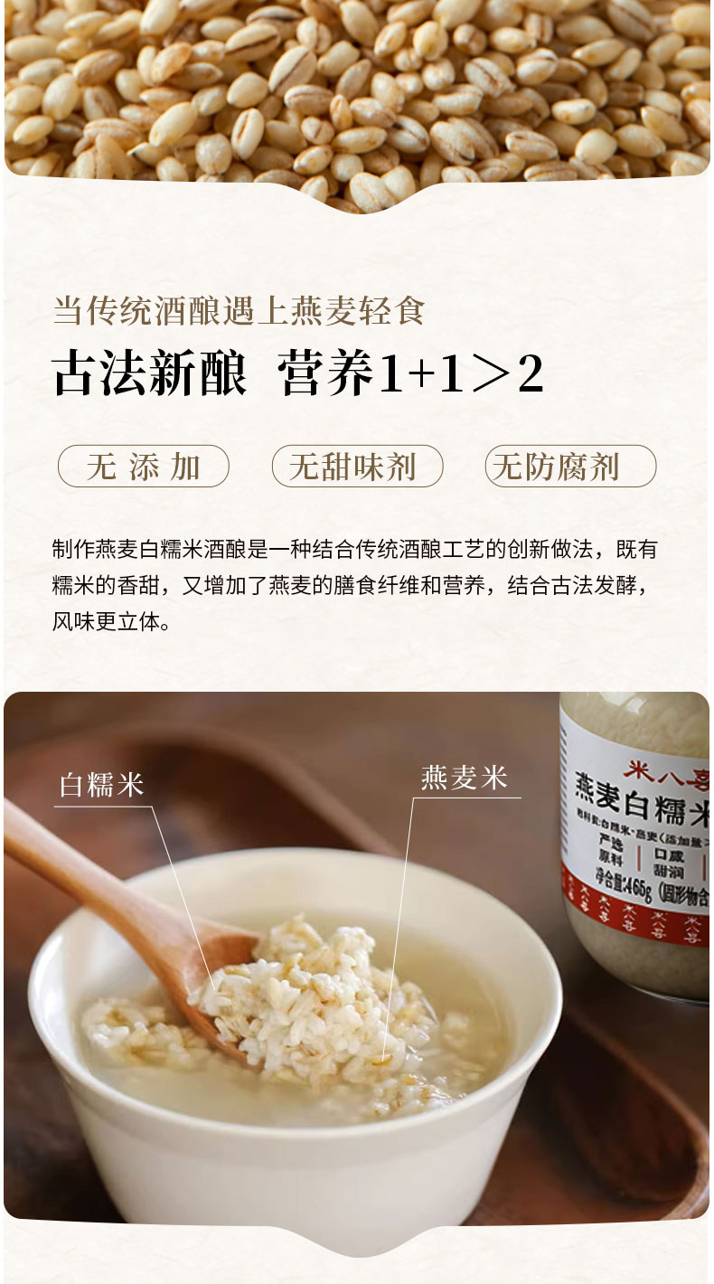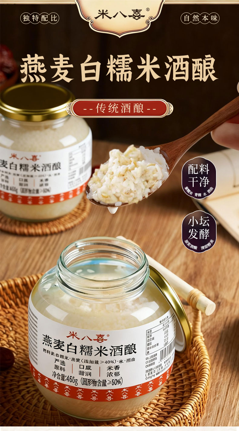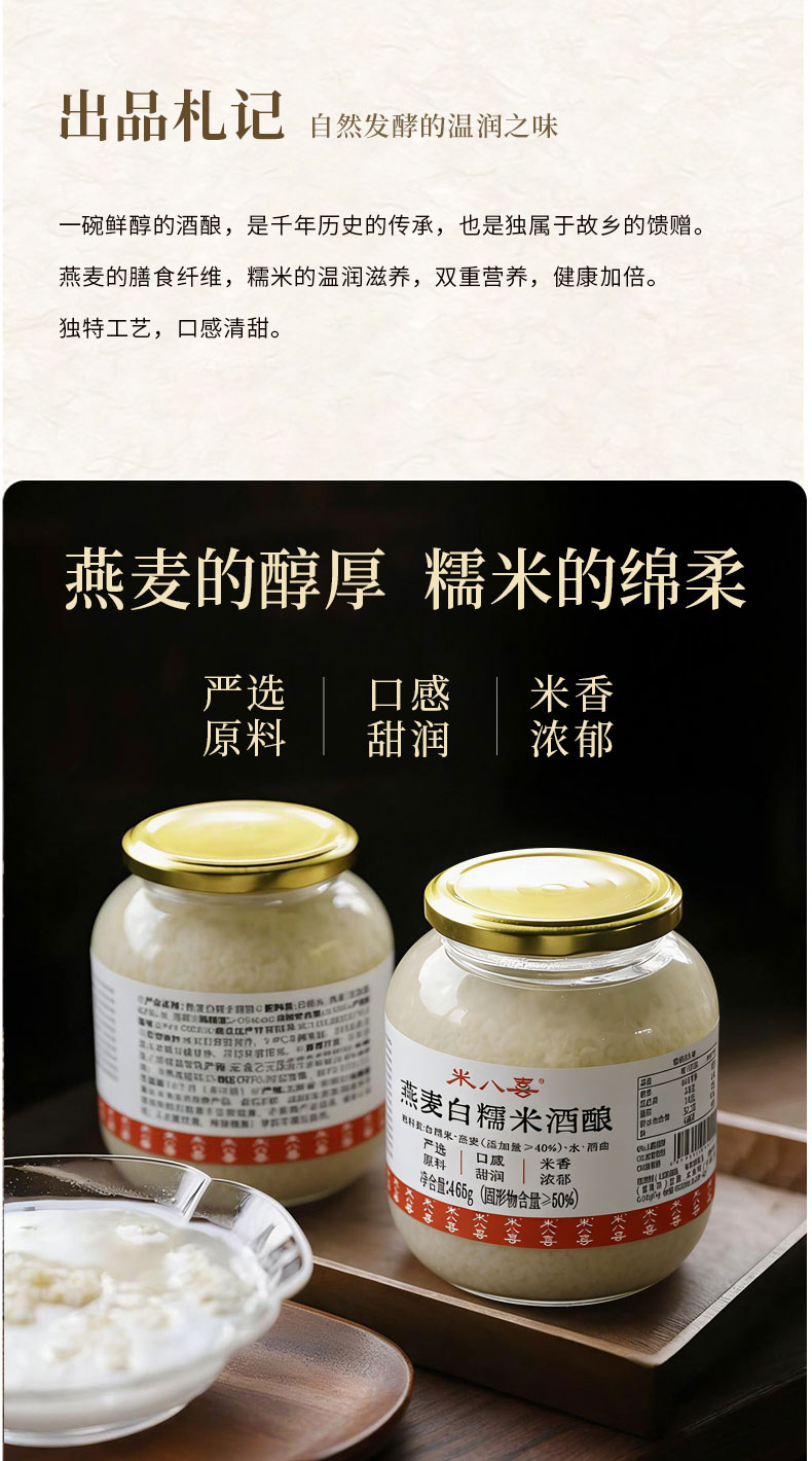 【规格】 SKU1:燕麦白糯米酒酿465g*2罐 SKU2:青稞紫米酒酿480g*2罐 SKU3:燕麦白糯米1罐+青稞紫糯米1罐 |