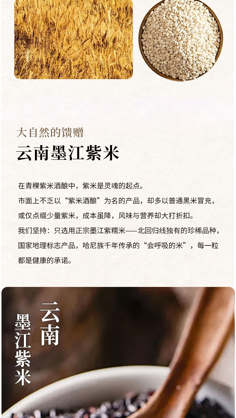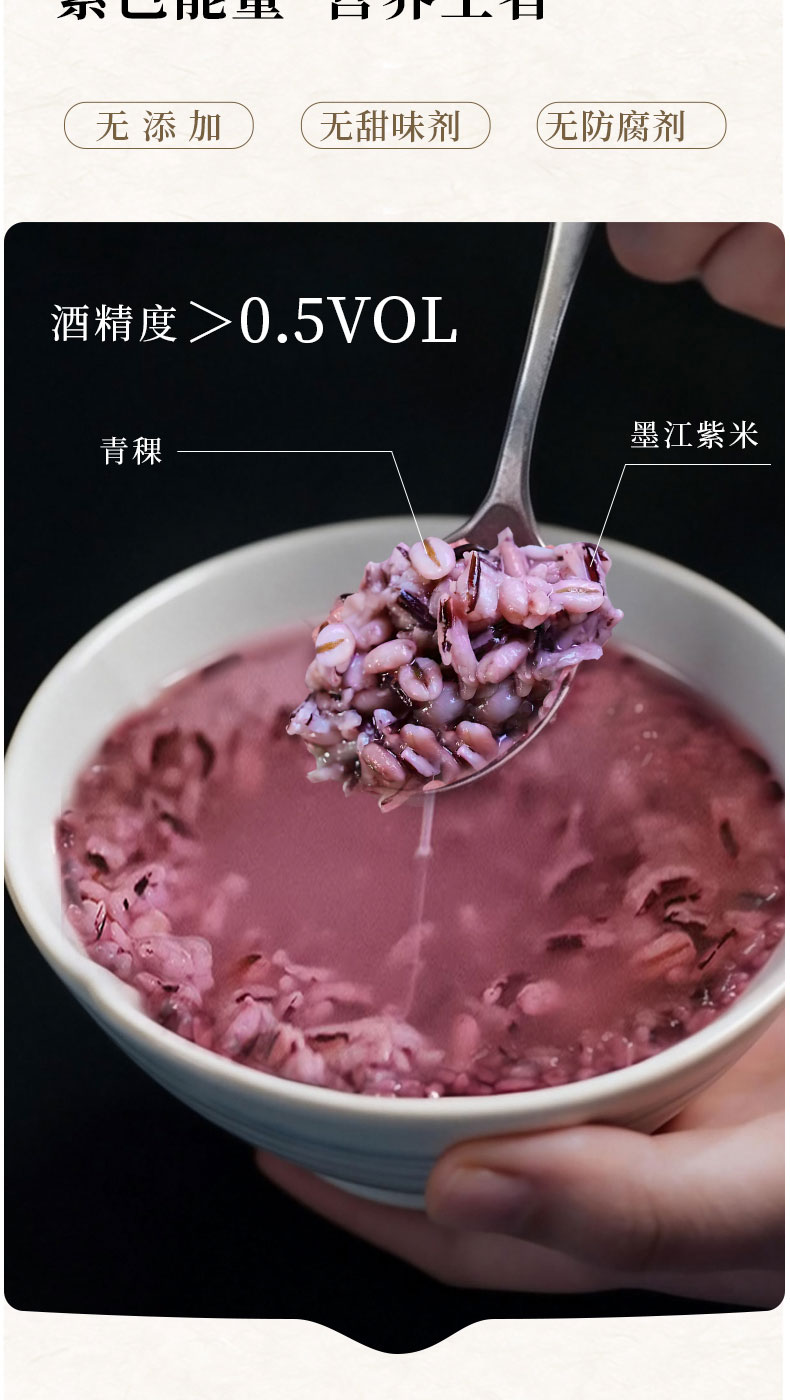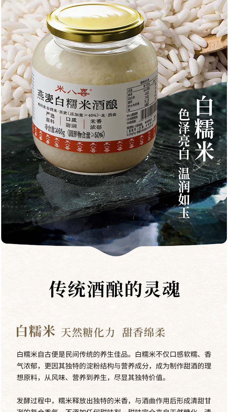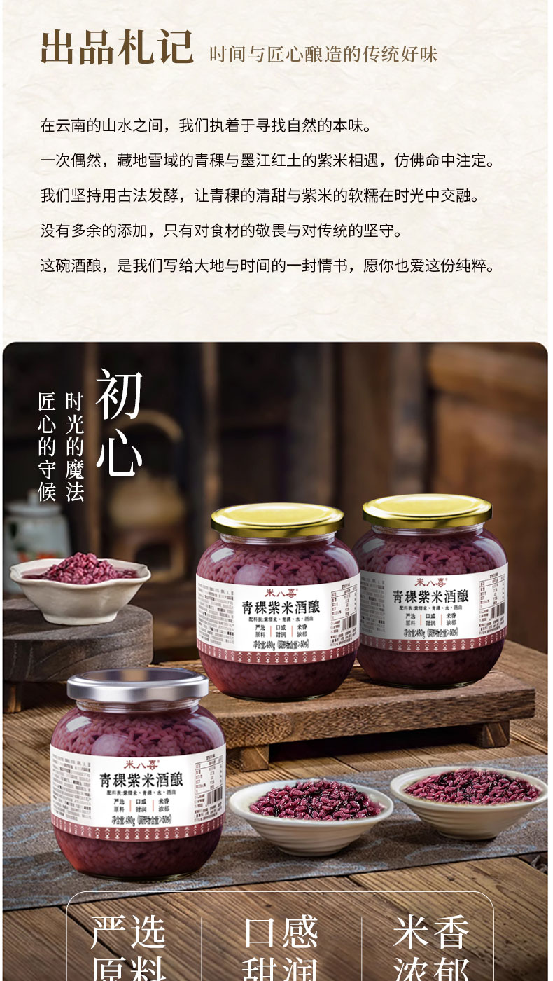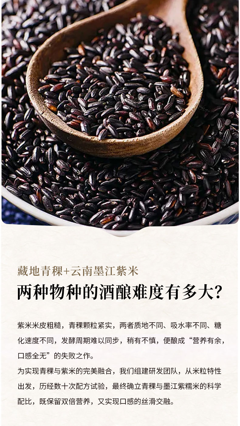 【规格】 SKU1:燕麦白糯米酒酿465g*2罐 SKU2:青稞紫米酒酿480g*2罐 SKU3:燕麦白糯米1罐+青稞紫糯米1罐 |