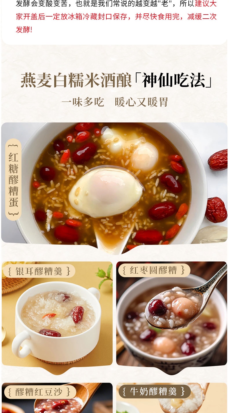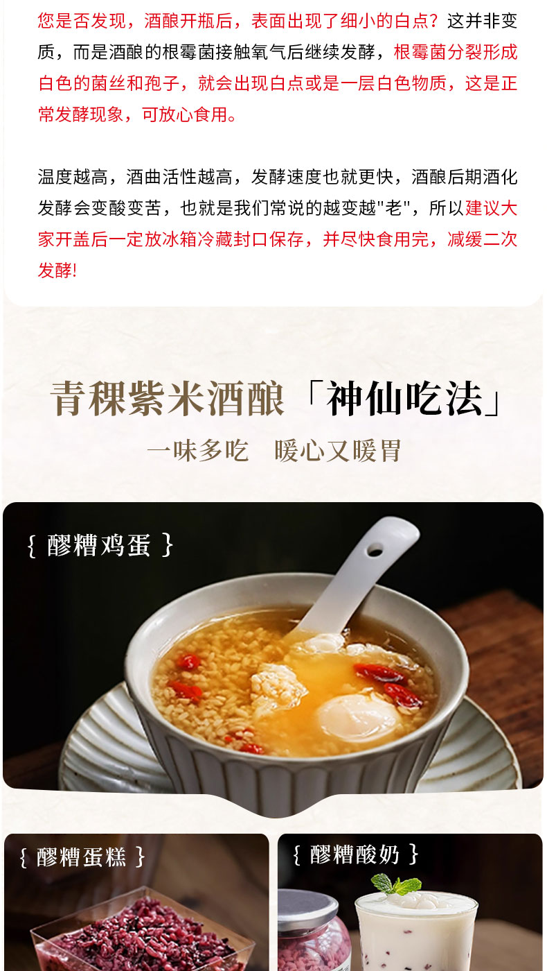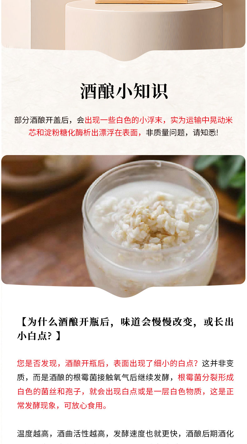 【温馨提示】 1、部分酒酿开盖后,会出现一些白色的小浮末,实为运输中晃动米芯和淀粉糖化酶析出漂浮再表面,非质量问题。 2、冷藏保存,开封尽快食用完成,避免二次发酵变酸苦,期间封口冷藏 3、开瓶提示:使用开瓶器打开,或辅助工具撬一下瓶盖,使其漏一点气,再用力拧开即可 4、开盖即食,冷热皆可,煮鸡蛋、汤圆等,或加入冰块、酸奶等一起食用。用于热饮时,不可煮沸,会破坏酒酿营养价值、酒香味挥发。应在快出锅前加入酒酿搅拌即可。 |
